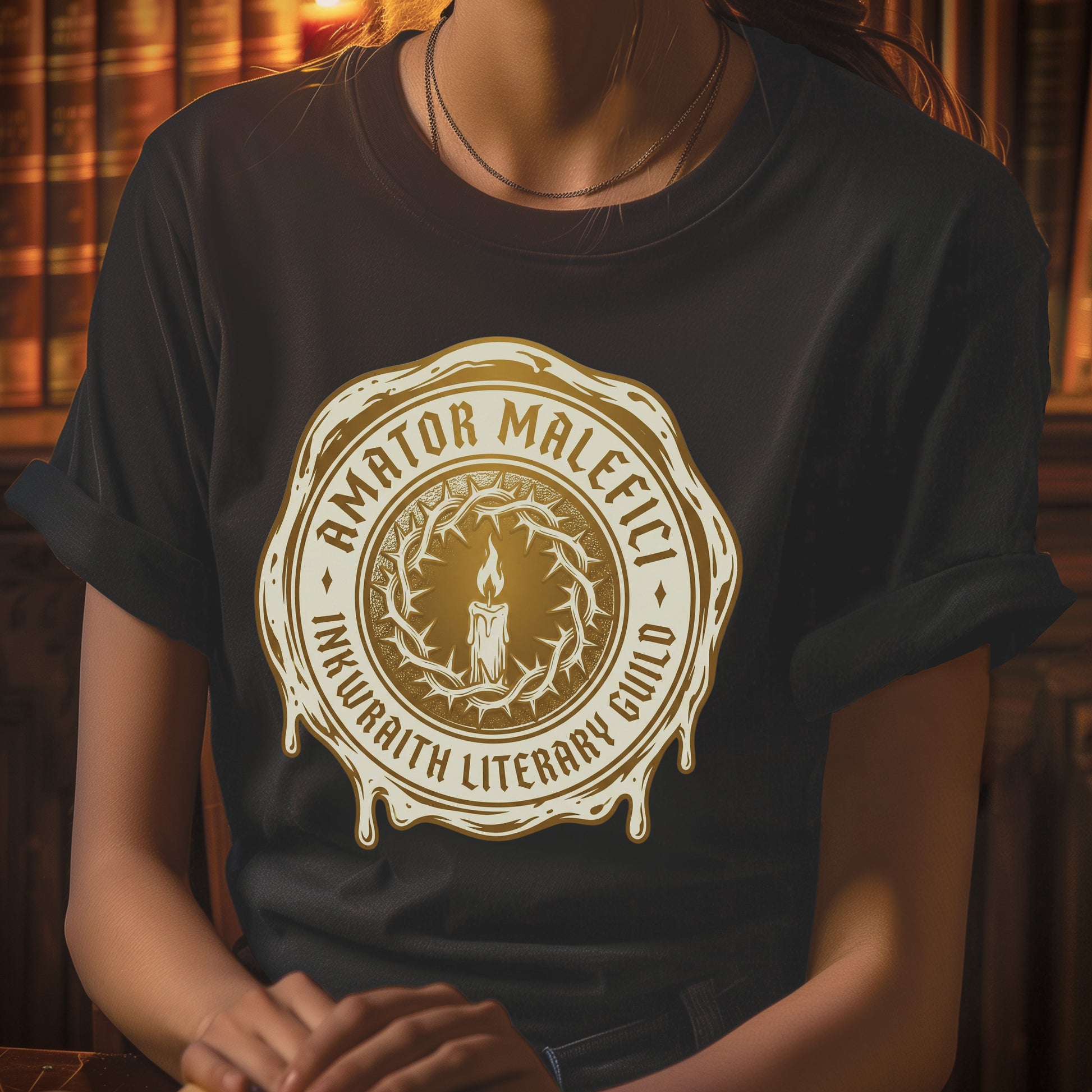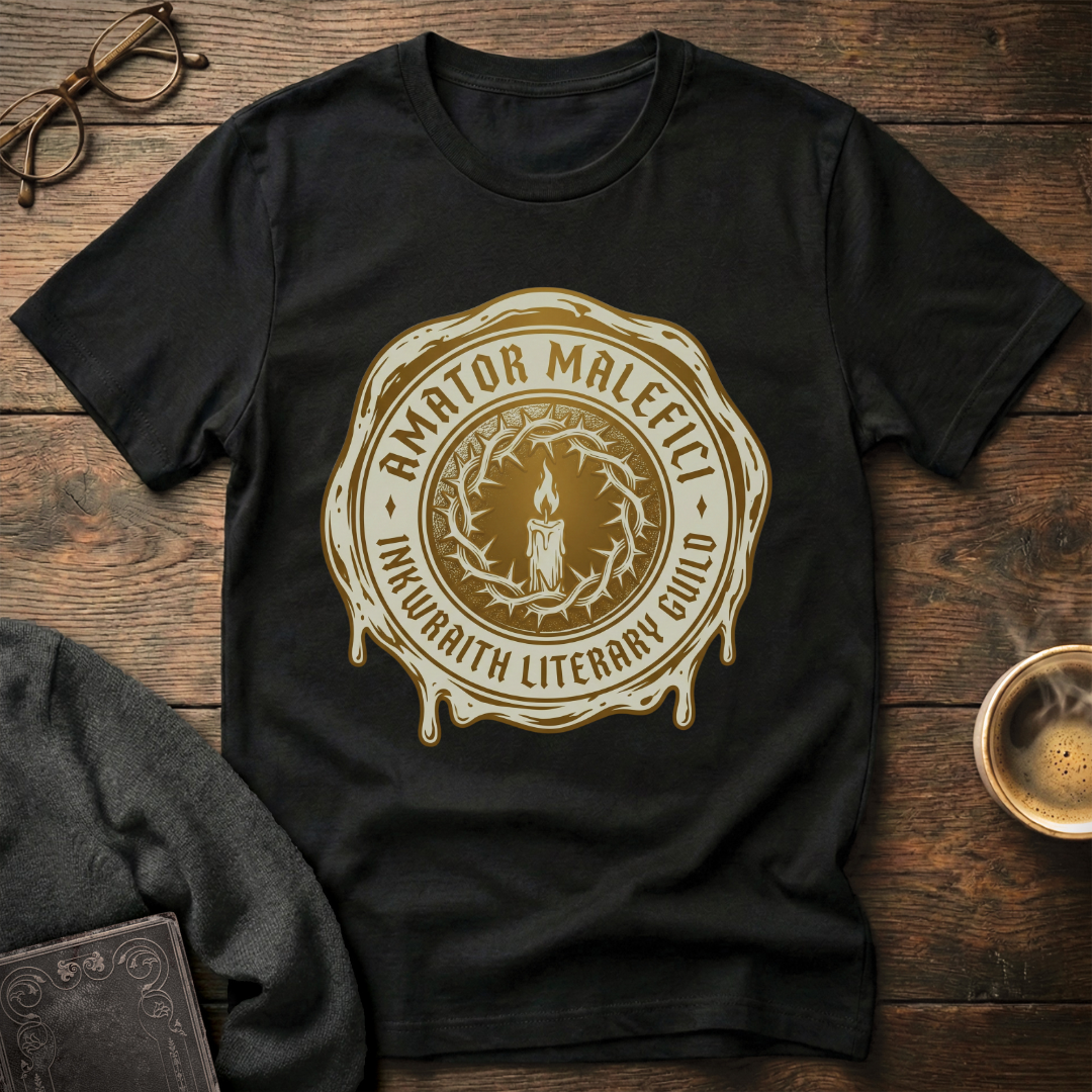 "Amator Malefici" A crown of thorns circles a flickering candle like a ritual caught mid-incantation, wax seal edges melted and irregular as if this mark was pressed in haste, in secret, in the hour when darkness listens closest. Amator Malefici—lover of the wicked—the InkWraith Literary Guild's confession rendered in sharp modern gothic. Dark occult aesthetics meet literary devotion in a seal that feels less like branding and more like binding. This is the mark for those who've never apologized for preferring villains, for loving the morally bankrupt, for finding beauty in what others fear. Printed in bone white and antique gold on dark fabric.