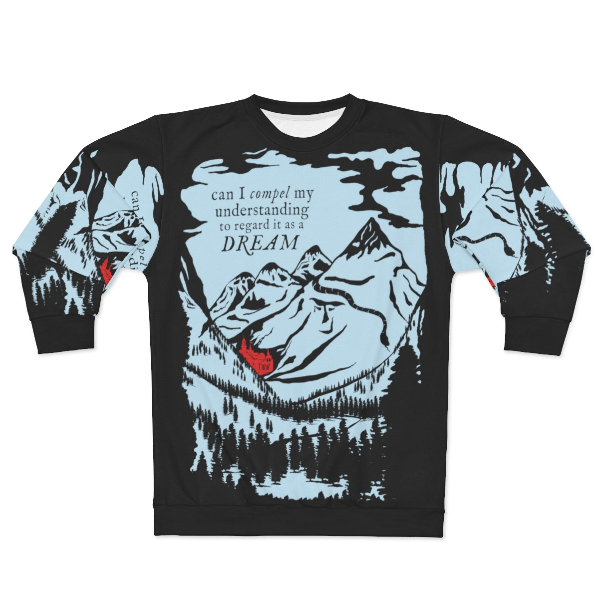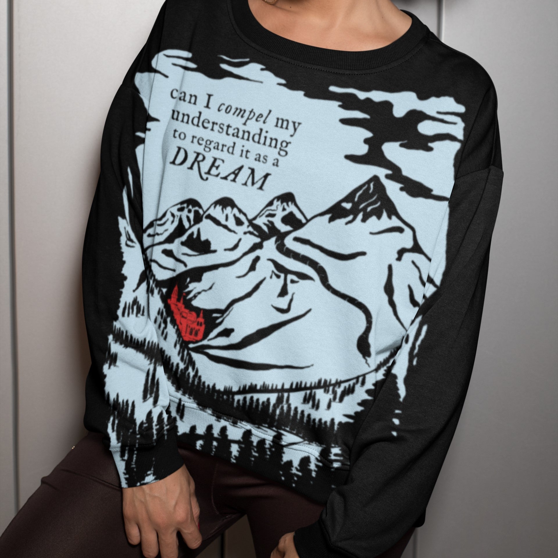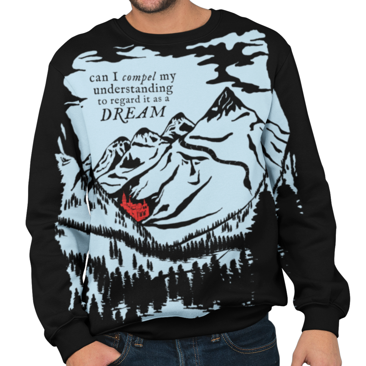 You are convinced that truth is stranger than fiction, but what about science fiction? You can travel to the crimson temples in this Dream Destination Sweatshirt! Featuring a hidden city in the mountains and the phrase "Can I compel my understanding to regard it as a dream?" straight out of A Tale of the Ragged Mountains by Edgar Allan Poe, this crimson on icy blue design was imagined by our in-house artists. You might want to pinch yoursef if you dare to follow this dream.