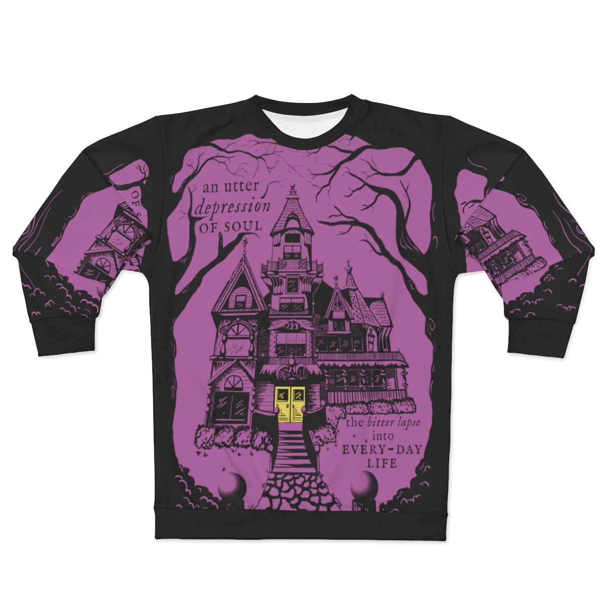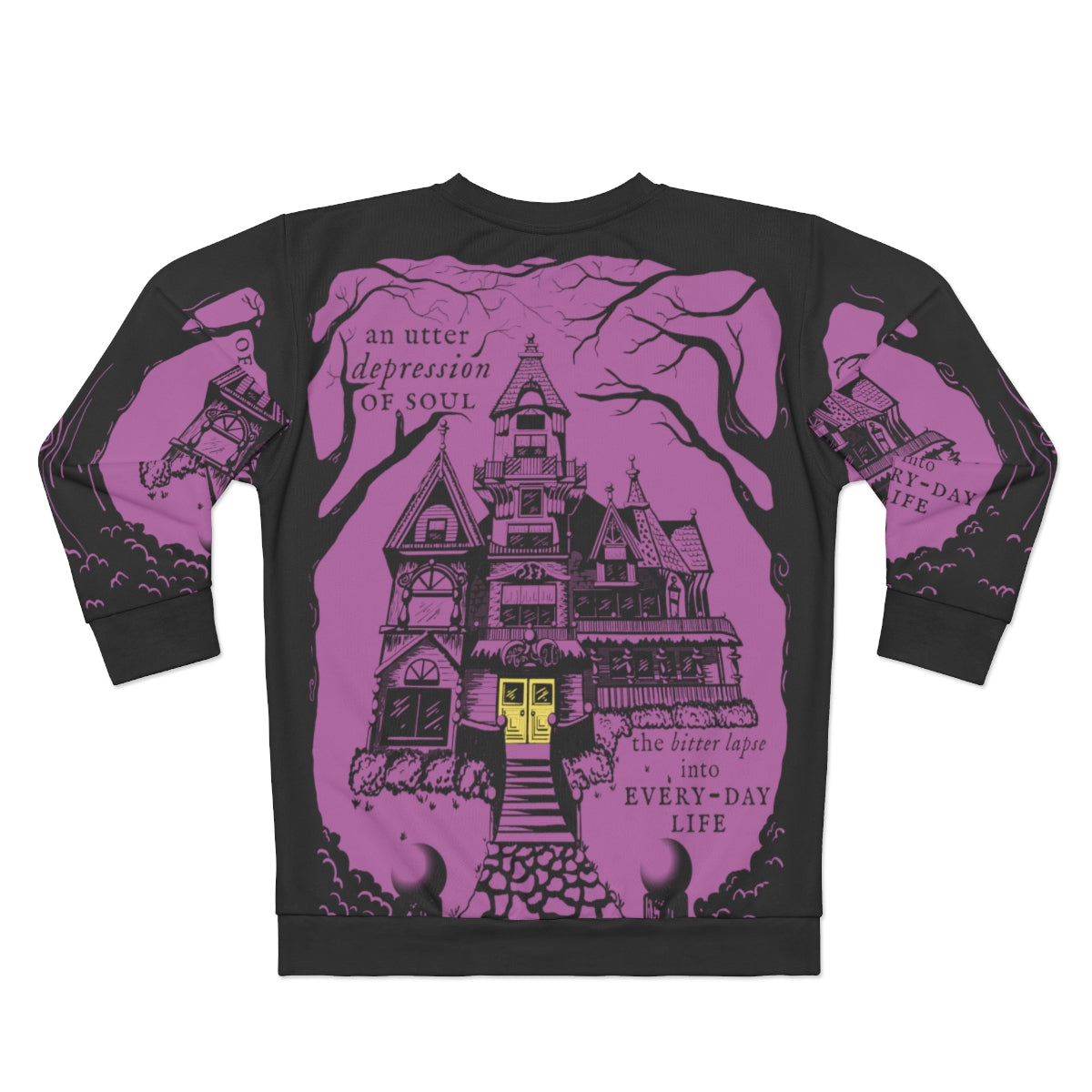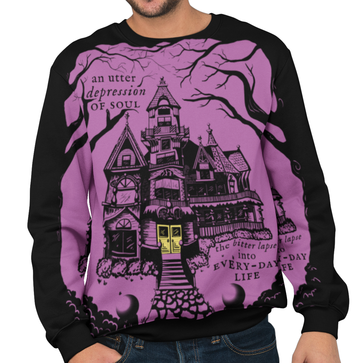 Searching for clues, holding your breath, knowing the jump scare is right around the corner, but you still look calm, cool, and collected wearing the Mystery Mansion AOP Sweatshirt! Featuring a Victorian inspired manor and a gloom and doom phrase from The Fall of the House of Usher by Edgar Allan Poe, this corn on berry design is immortalized by the imagination of our in-house artists. You are invited home by this sweatshirt, but not all summons should be answered.