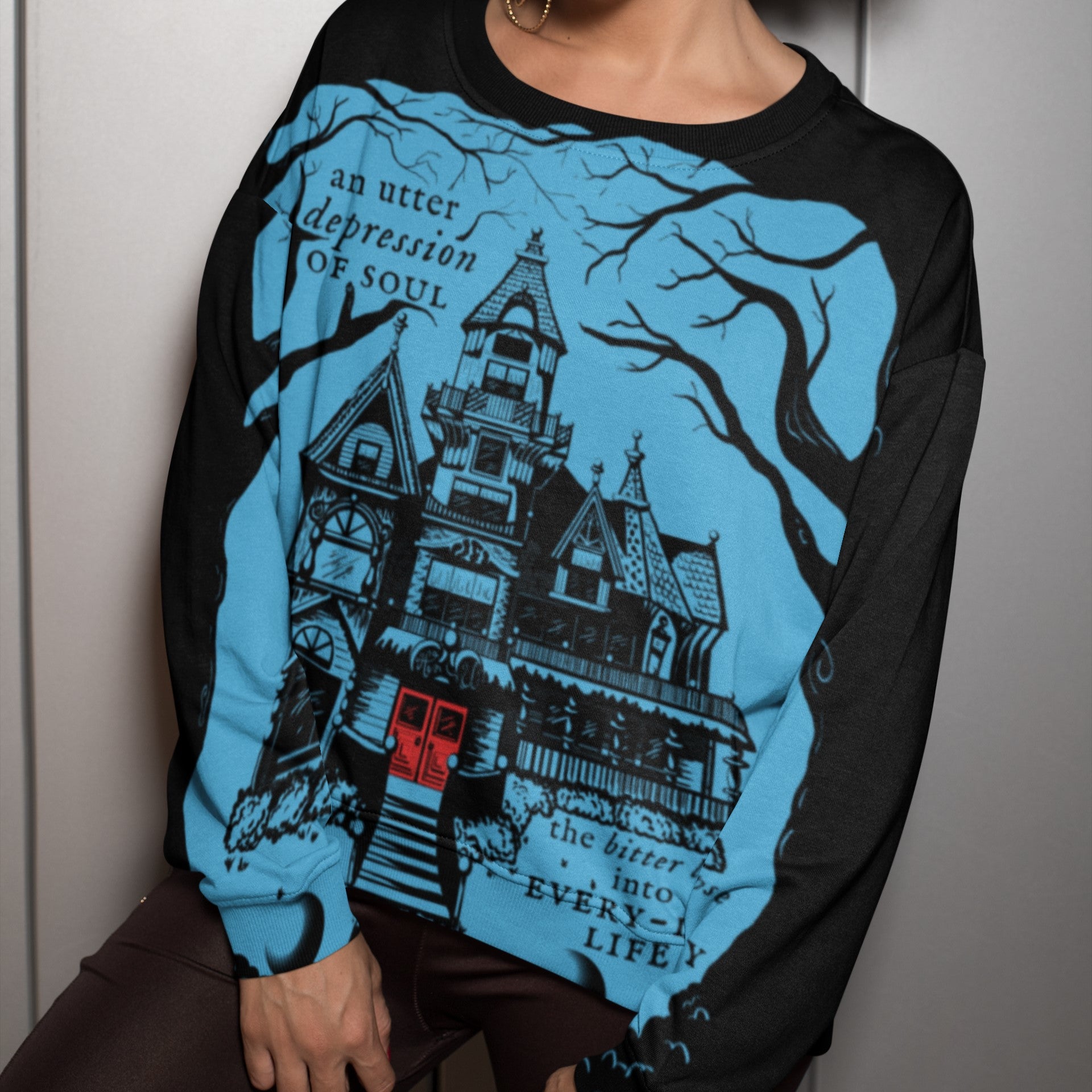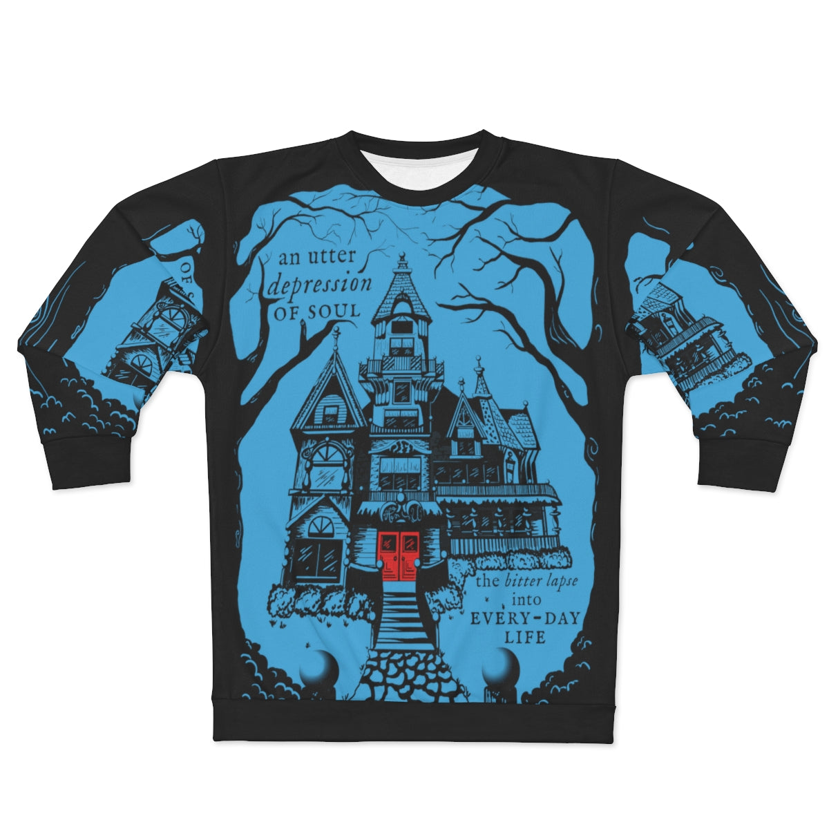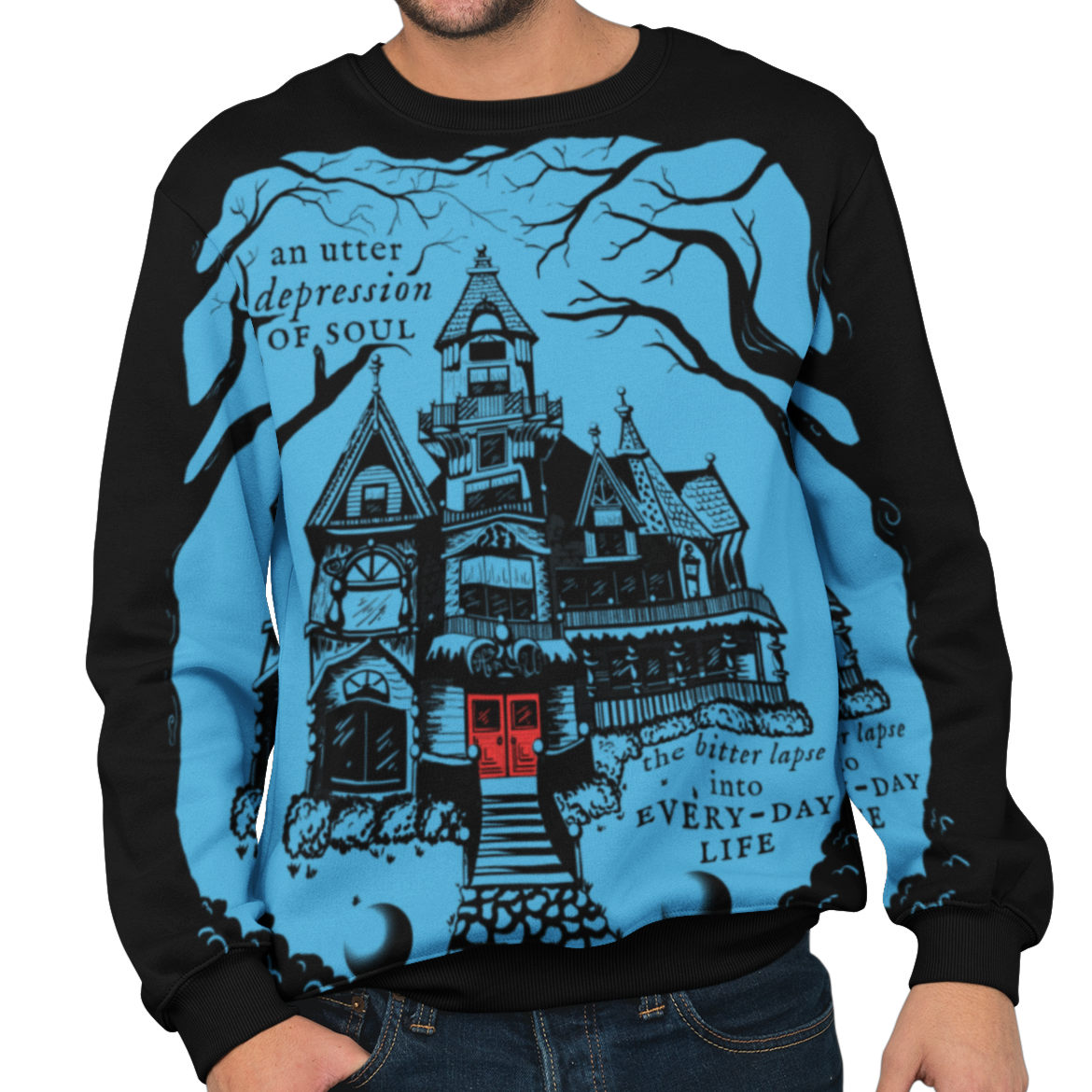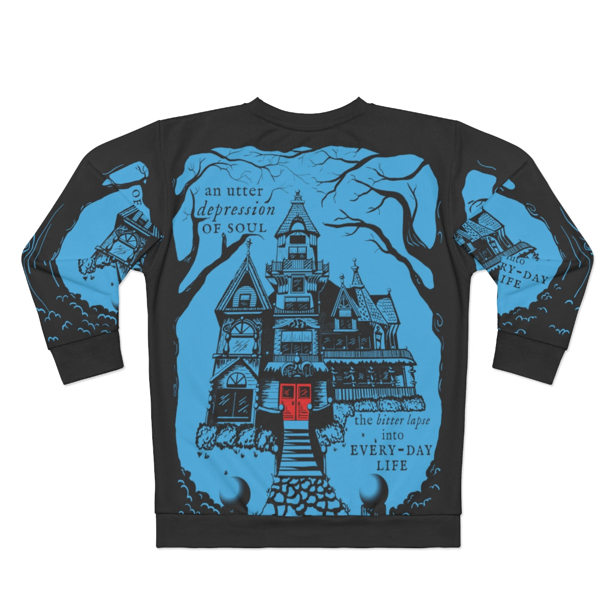 Searching for clues, holding your breath, knowing the jump scare is right around the corner, but you still look calm, cool, and collected wearing the Mystery Mansion AOP Sweatshirt! Featuring a Victorian inspired manor and a gloom and doom phrase from The Fall of the House of Usher by Edgar Allan Poe, this blood red on cyan blue design is immortalized by the imagination of our in-house artists. You are invited home by this sweatshirt, but not all summons should be answered.
