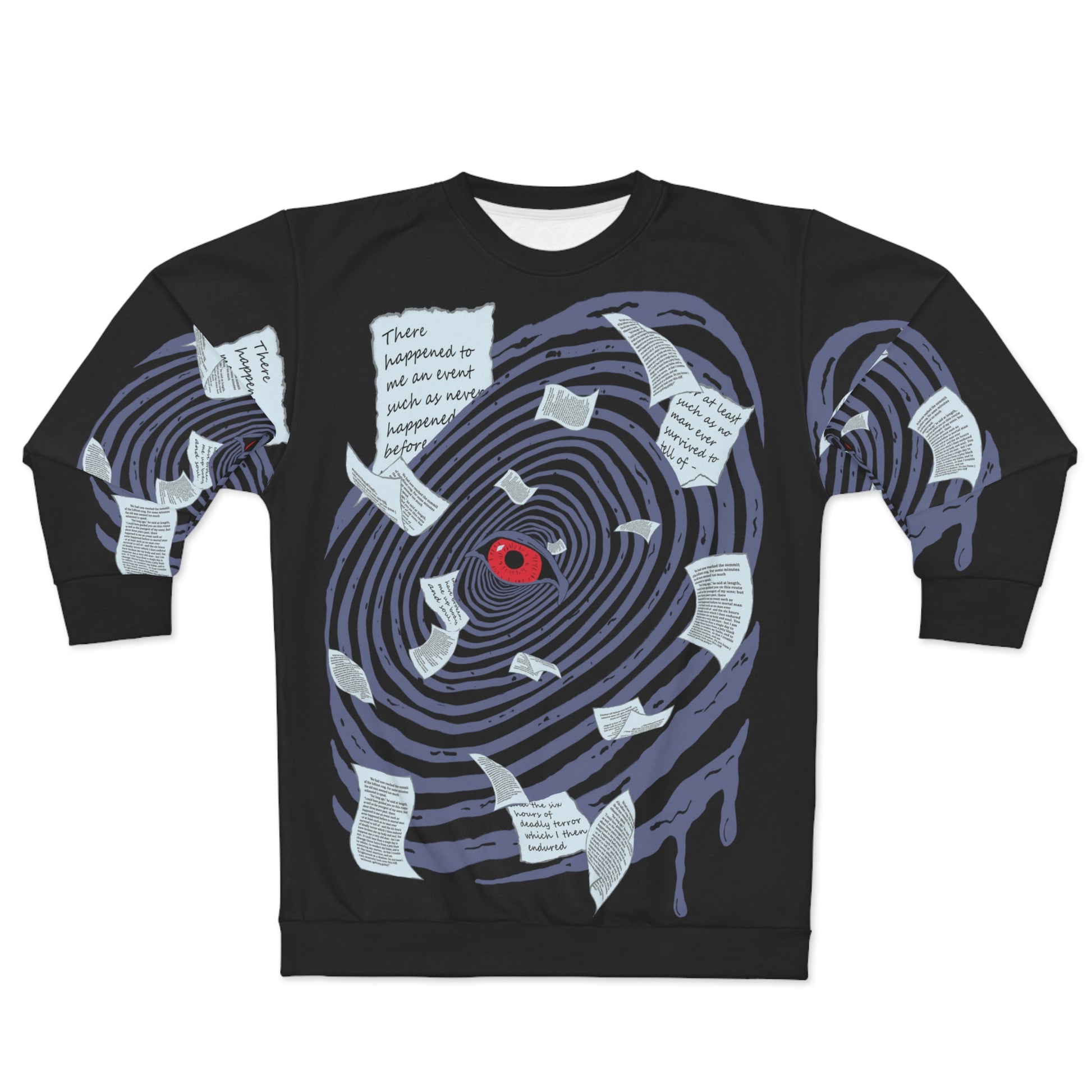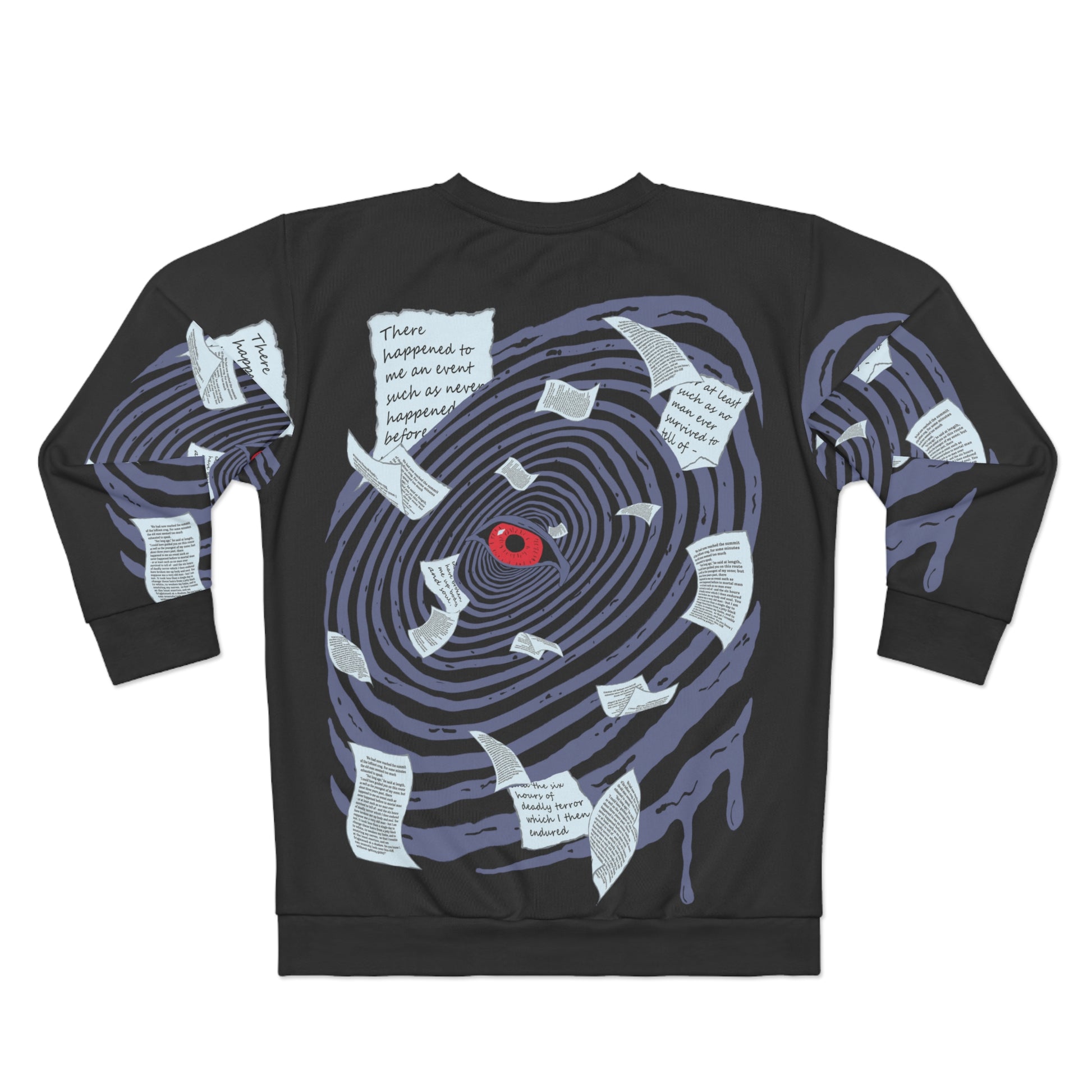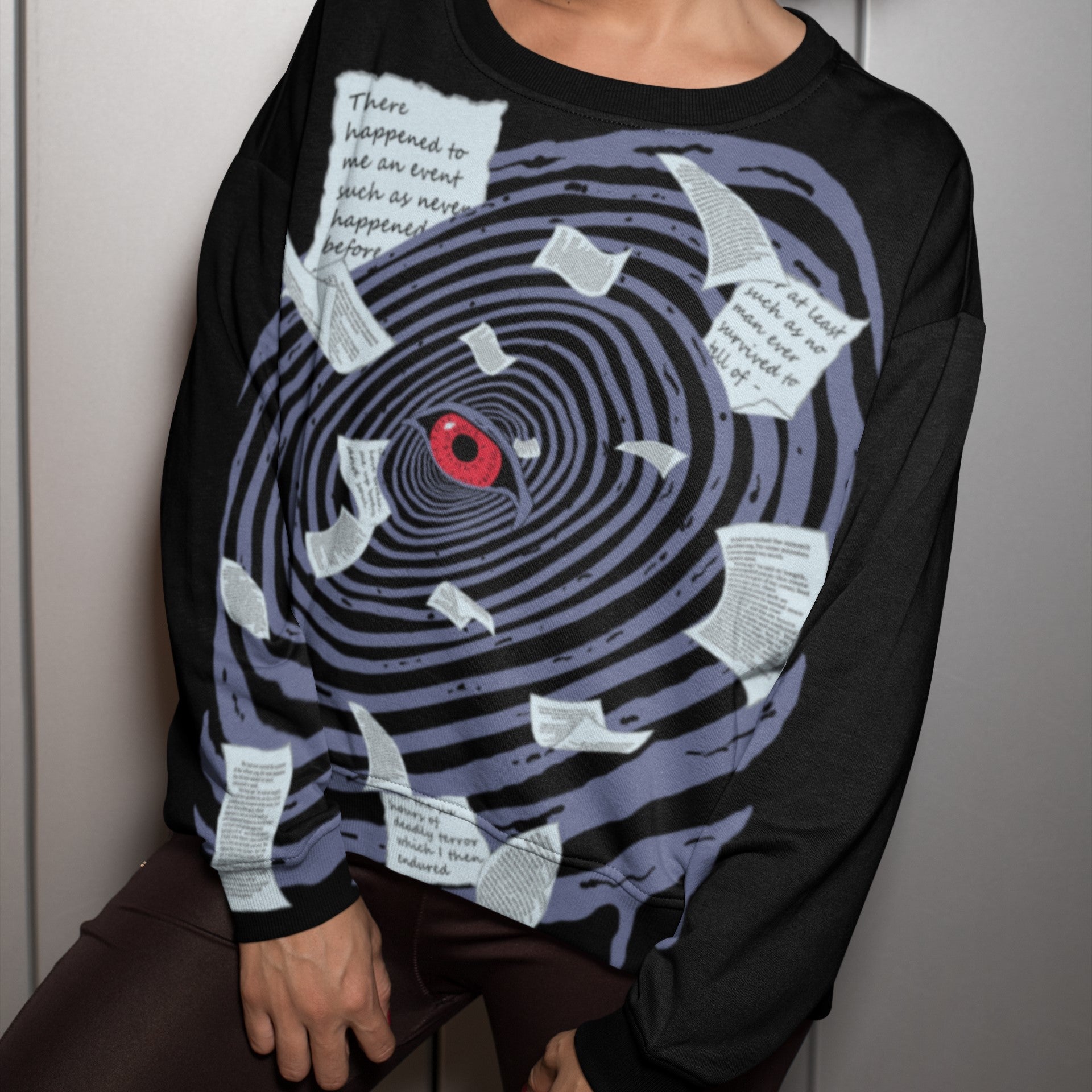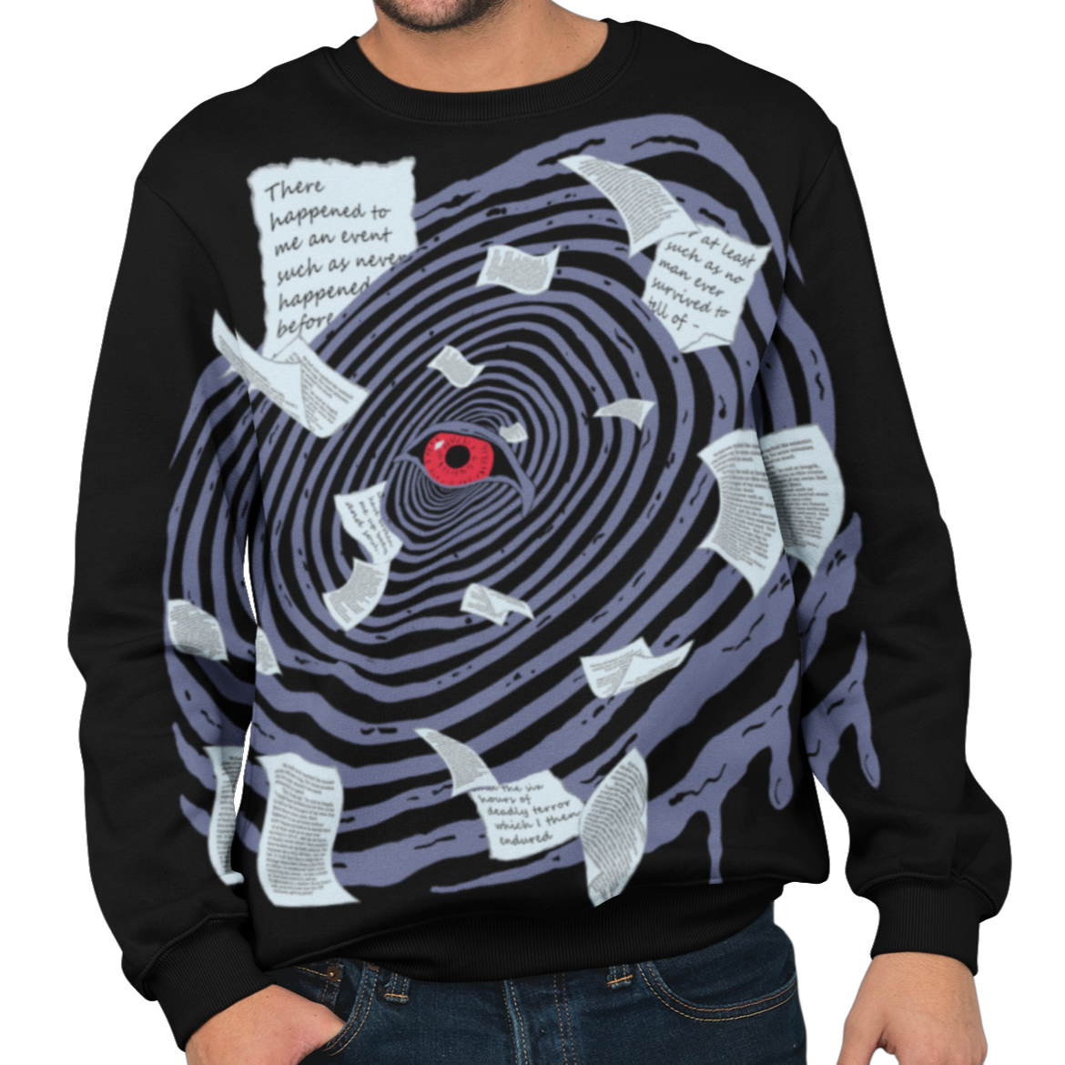 You stand on the precipice, chaos whirls around you, is it all in your imagination? Share your dizzying world when you wear the Semantic Spiral Sweatshirt! Featuring an eye in the center of a vortex of thoughts and the phrase "There happened to me an event such as never happened before to mortal man-or at least such as no man ever survived to tell of-and the six hours of deadly terror which I then endured have broken me up body and soul." Inspired by A Descent into the Maelstrom by Edgar Allan Poe, this crimson on deep blue haze swirled from the musings of our in-house artists. Beware, the people around you might become lightheaded staring at your hypnotic garb.