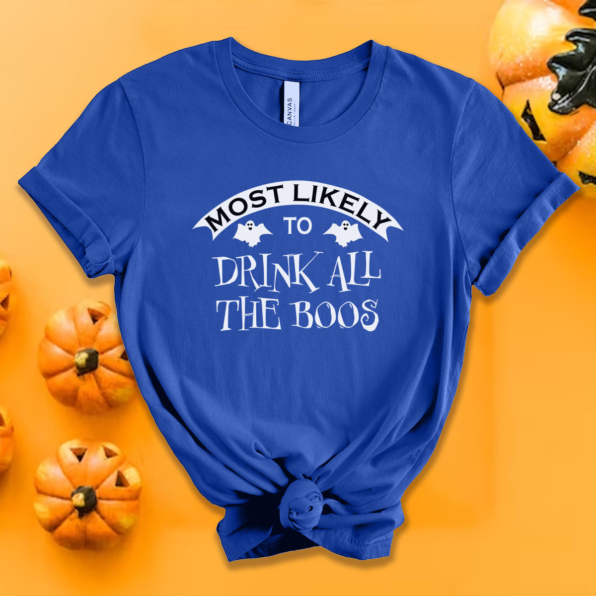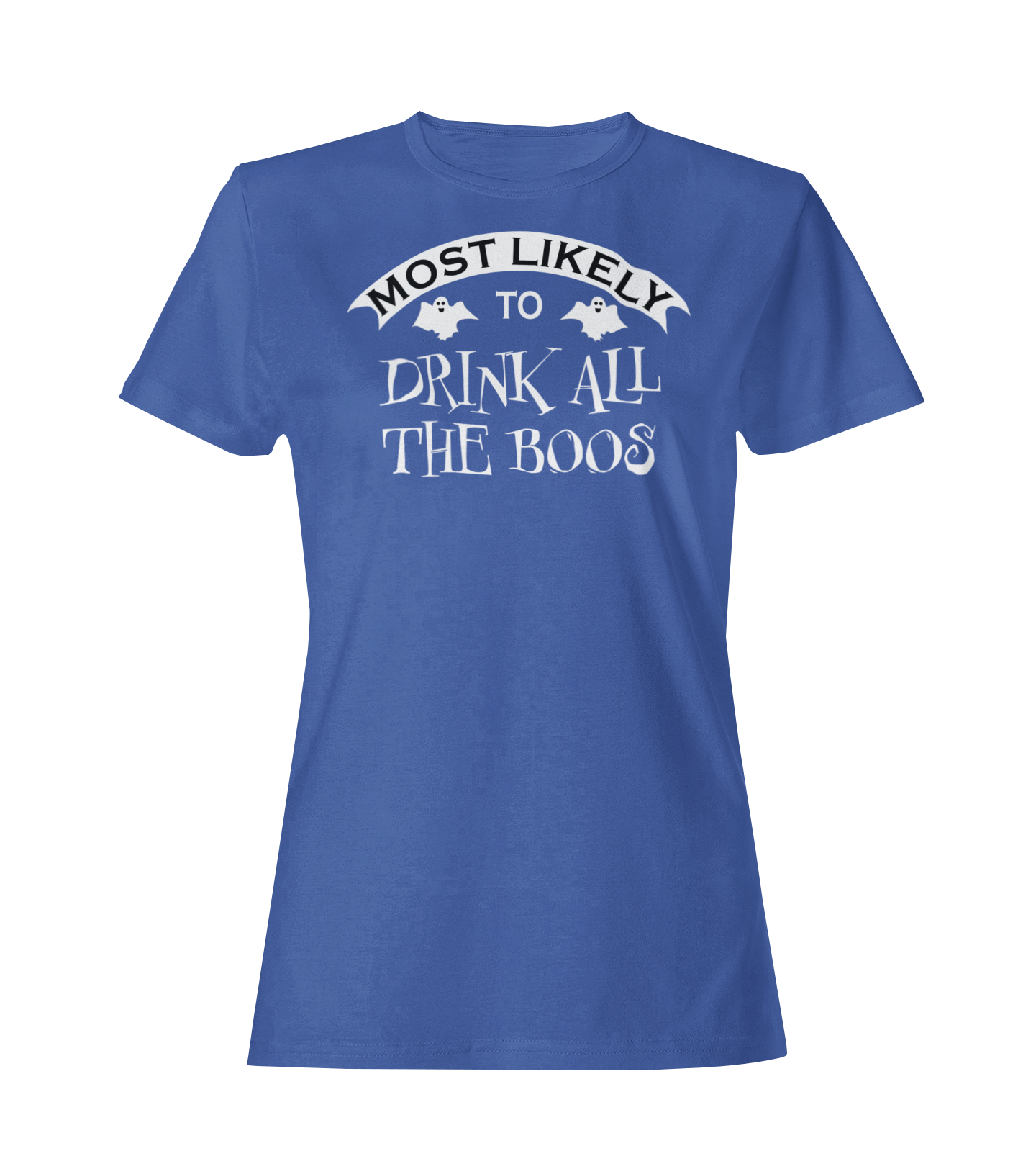 Go Squad! It's time to round up your crew for the Halloween Festivities! This tee says, Most Likely To Drink All The Boos and is printed on True Royal Blue. Every Tee in this squad group comes in a different color, so, you can look like a team, but still express your individuality! Let the spooky fun begin!