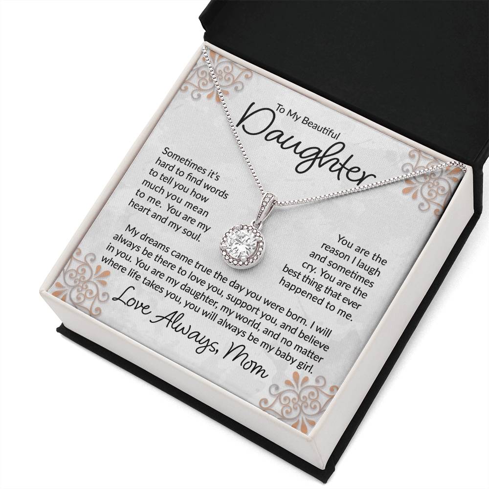 The printed message card included in the box reads: Sometimes it's hard to find words to tell you how much you mean to me. You are my heart and soul. You are the reason I laugh and sometimes cry. You are the best thing that ever happened to me. My dreams came true the day you were born. I will always be there to love you, support you, and believe in you. You are my daughter, my world, and no matter where life takes you, you will always be my baby girl. Love Always, Mom.