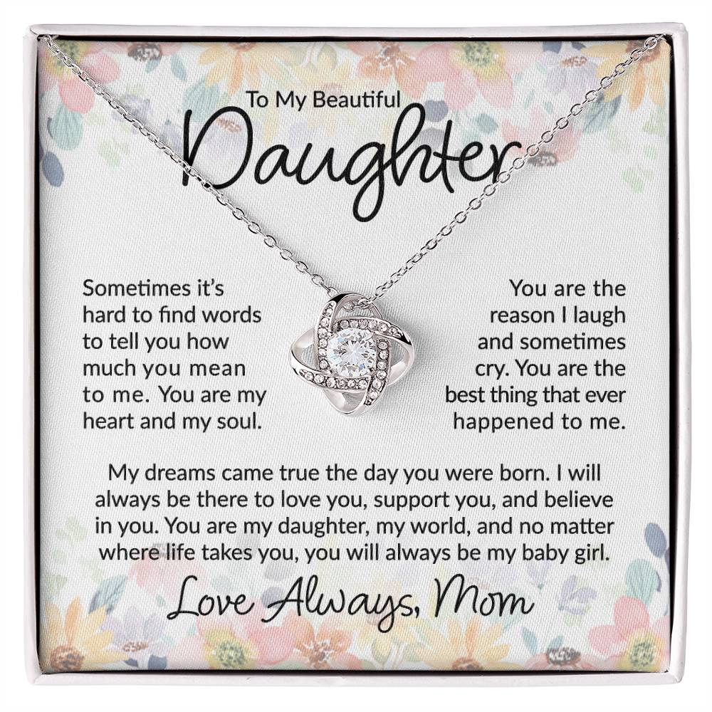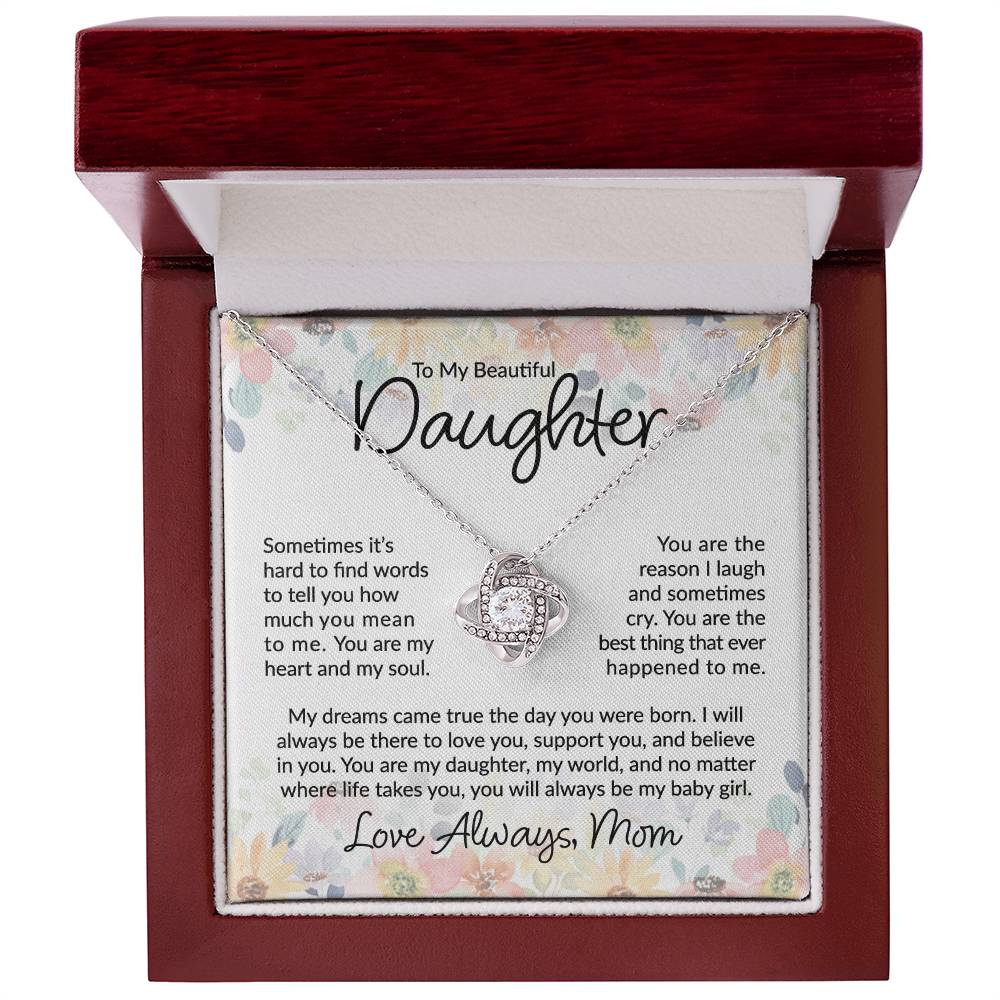 The printed message card included in the box reads: To My Beautiful Daughter, Sometimes it's hard to find words to tell you how much you mean to me. You are my heart and my soul. You are the reason I laugh and sometimes cry. You are the best thing that ever happened to me. My dreams came true the day you were born. I will always be there to love you, support you, and believe in you. You are my daughter, my world, and no matter where life takes you. you will always be my baby girl. Love Always, Mom
