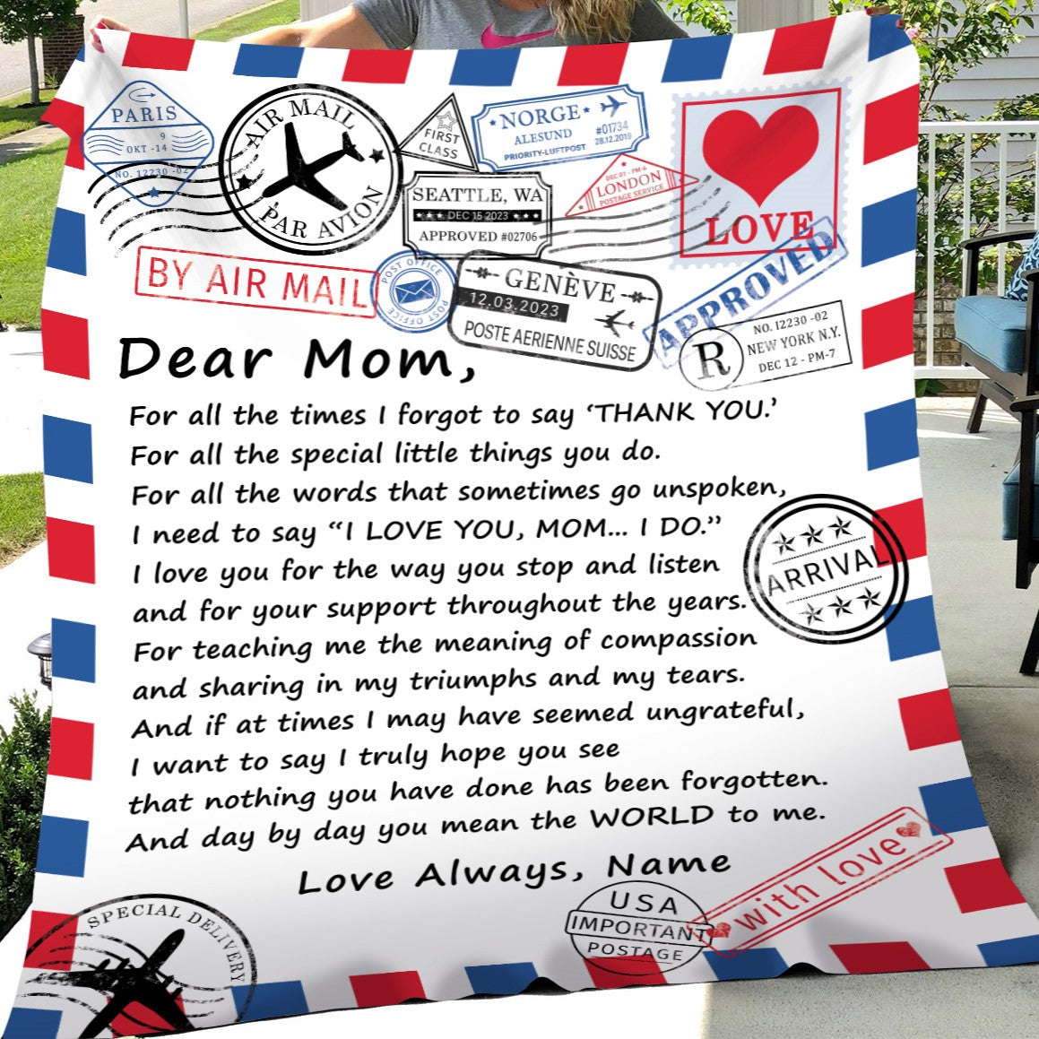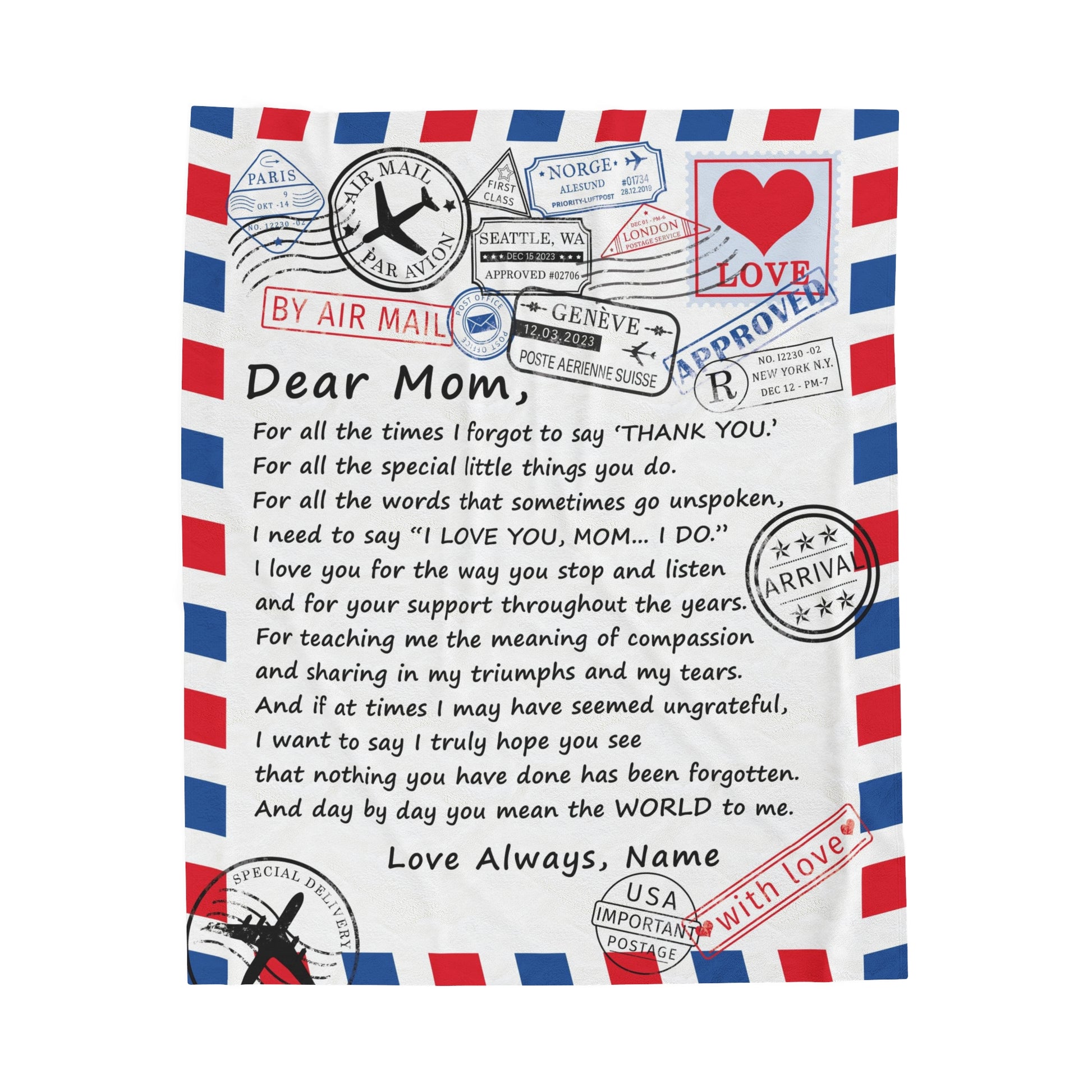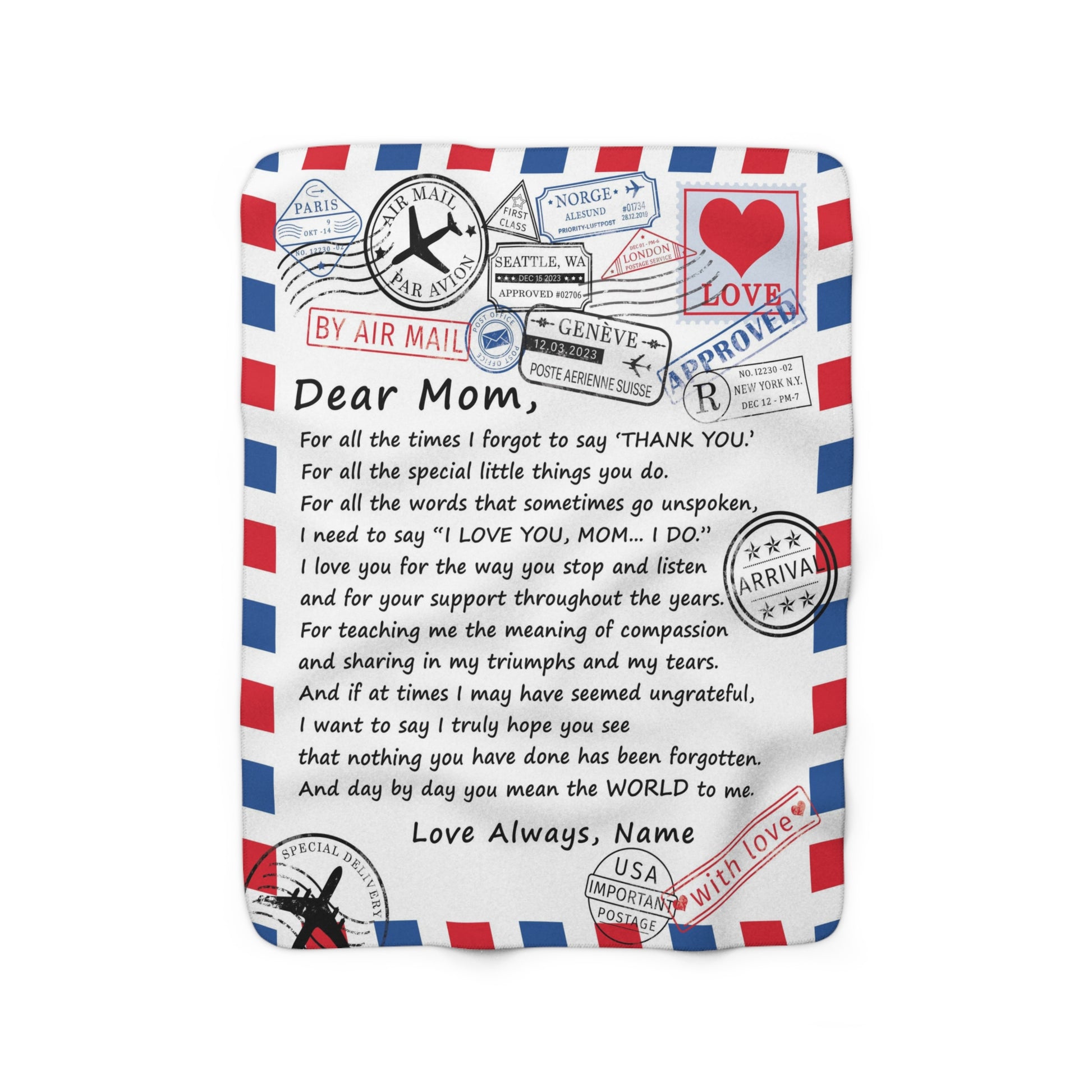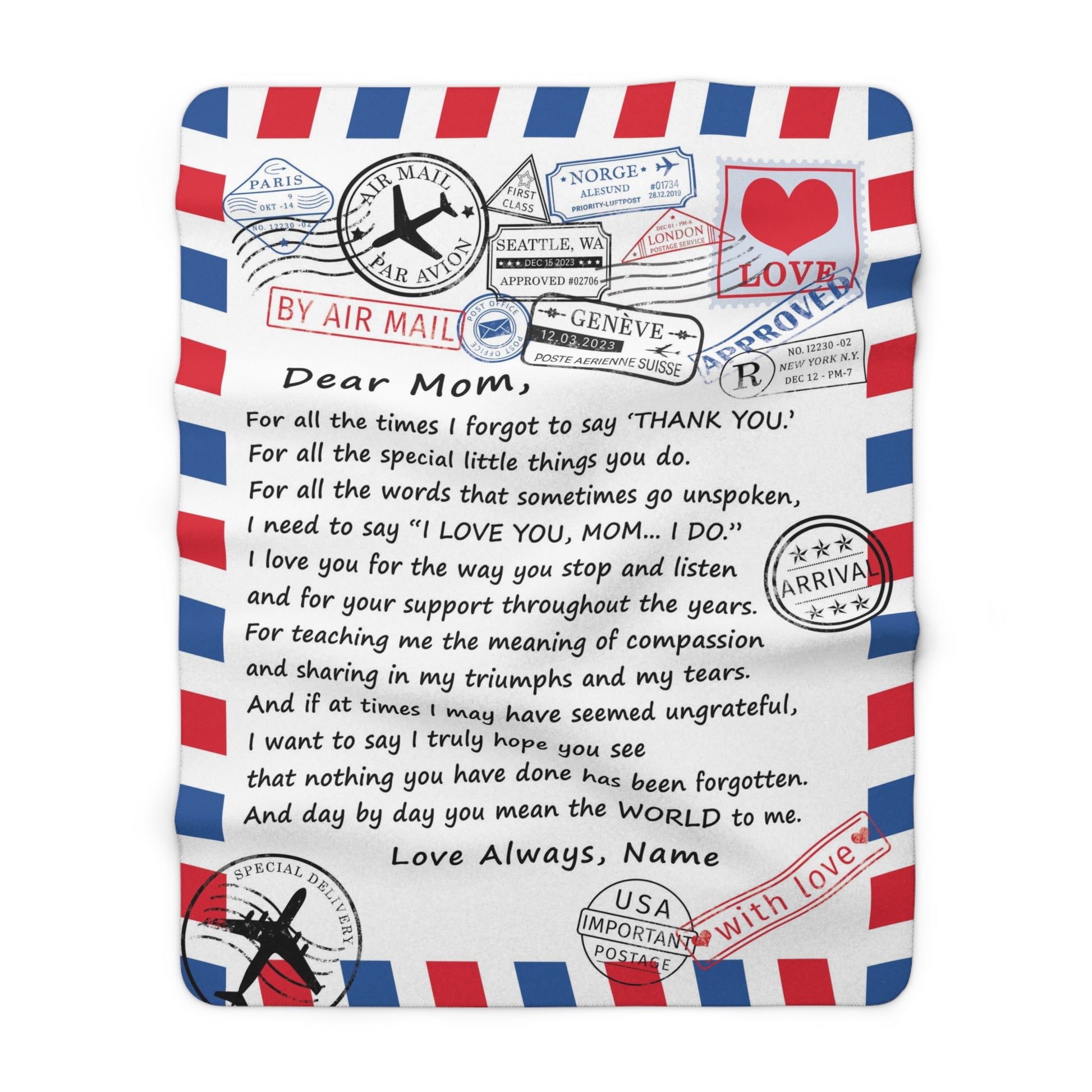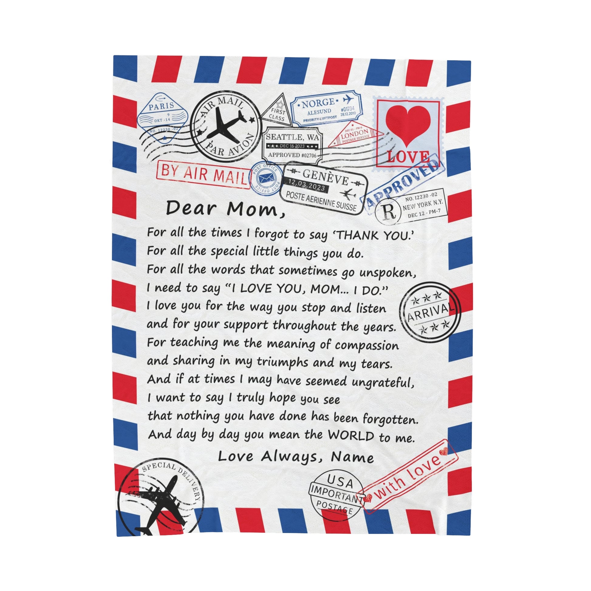 Personalize this sentimental message blanket with your name in the signature! Give the gift of coziness to Mom this season with the You Mean the World to Me Velveteen Plush or Sherpa blanket. Imagine her eyes lighting up with joy when she unwraps this oh-so-soft blanket featuring airmail insignia, stamps, and a beautiful heartfelt message that says, "Dear Mom, For all the times I forgot to say 'Thank You.' For all the special little things you do. For all the words that sometimes go unspoken, I need to say, "I love you, Mom... I do." I love you for the way you stop and listen and for your support throughout the years. For teaching me the meaning of compassion and sharing in my triumphs and my tears. And if at times I may have seemed ungrateful, I want to say I truly hope you see that nothing you have done has been forgotten. And day by day you mean the world to me." Choose between the Velveteen Plush or Sherpa style blankets. Available in two sizes, Medium 50 x 60 inches or Large 60 x 80 inches, you are sure to find the perfect fit for you and yours.