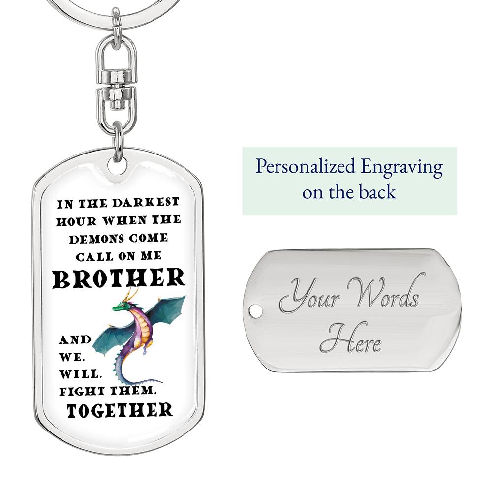 This D&D inspired keychain features the Dragon and the message says: In the darkest hour when the demons come, call on me Brother and we will fight them together.