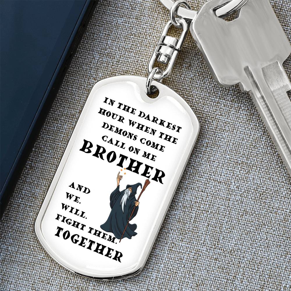 This D&D inspired keychain features the Wizard and the message says: In the darkest hour when the demons come, call on me Brother and we will fight them together.