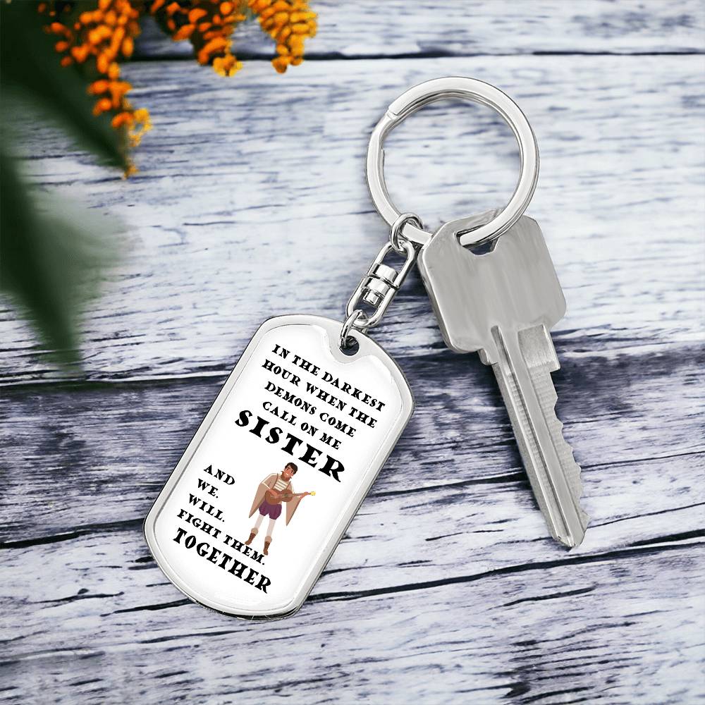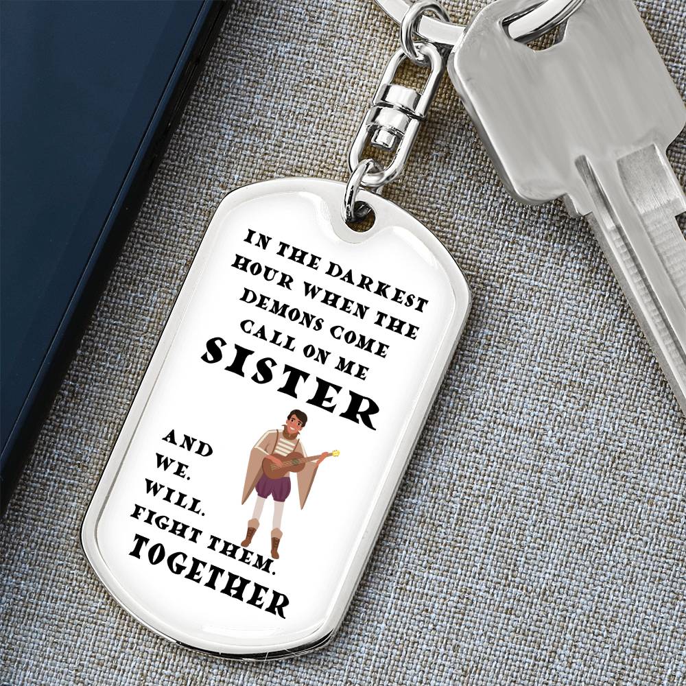 This D&D inspired keychain features the Bard and the message says: In the darkest hour when the demons come, call on me Sister and we will fight them together.