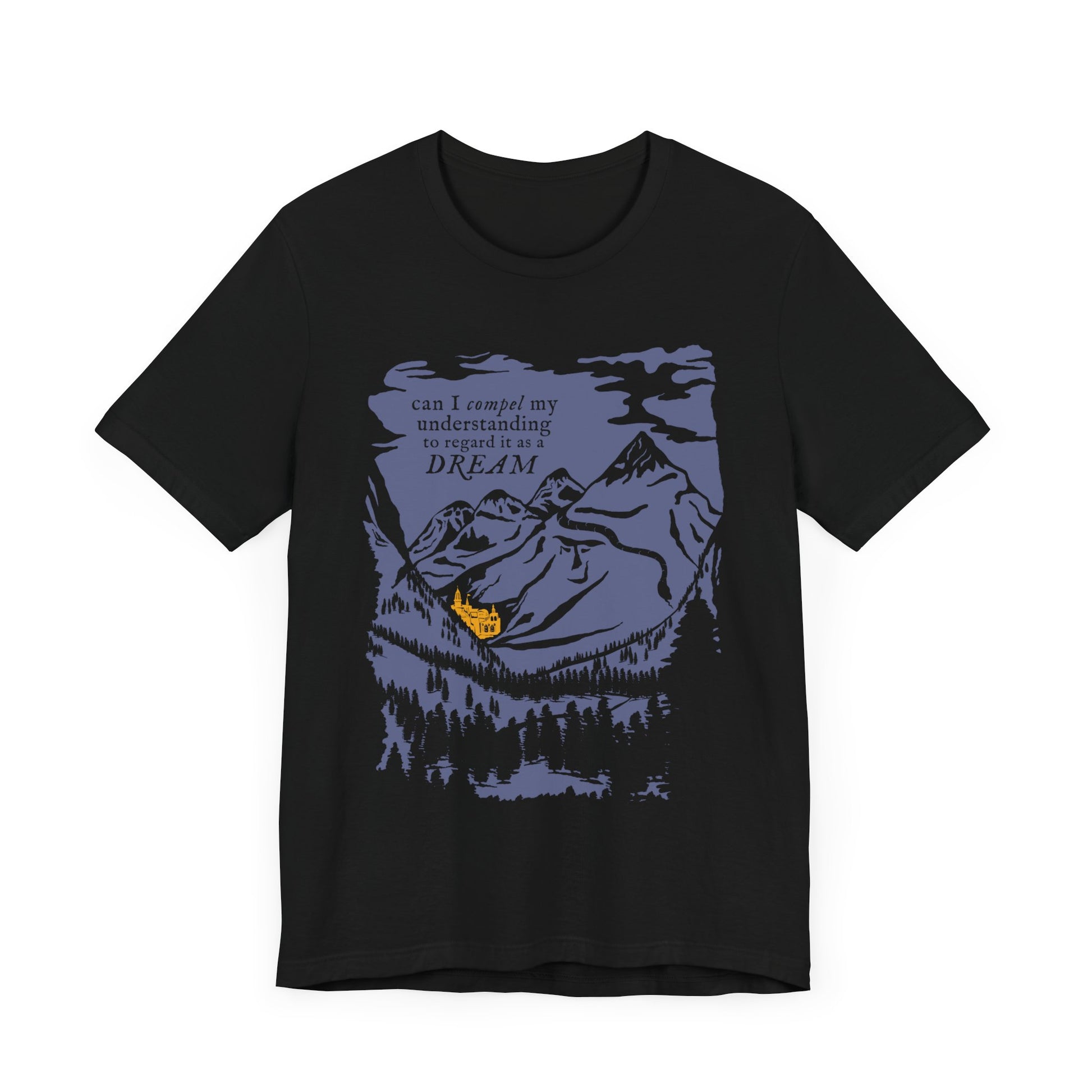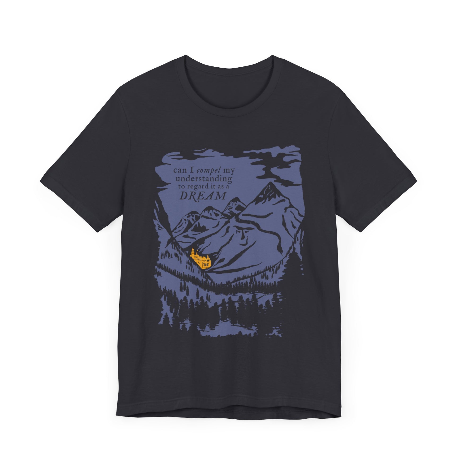 You are convinced that truth is stranger than fiction, but what about science fiction? You can travel to the golden temples in this Dream Destination T-shirt! Featuring a hidden city in the mountains and the phrase "Can I compel my understanding to regard it as a dream?" straight out of A Tale of the Ragged Mountains by Edgar Allan Poe, this tangerine on deep blue haze design was imagined by our in-house artists. You might want to pinch yoursef if you dare to follow this dream.