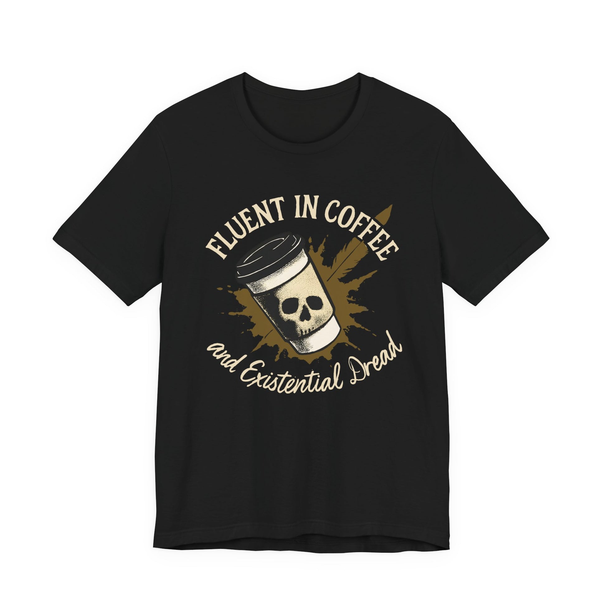 "Fluent in Coffee and Existential Dread" A confession brewed in shadow. The skull emerges from the cup's silhouette like a ghost in steam, while spilled coffee blooms across fabric like ink bleeding through parchment. The quill whispers of what drives us: the need to write ourselves into meaning, even when meaning refuses to arrive. This is the uniform of the perpetually unfinished—the thesis that haunts, the essay due at dawn. Printed in black and parchment, as all honest confessions should be.