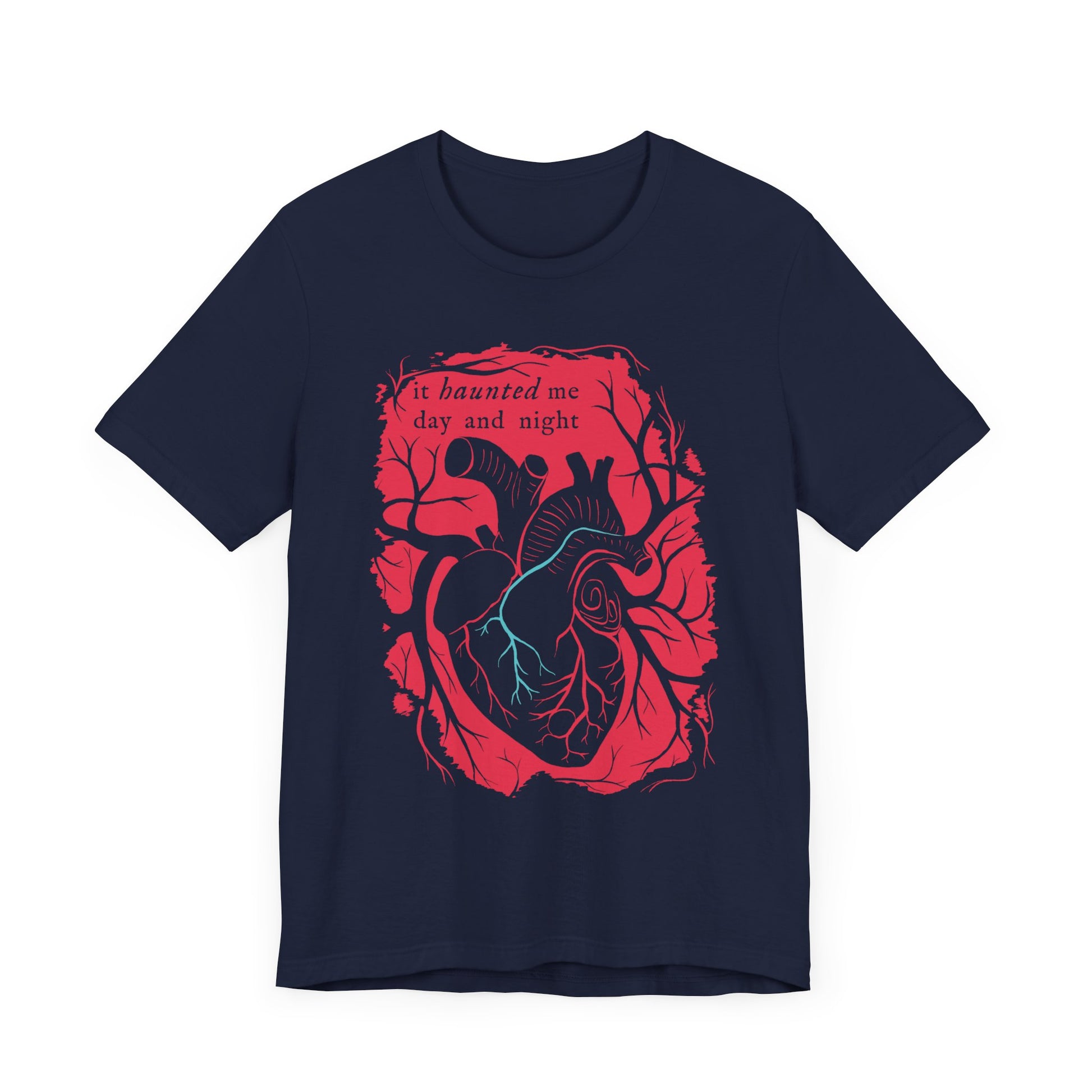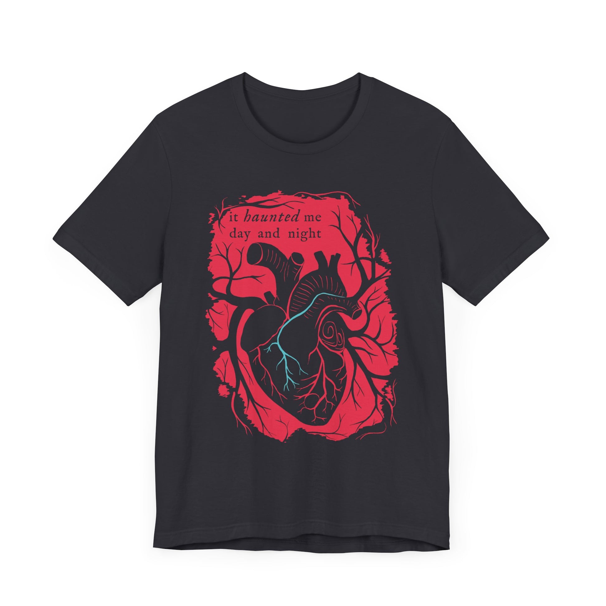 You search for frightening stories, you enjoy surprising your friends, you will flaunt this Haunted Heart T-shirt! Featuring an anatomically correct heart and the phrase -it haunted me day and night- straight out of the classic Tell Tale Heart by Edgar Allan Poe, this icy teal on blood red design was conceived by the imagination of our in-house artists. If you listen closely, you might be able to hear the beating of this Poe-Opener Collection heart!