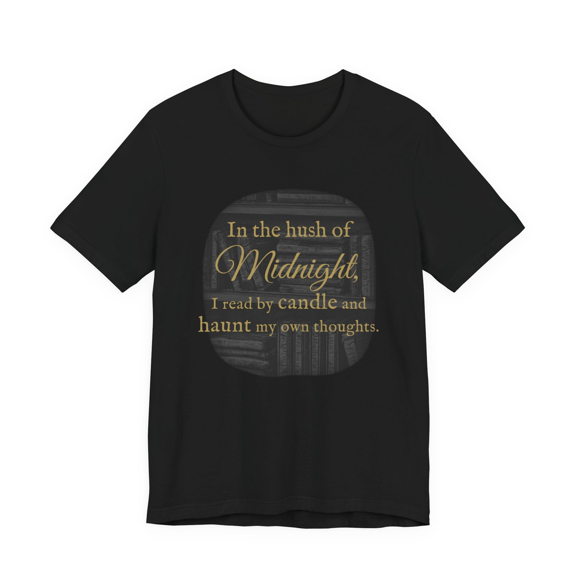 "In the Hush of Midnight" - For those who read past reason and love past sleep. The Library at Midnight is an ode to the scholar who finds peace only among ink and dust — a sanctuary of solitude, learning, and candlelight. Printed in bone ink on black cotton, this design evokes the hush of an ancient library, where pages whisper and time itself forgets to move.