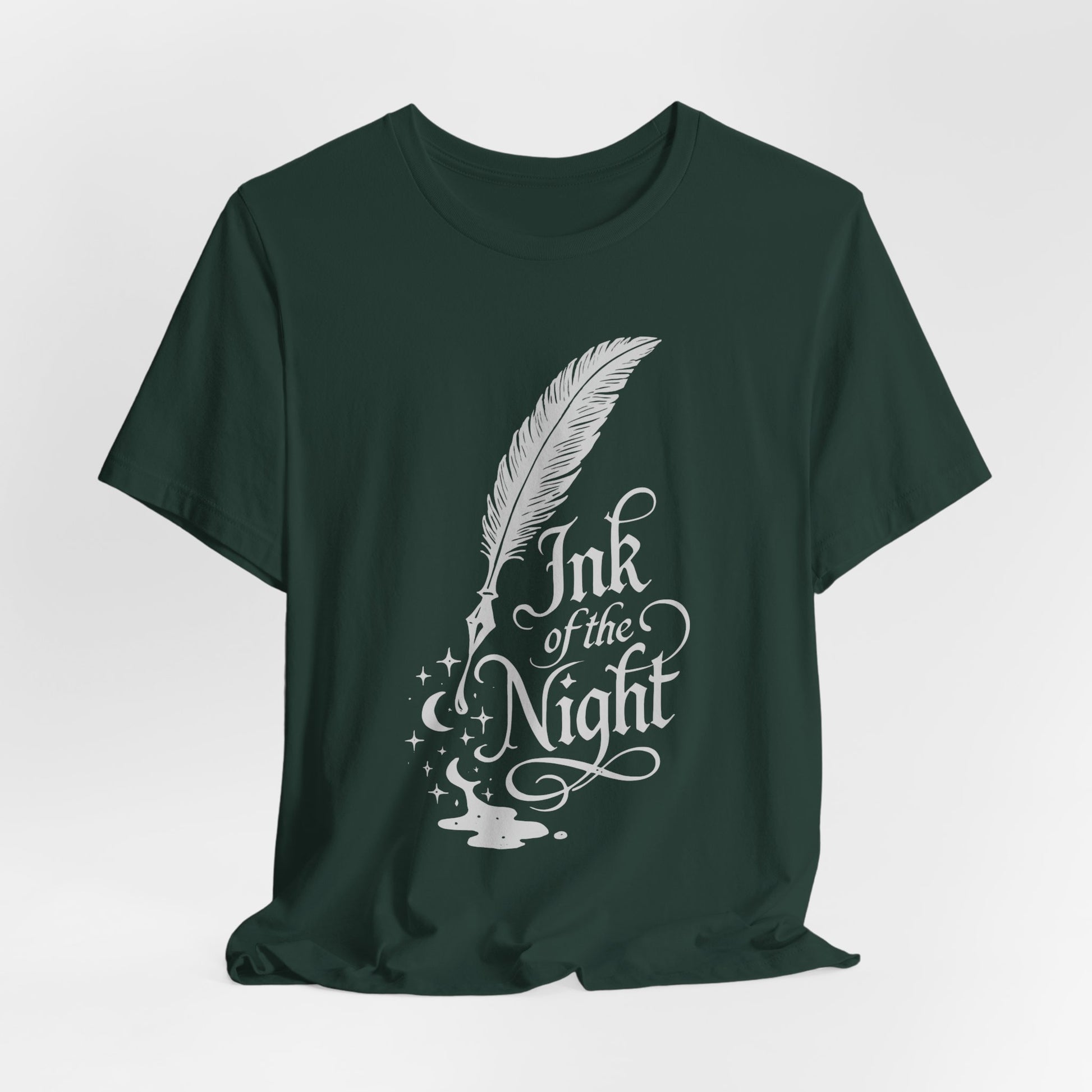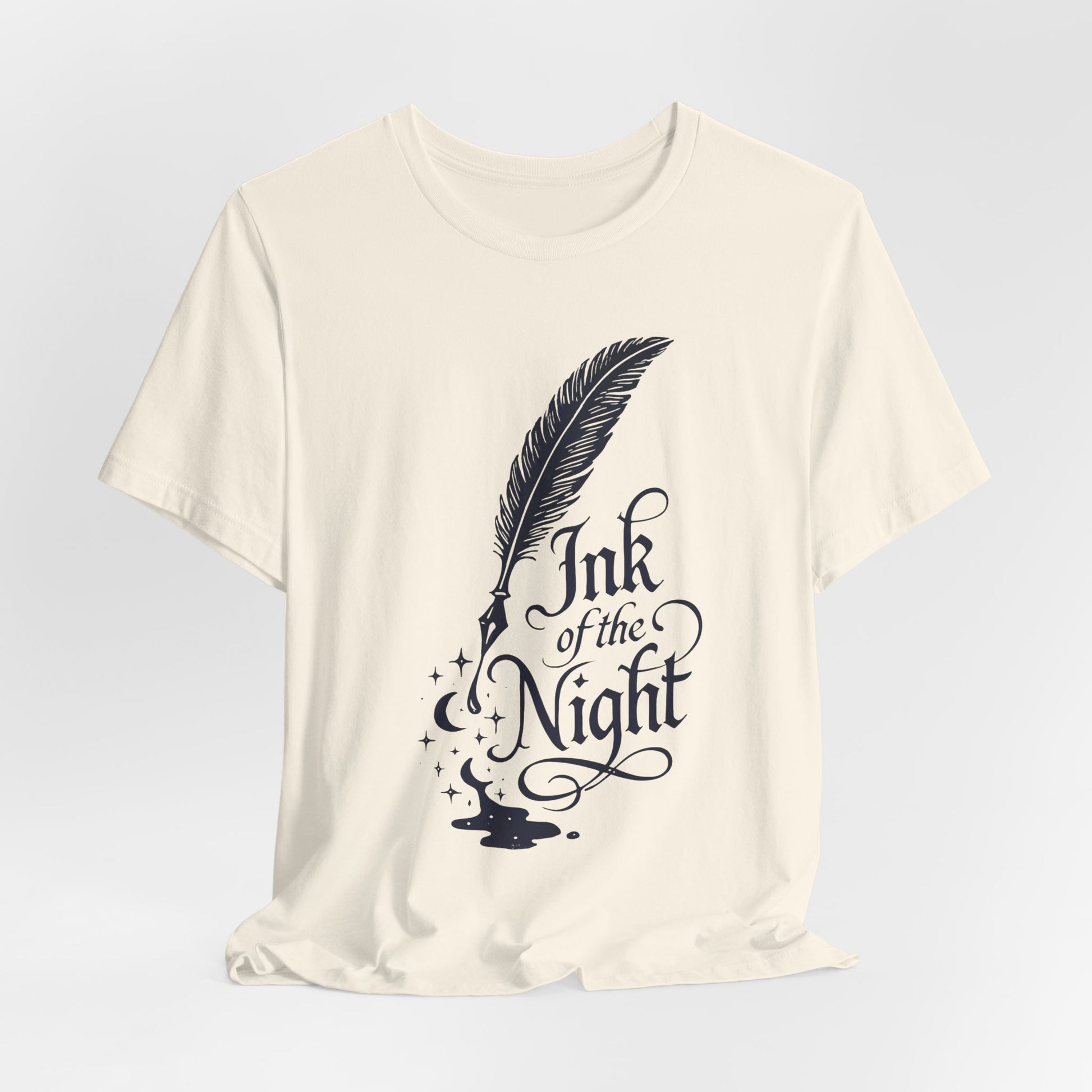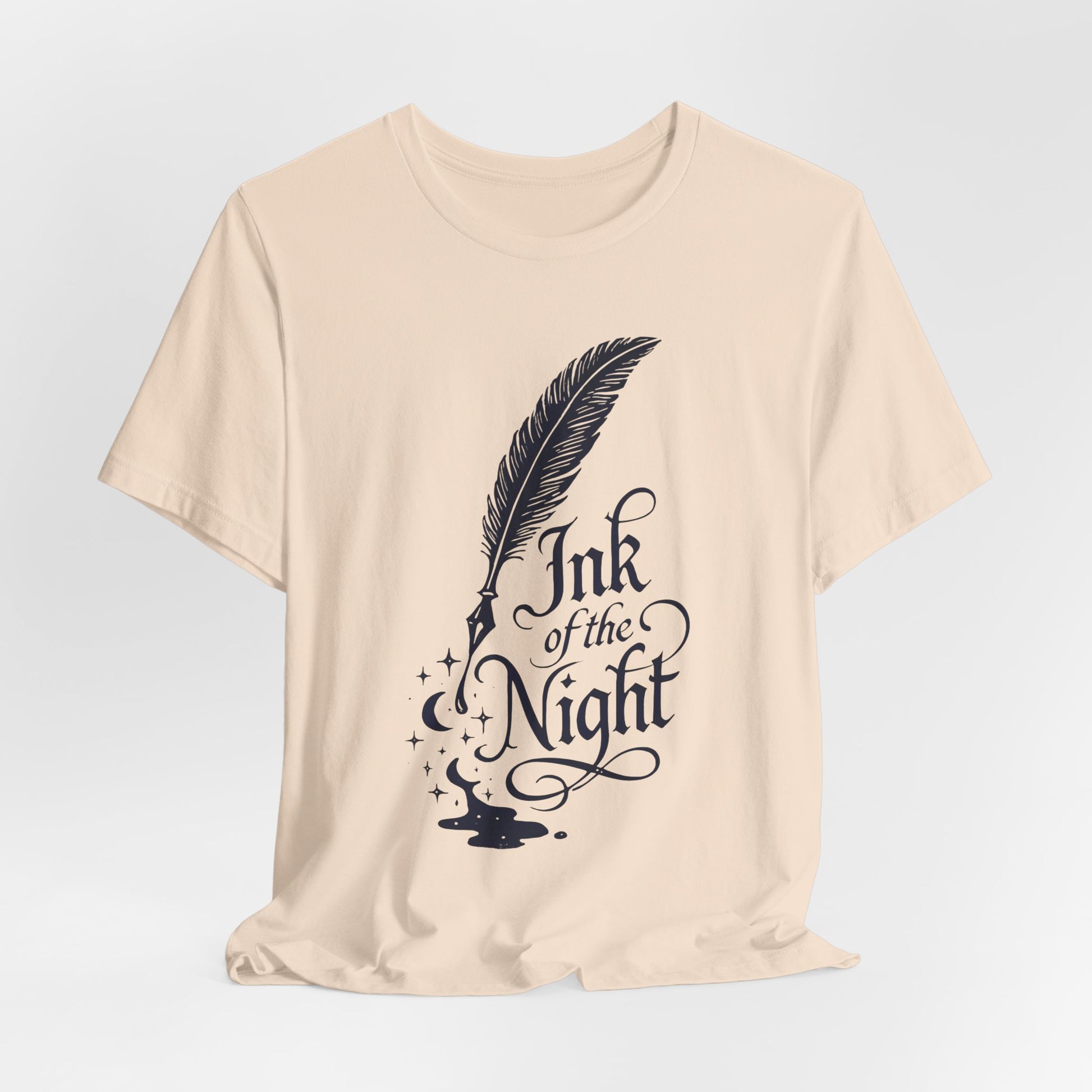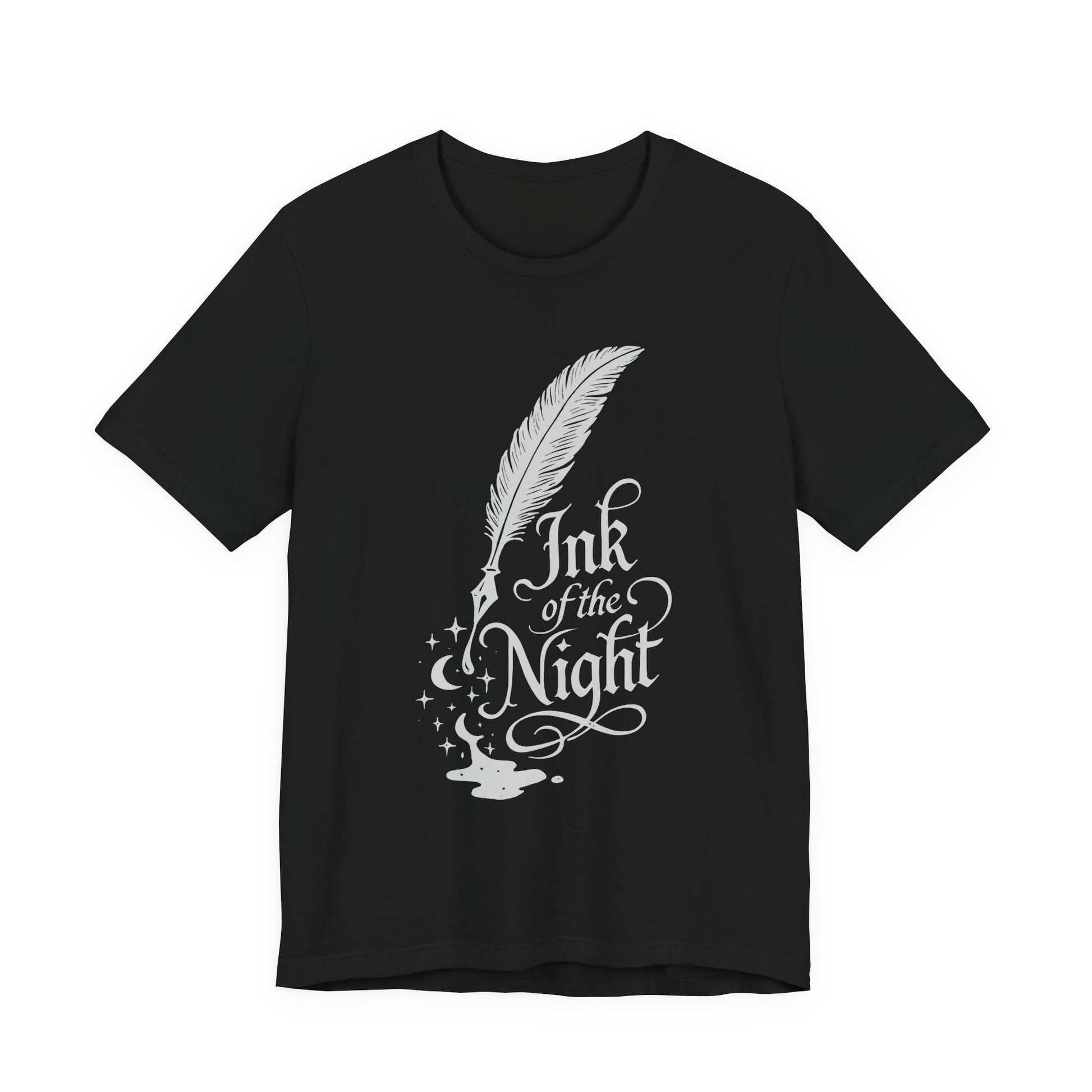 "Ink of the Night" - Romantic, sweeping script arcs beneath a long quill rendered like an ink splash. Flourishes dance like drifting smoke, and the subtle texture recalls paper softened by time and tears. This edition is for the heart-heavy dreamer who sees beauty in melancholy and finds grace in every quiet ache. A shirt meant to be sighed into.