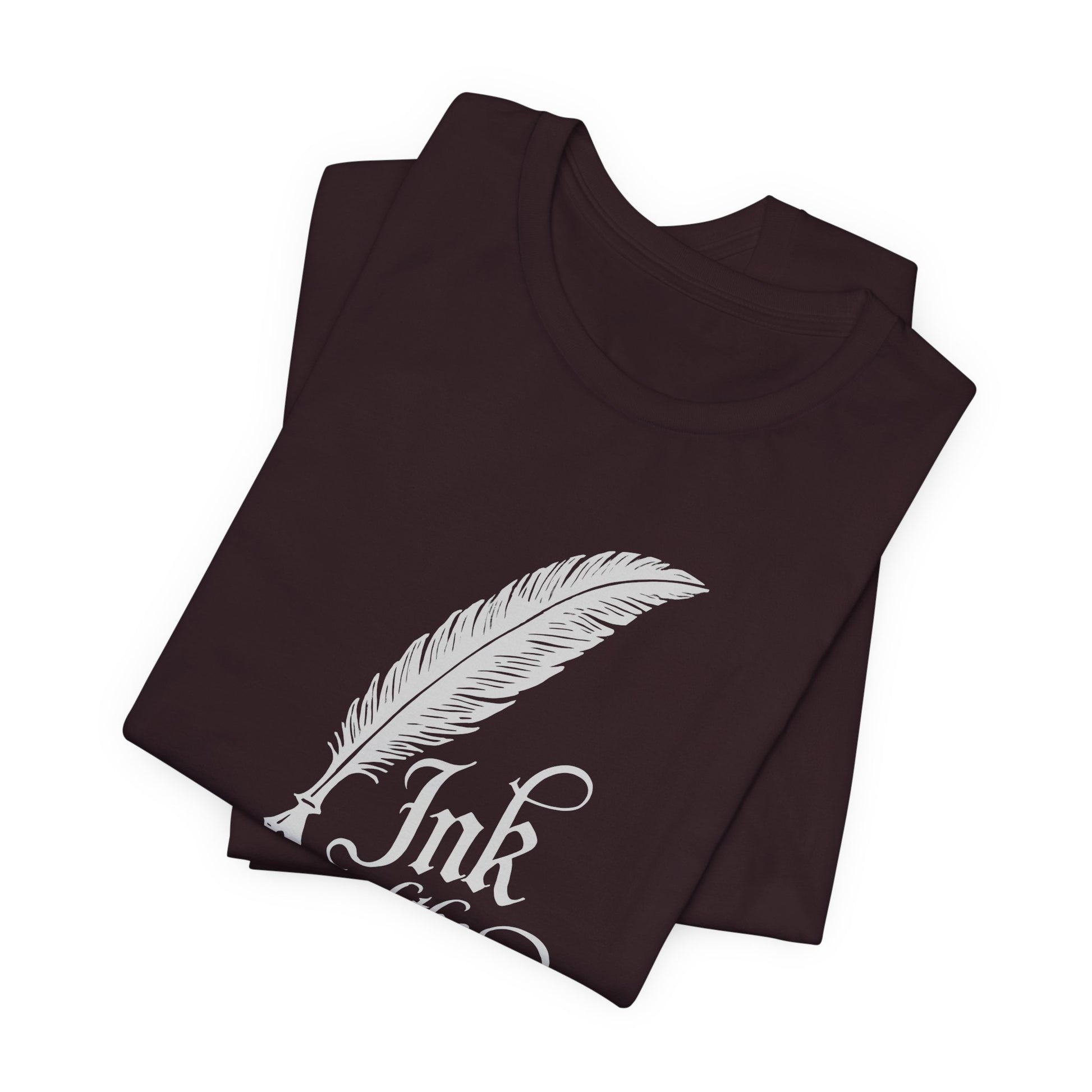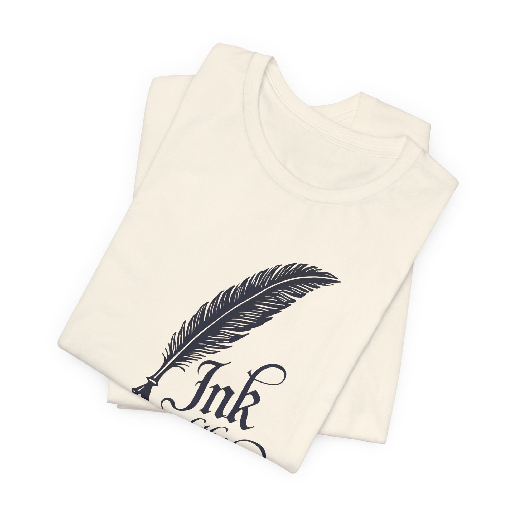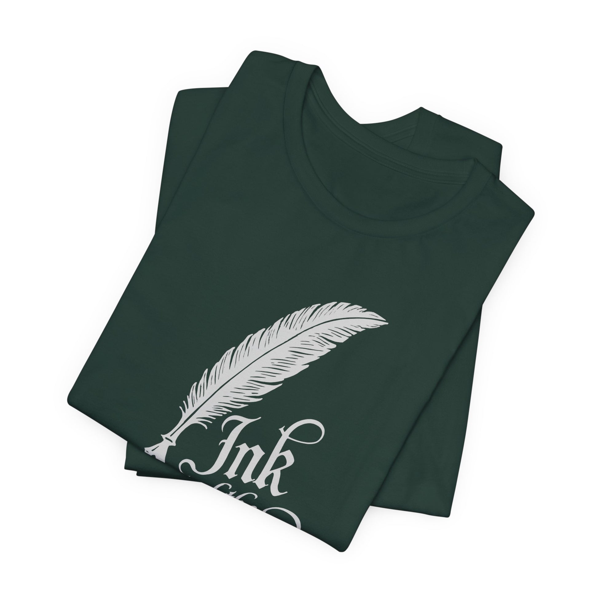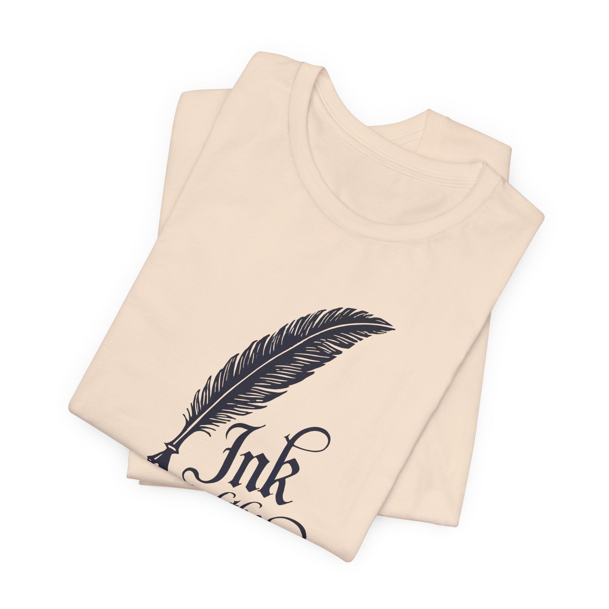 "Ink of the Night" - Romantic, sweeping script arcs beneath a long quill rendered like an ink splash. Flourishes dance like drifting smoke, and the subtle texture recalls paper softened by time and tears. This edition is for the heart-heavy dreamer who sees beauty in melancholy and finds grace in every quiet ache. A shirt meant to be sighed into.