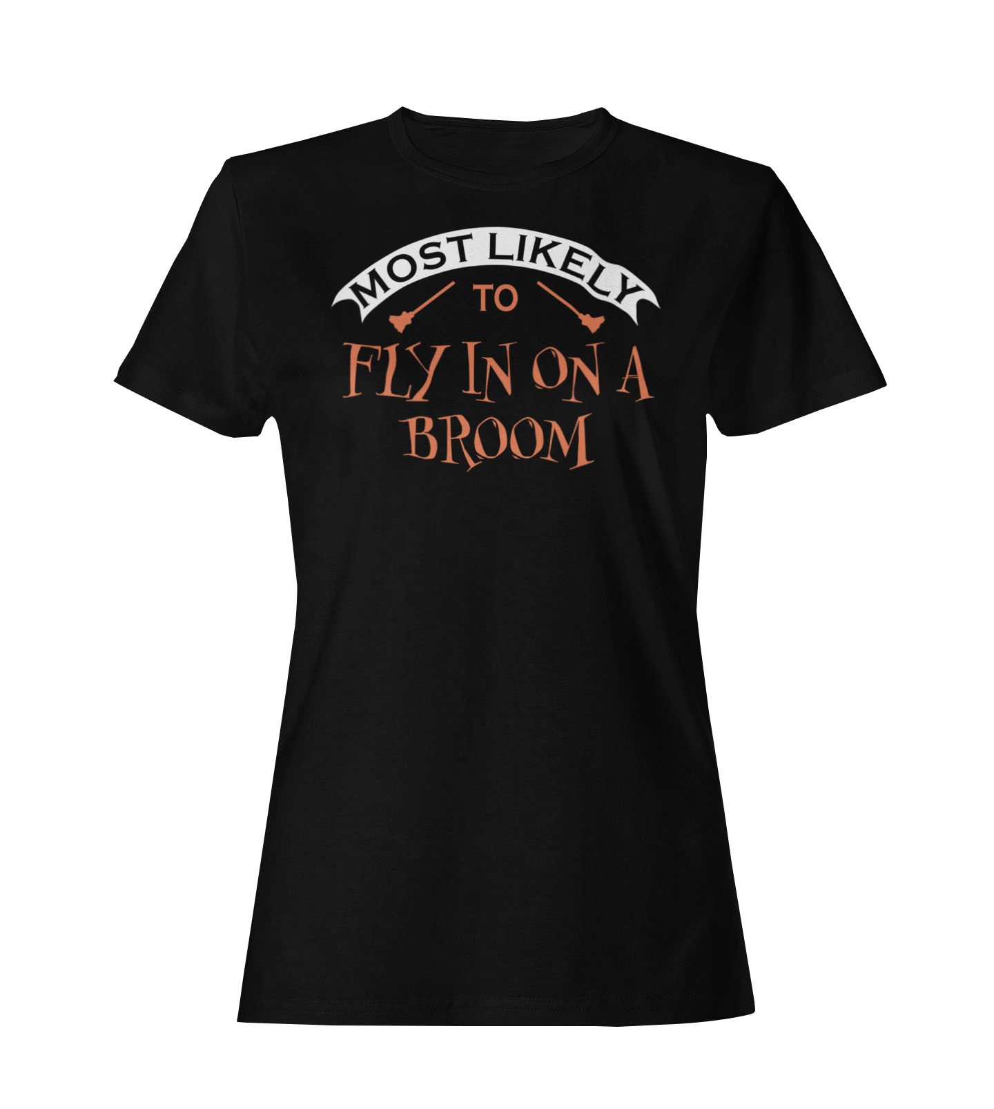 Go Squad! It's time to round up your crew for the Halloween Festivities! This tee says, Most Likely To Fly In On A Broom and is printed on Black. Every Tee in this squad group comes in a different color, so, you can look like a team, but still express your individuality! Let the spooky fun begin!