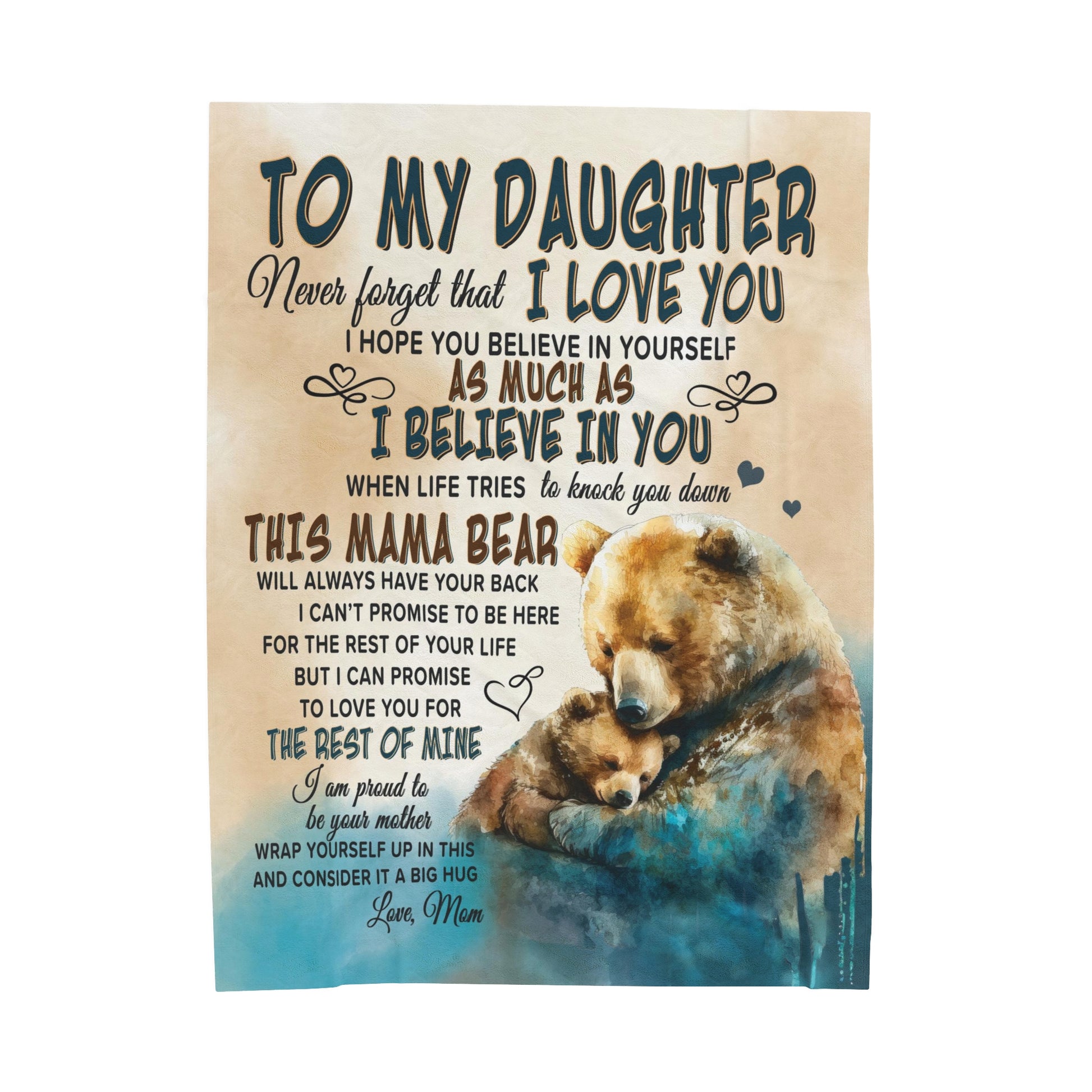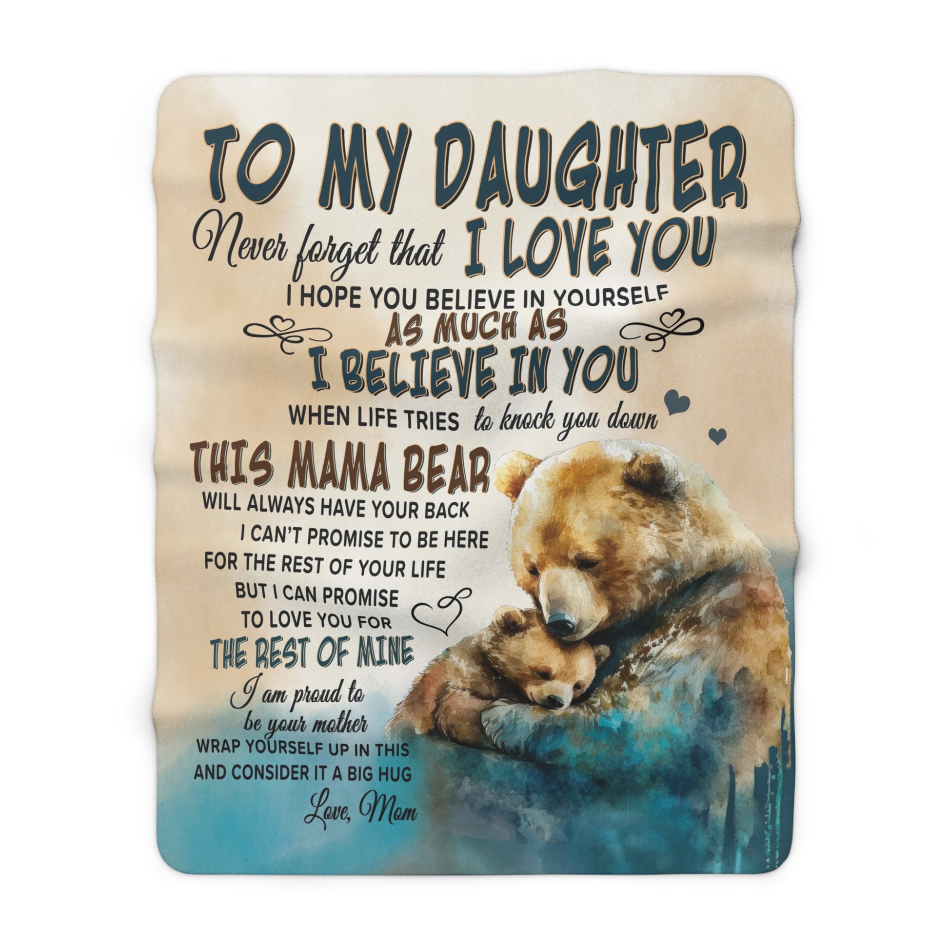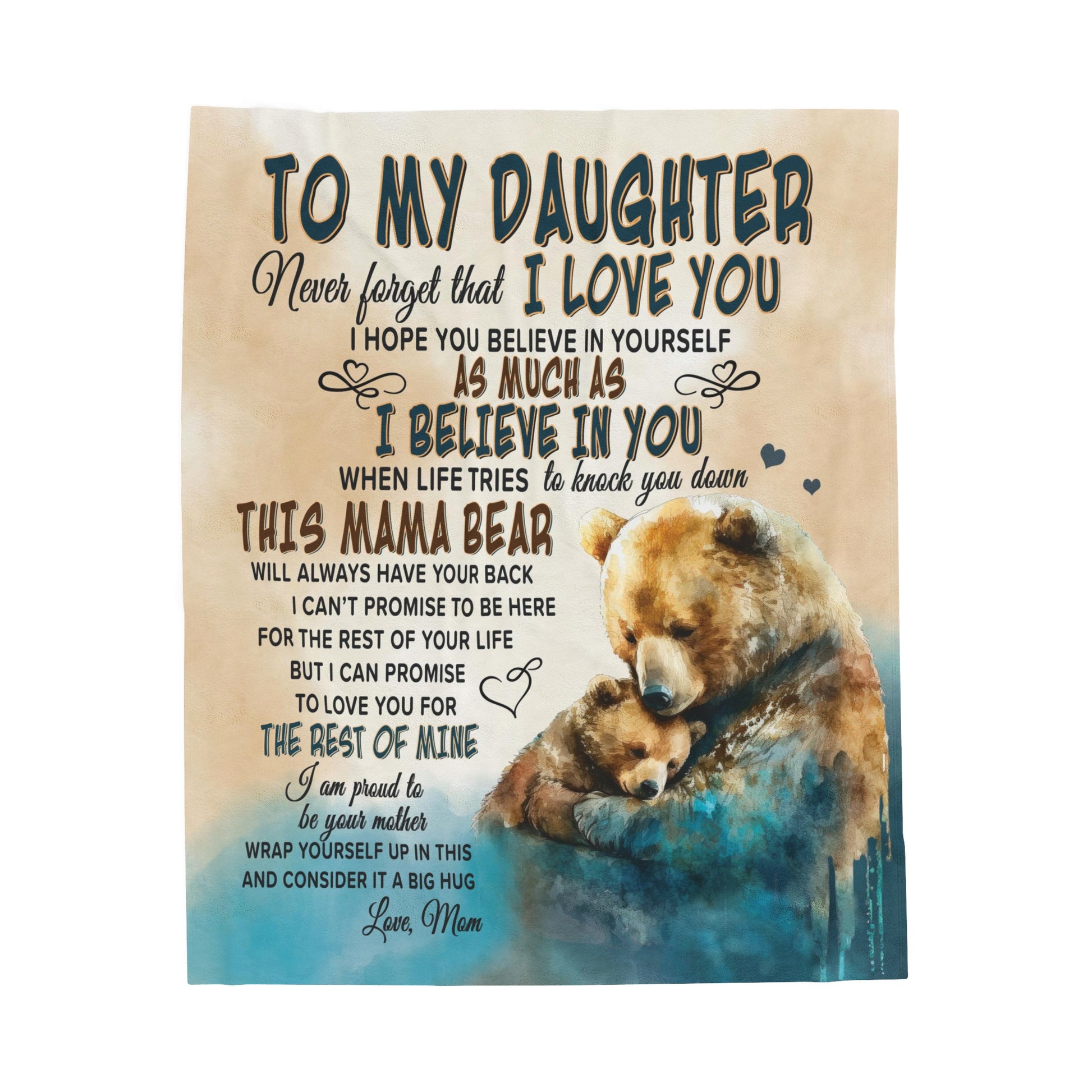 Give the gift of coziness this season with the Mama Bear Velveteen Plush or Sherpa blanket. Imagine the surprise and tears when your daughter unwraps this oh-so-soft blanket featuring Mama Bear and Little Bear watercolor art and the sweet message, "To My Daughter, Never forget that I love you. I hope you believe in yourself as much as I believe in you. When life tries to knock you down, This Mama Bear will always have your back. I can't promise to be here for the rest of your life. But I can promise to love you for the rest of mine. I am proud to be your mother. Wrap yourself up in this and consider it a big hug, Love, Mom." Choose between the Plush Velveteen or Sherpa style blankets. Available in two sizes: Medium 50 x 60 inches or Large 60 x 80 inches, you are sure to find the perfect fit for you and yours.