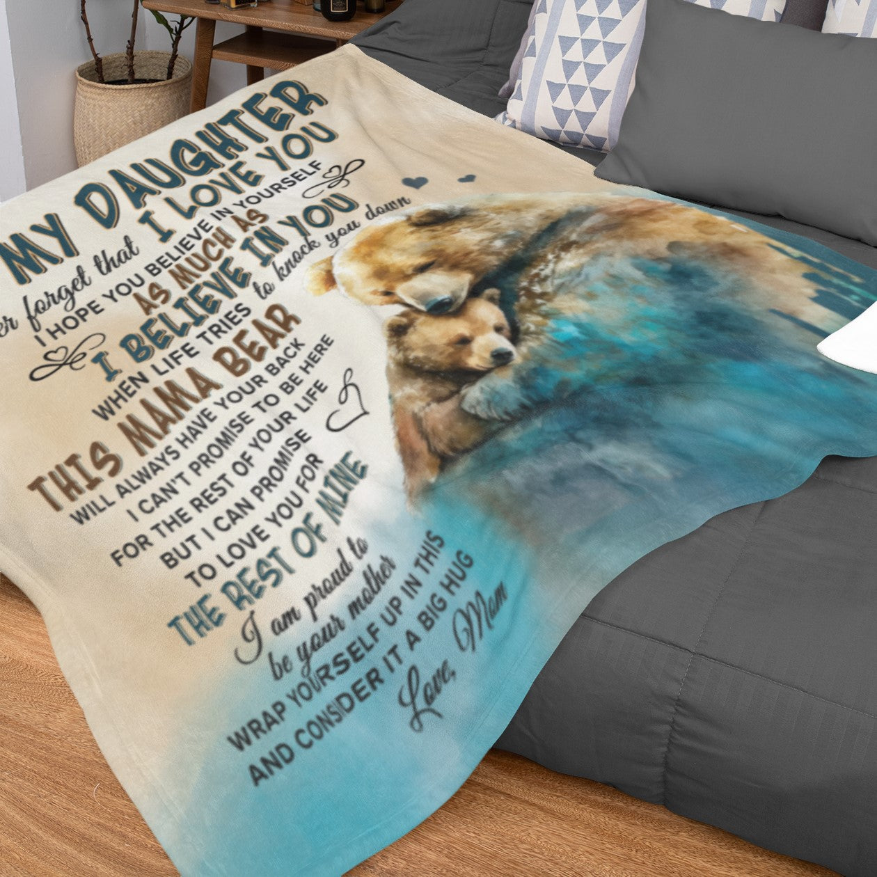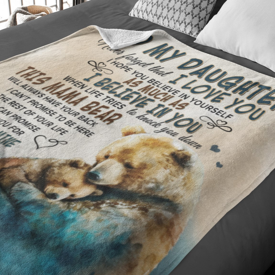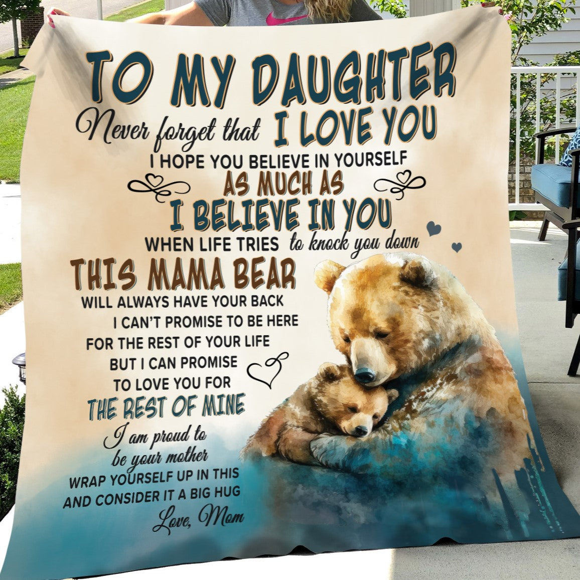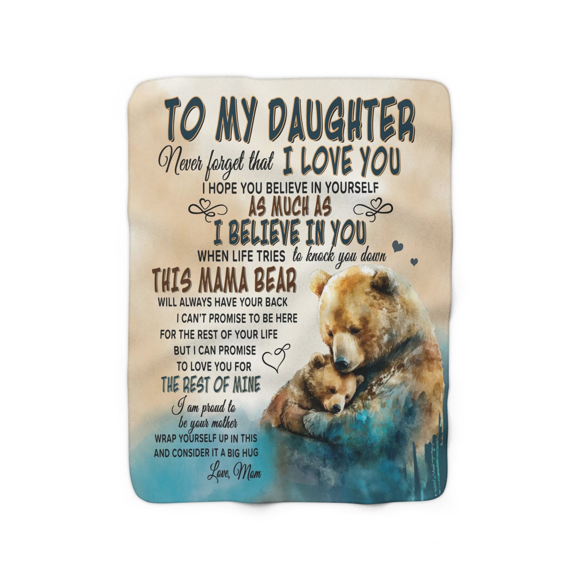 Give the gift of coziness this season with the Mama Bear Velveteen Plush or Sherpa blanket. Imagine the surprise and tears when your daughter unwraps this oh-so-soft blanket featuring Mama Bear and Little Bear watercolor art and the sweet message, "To My Daughter, Never forget that I love you. I hope you believe in yourself as much as I believe in you. When life tries to knock you down, This Mama Bear will always have your back. I can't promise to be here for the rest of your life. But I can promise to love you for the rest of mine. I am proud to be your mother. Wrap yourself up in this and consider it a big hug, Love, Mom." Choose between the Plush Velveteen or Sherpa style blankets. Available in two sizes: Medium 50 x 60 inches or Large 60 x 80 inches, you are sure to find the perfect fit for you and yours.