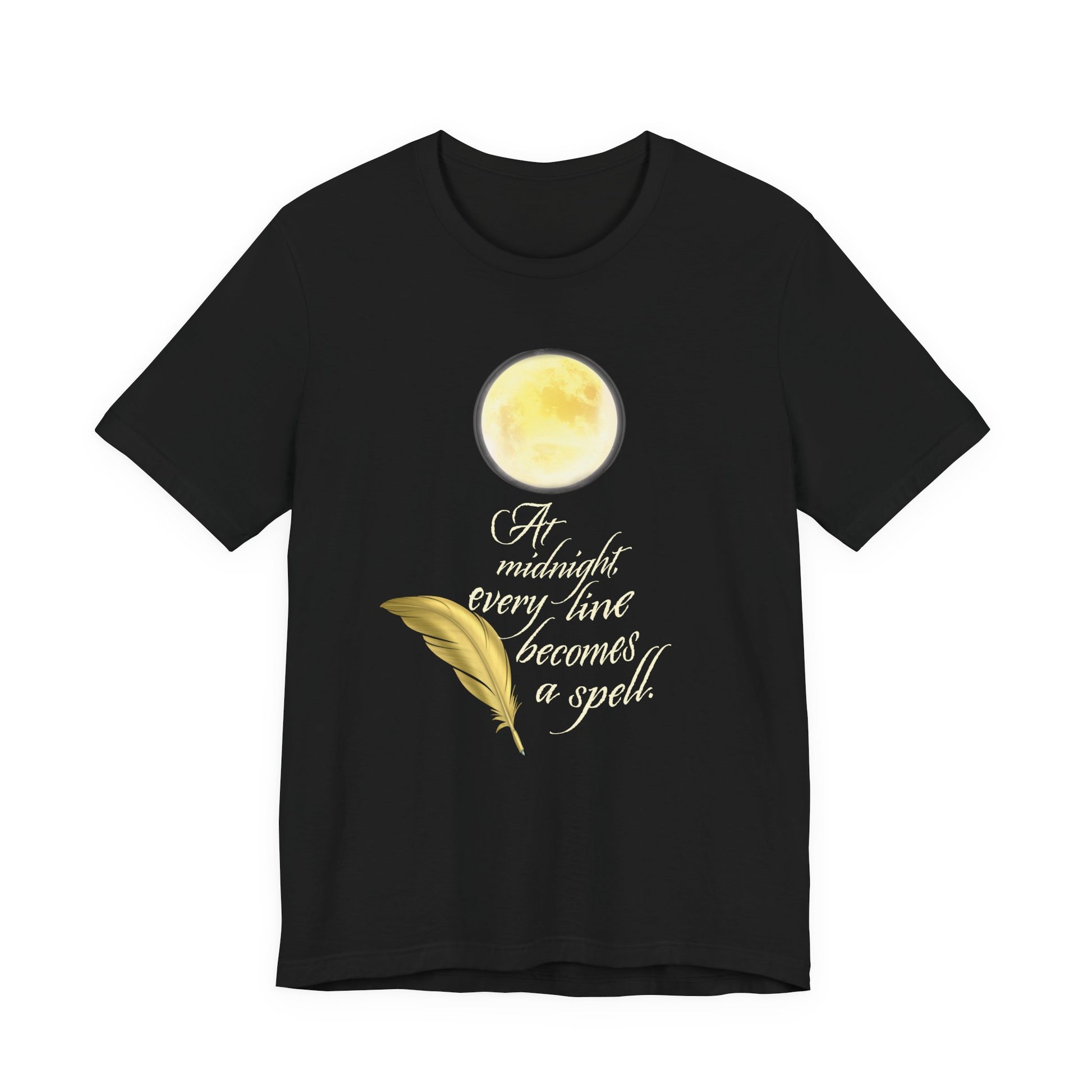 "At Midnight, Every Line Becomes a Spell" - Dark, lyrical, and richly academic, At Midnight, Every Line Becomes a Spell captures the hush of midnight writing — the moment when the world narrows to paper, breath, and trembling thought. A golden quill leaves wispy, hushed words bleeding down from the moon. It is a powerful potion to those who compose in silence, stitching dreams to the page by candlelight. A garment for every soul who believes night is when the truest words awaken.