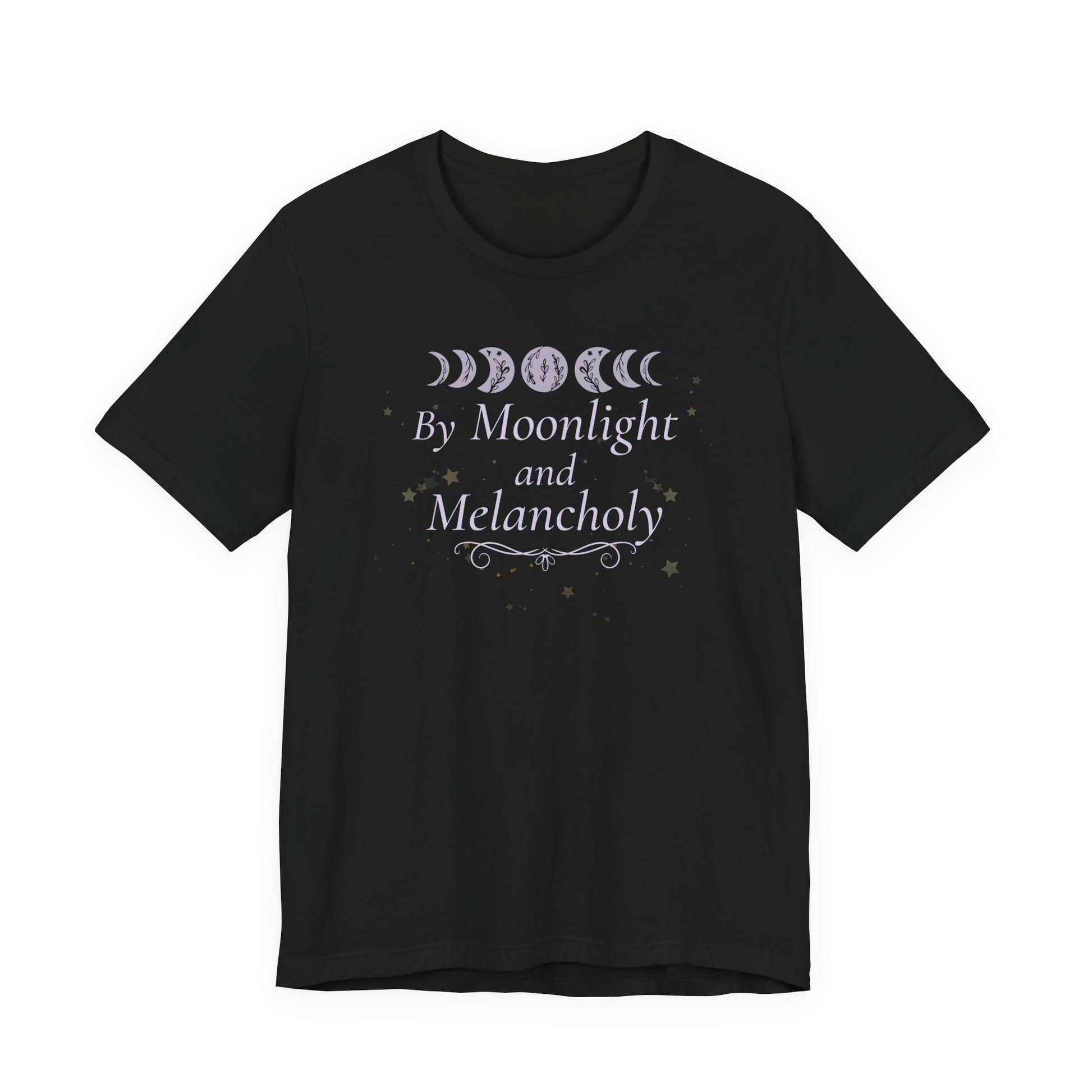 "By Moonlight and Melancholy" - A design for the dreamer who walks beneath sorrowful stars. By Moonlight and Melancholy captures the beauty of yearning — that exquisite ache found only in poetry and twilight skies. Printed in violet and off white ink, it shimmers faintly like the edge of a sonnet, lingering long after the moon fades.