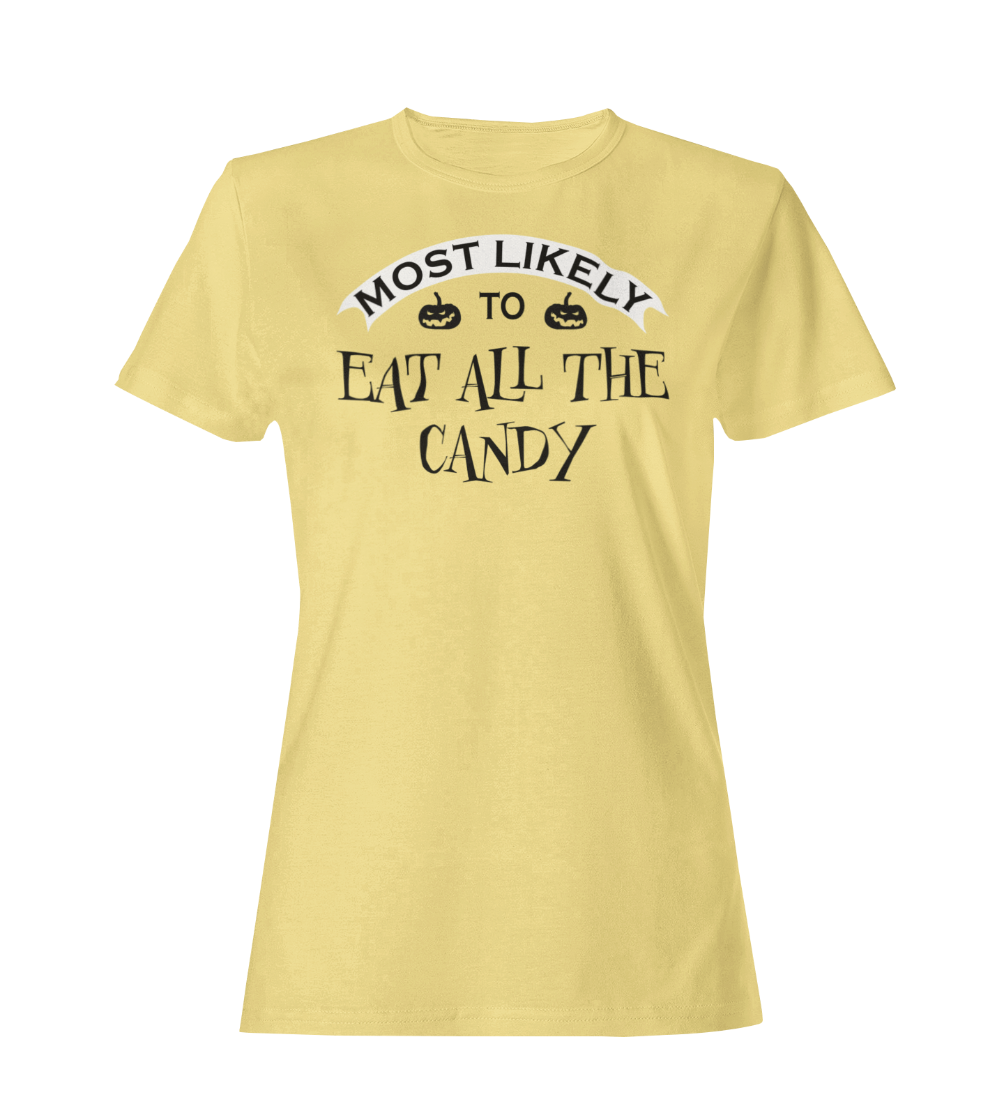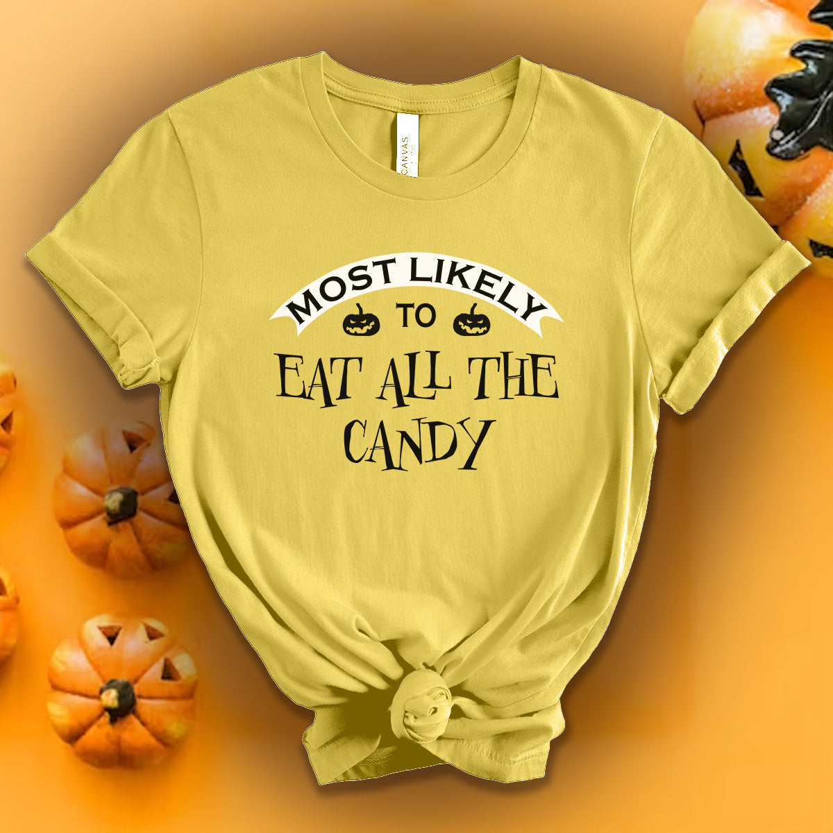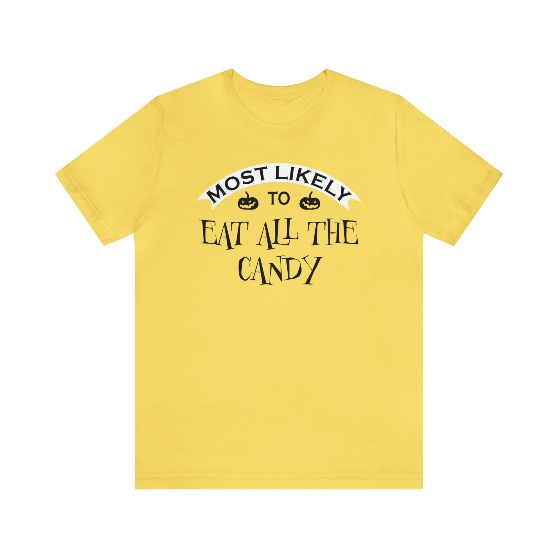 Go Squad! It's time to round up your crew for the Halloween Festivities! This tee says, Most Likely To Eat All The Candy and is printed on Maize Yellow. Every Tee in this squad group comes in a different color, so, you can look like a team, but still express your individuality! Let the spooky fun begin!