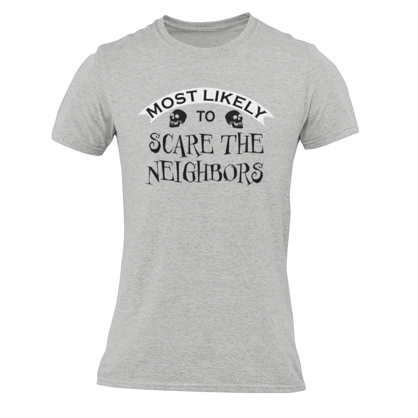 Go Squad! It's time to round up your crew for the Halloween Festivities! This tee says, Most Likely To Scare The Neighbors and is printed on Athletic Heather Grey. Every Tee in this squad group comes in a different color, so, you can look like a team, but still express your individuality! Let the spooky fun begin!
