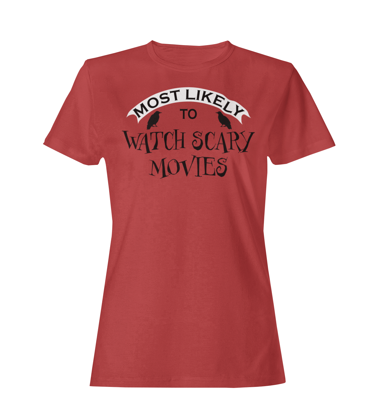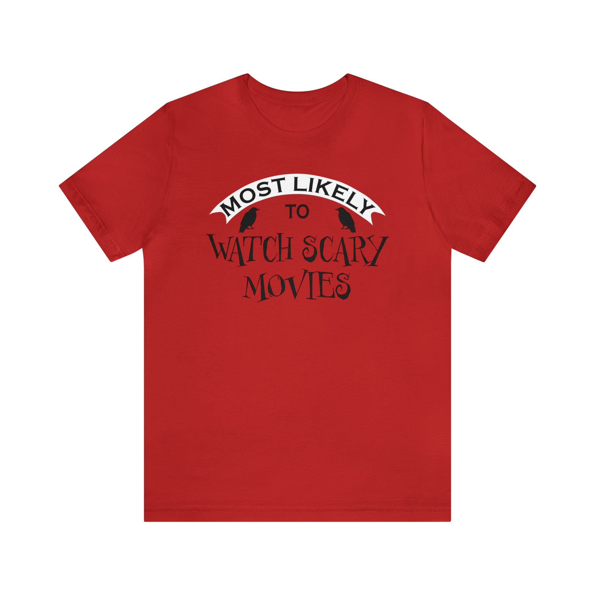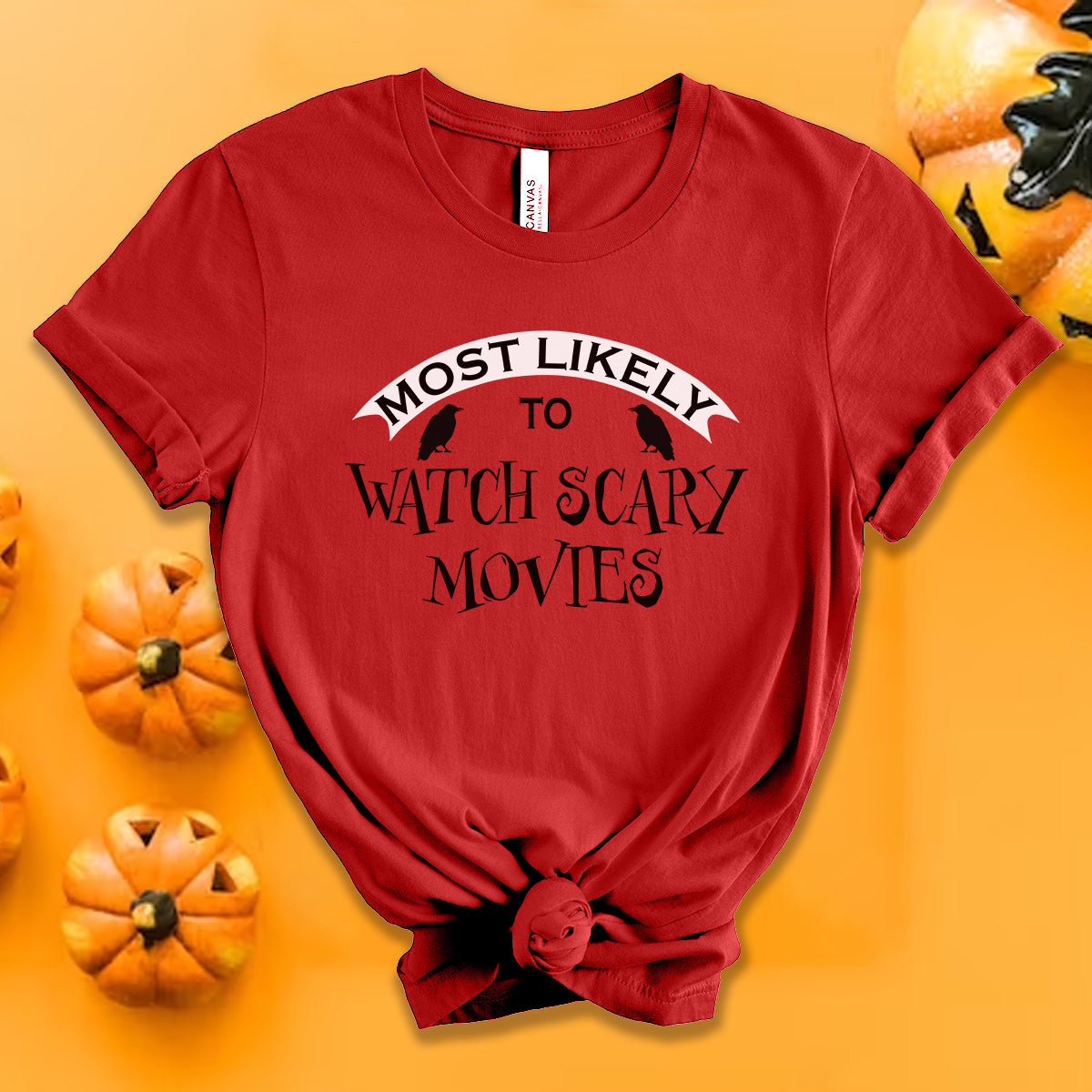 Go Squad! It's time to round up your crew for the Halloween Festivities! This tee says, Most Likely To Watch Scary Movies and is printed on Red. Every Tee in this squad group comes in a different color, so, you can look like a team, but still express your individuality! Let the spooky fun begin!