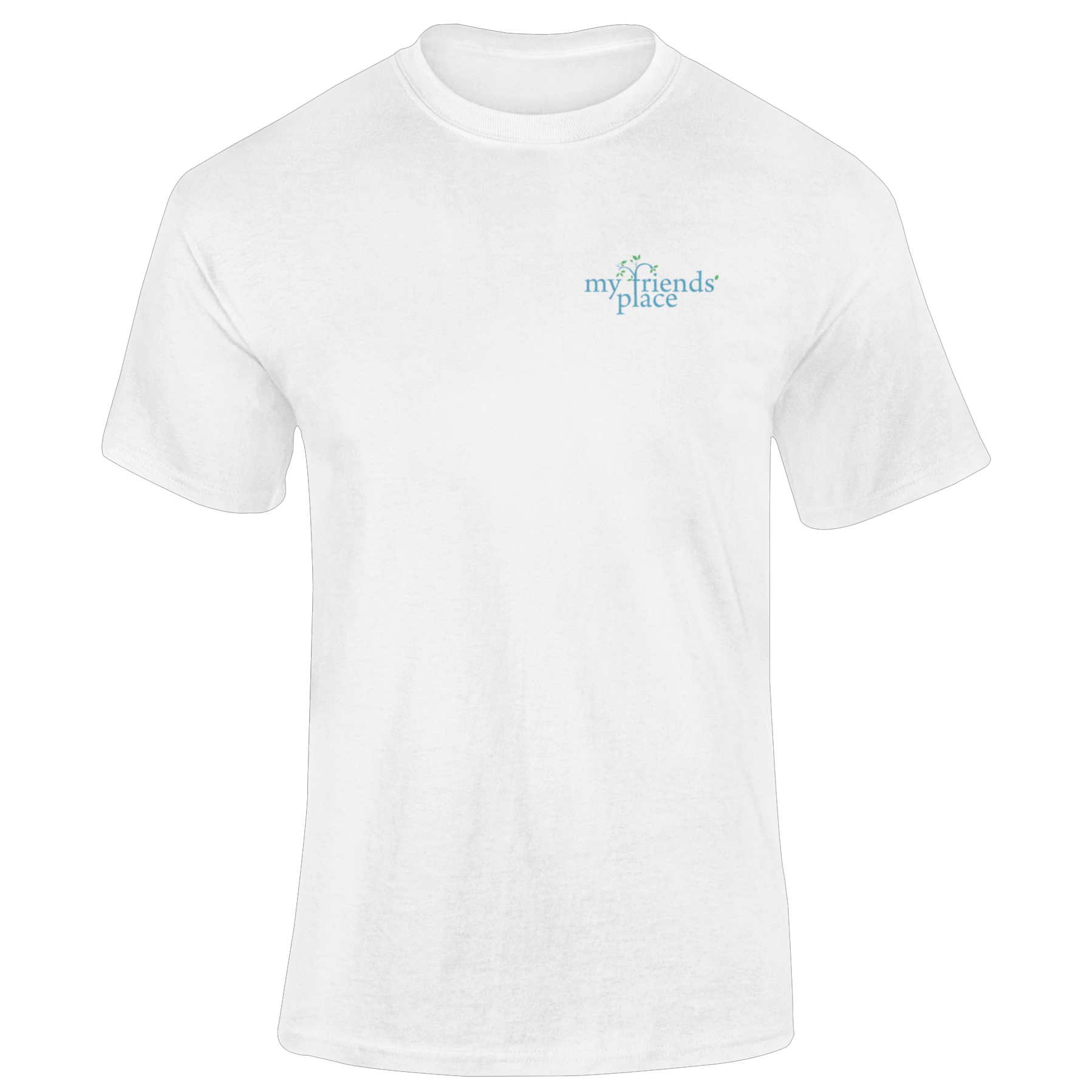 The My Friend's Place classic T-shirt features the logo on the front and a fun and colorful word jumble on the back. Show off all the meaningful support systems offered at the homeless teen shelter while spending your day in comfort wearing this unisex sized Tee. You will find yourself reaching for this easy to wear, medium weight, 100% cotton tee over and over. Design printed in blue and green on a White T-shirt.