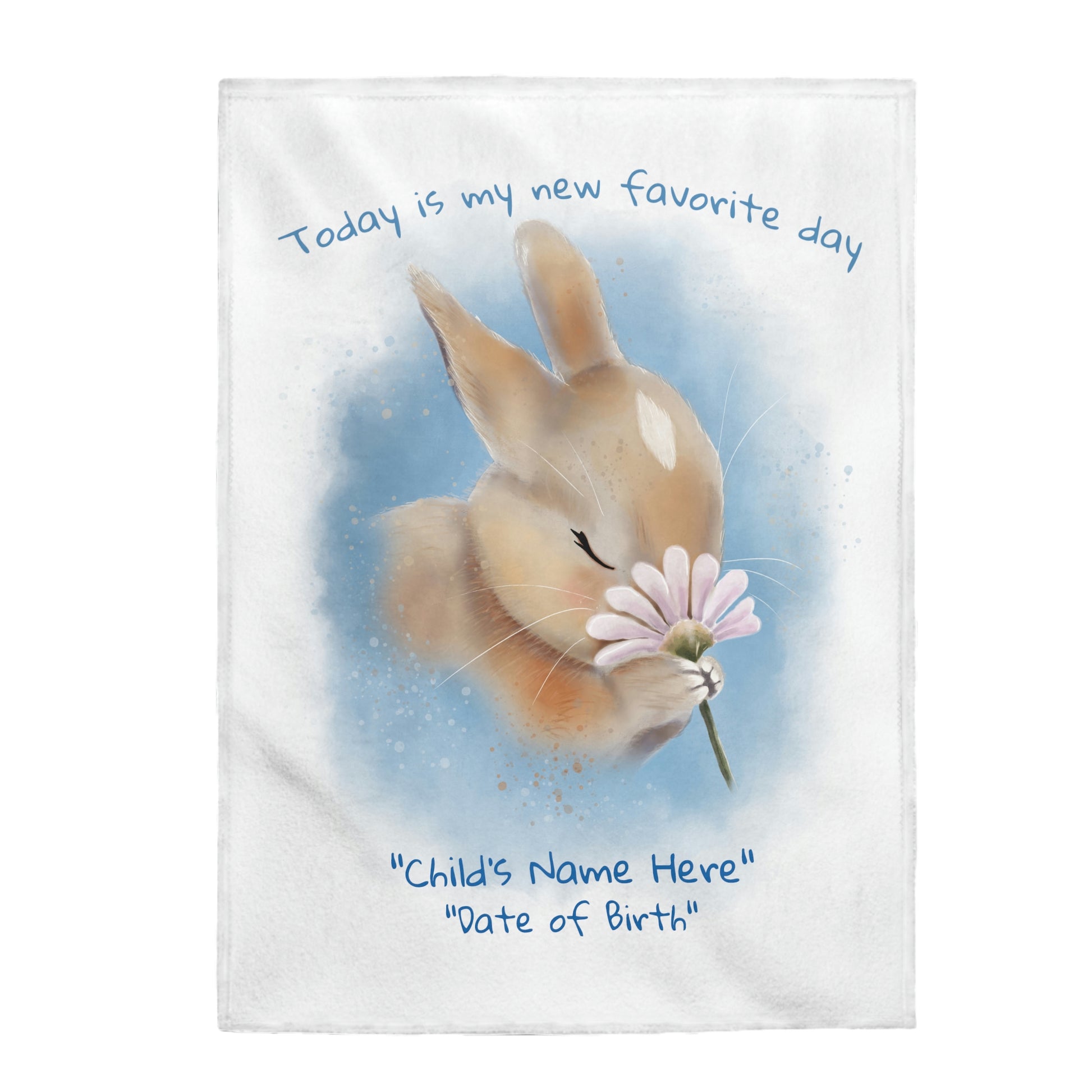 As heartwarming and cozy as Pooh Bear himself, this velveteen blanket personalized with your Child's Name and Birthdate is a perfect way to commemorate your special day, the day your baby is born. The words, "Today is my new favorite day" curves above a young rabbit sniffing a daisy for the first time. Personalize this blanket for yourself or as a gift for the new mom in your life.