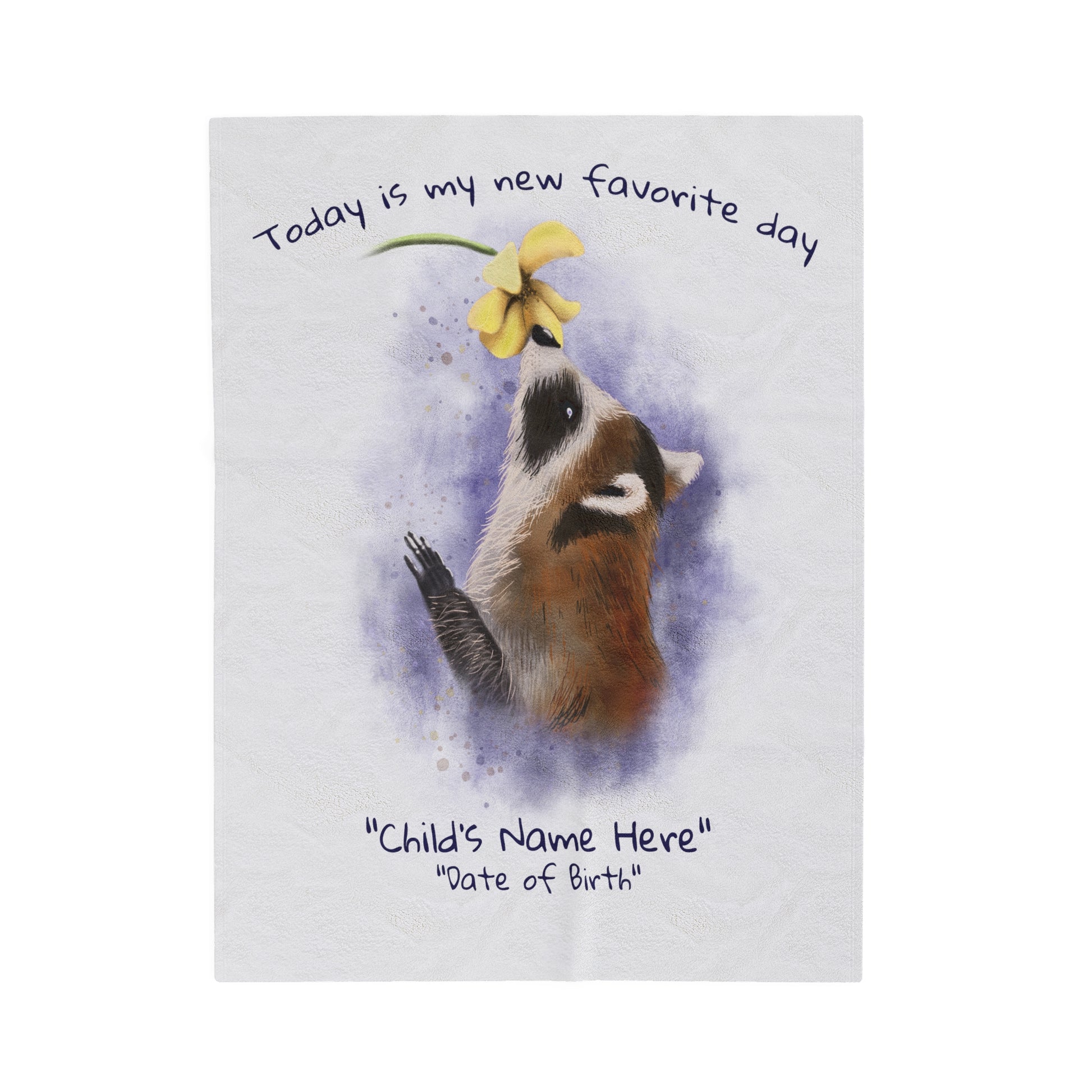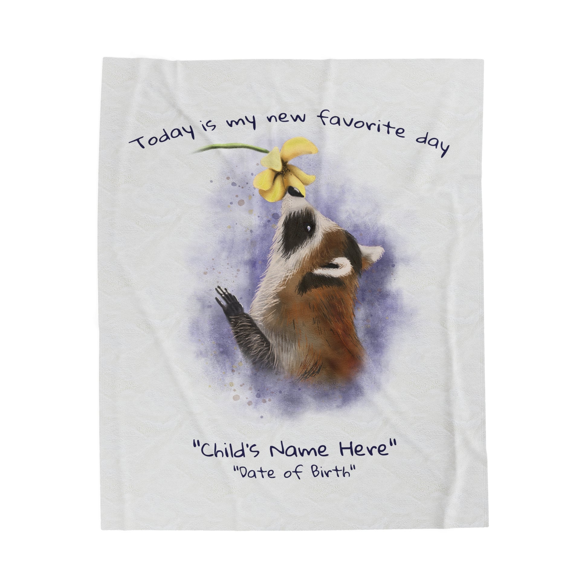 As cuddly as a Raccoon would be if he lived in the 100 Acre Woods, this velveteen blanket personalized with your Child's Name and Birthdate is a perfect way to commemorate your special day, the day your baby is born. The words, "Today is my new favorite day" curves above a young raccoon stretching up to catch the sweet smell of a wildflower. Personalize this blanket for yourself or as a gift for the new mom in your life.