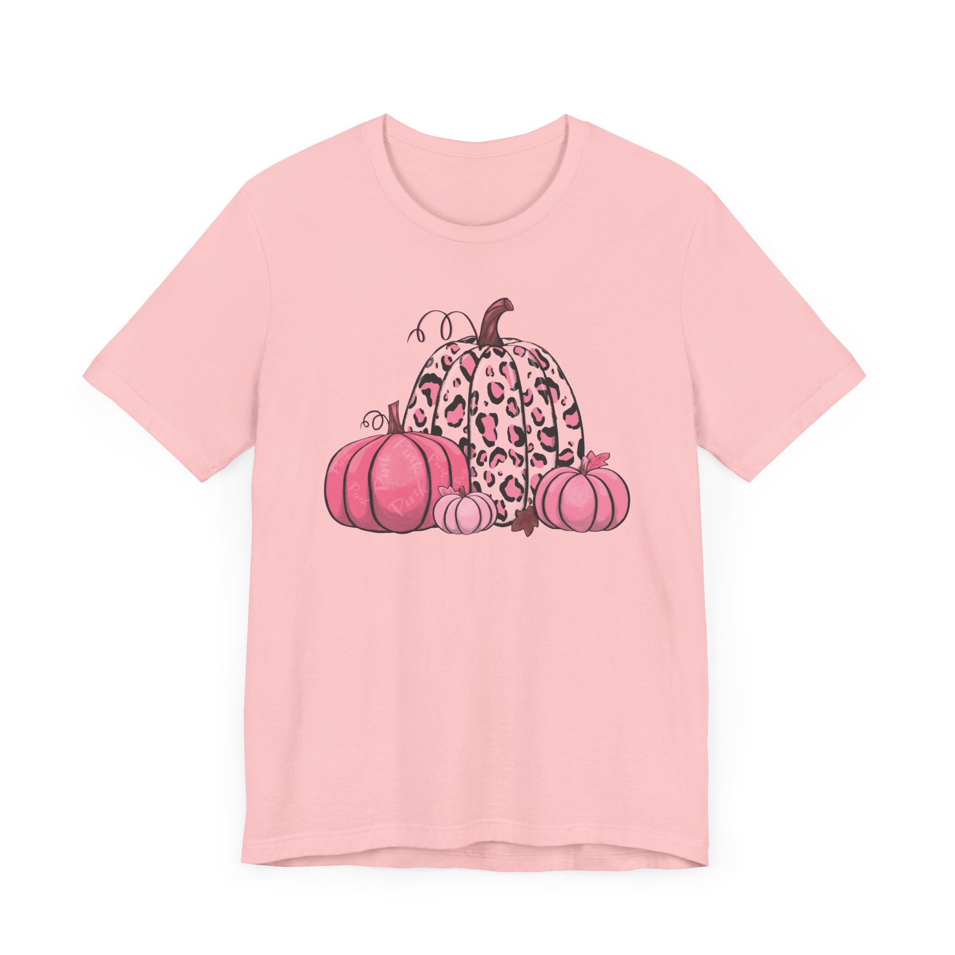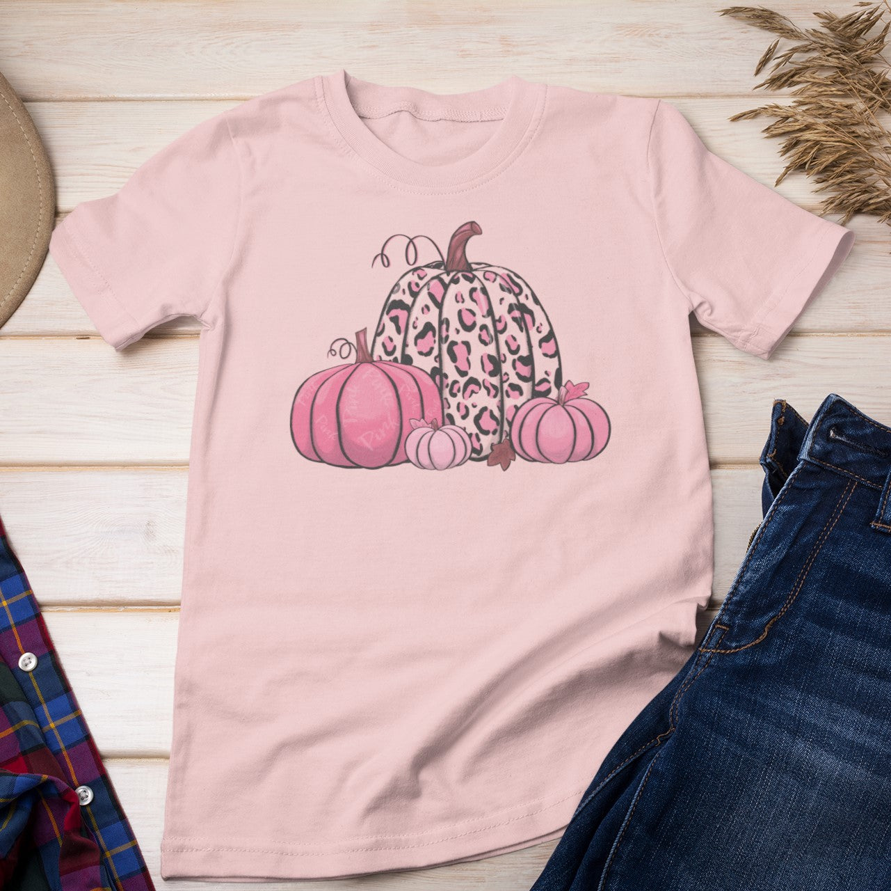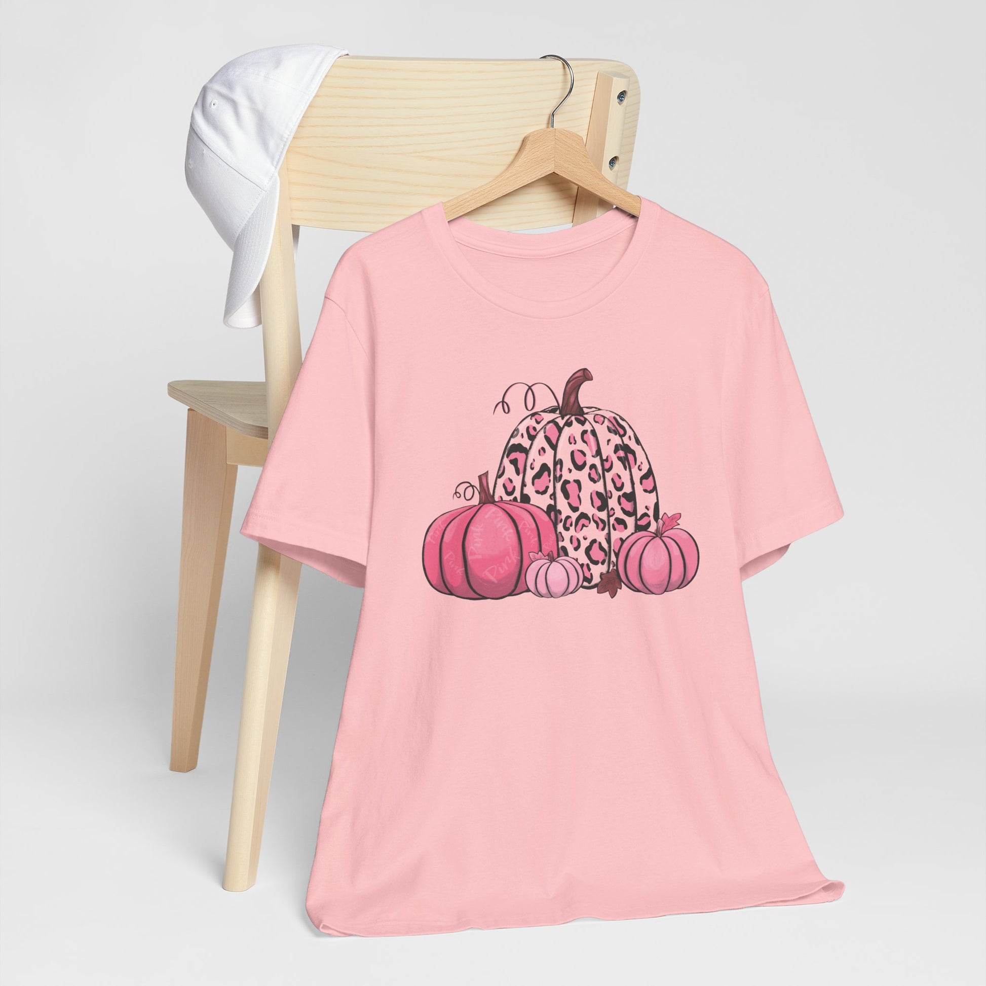 Pink pumpkins with leopard print give off a trendy and playful vibe. This T-shirt is perfect for those who love unique and stylish casual wear. Ideal for Breast Cancer Awareness Events, Office Wear, Teachers, and fall festivities. Wearing pink never felt so fun!