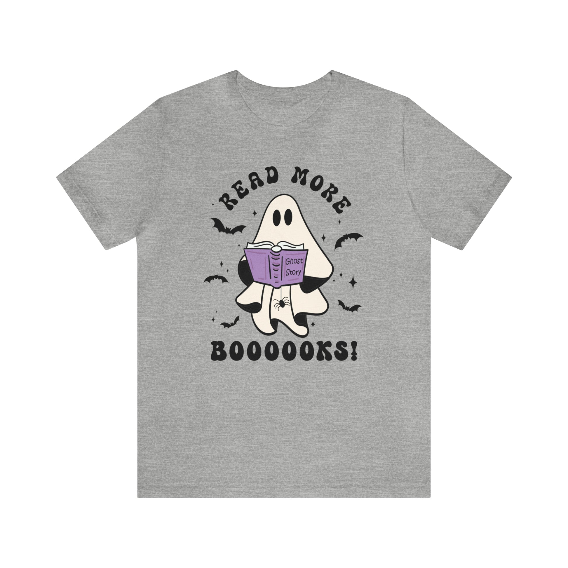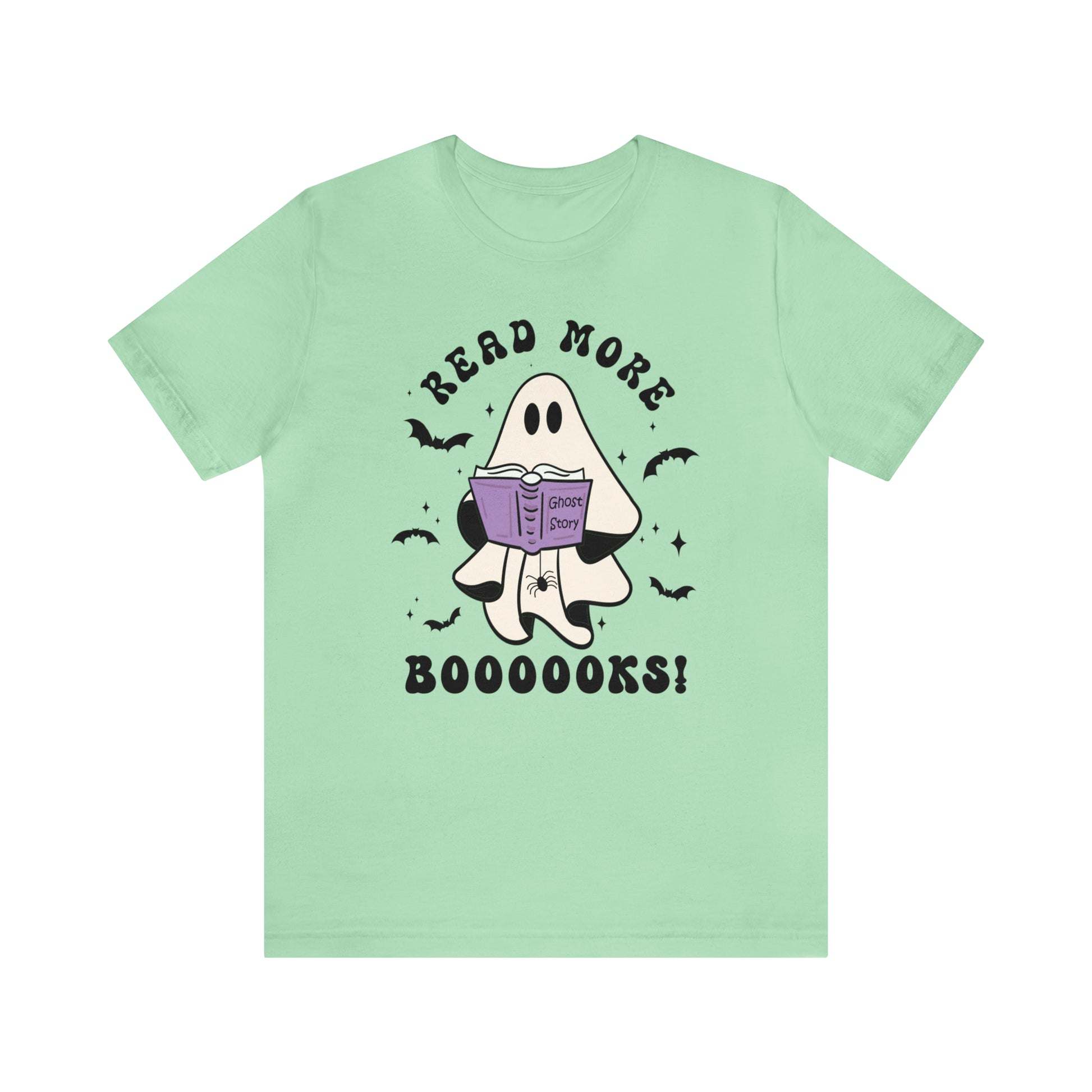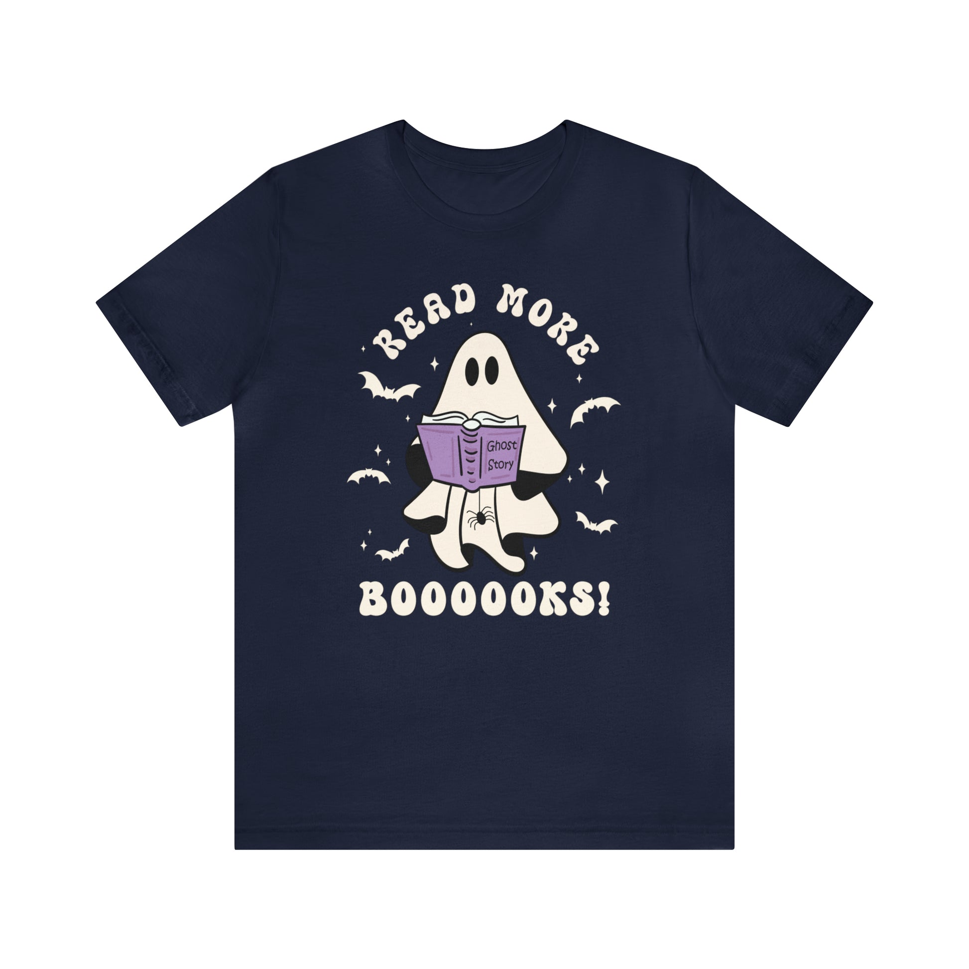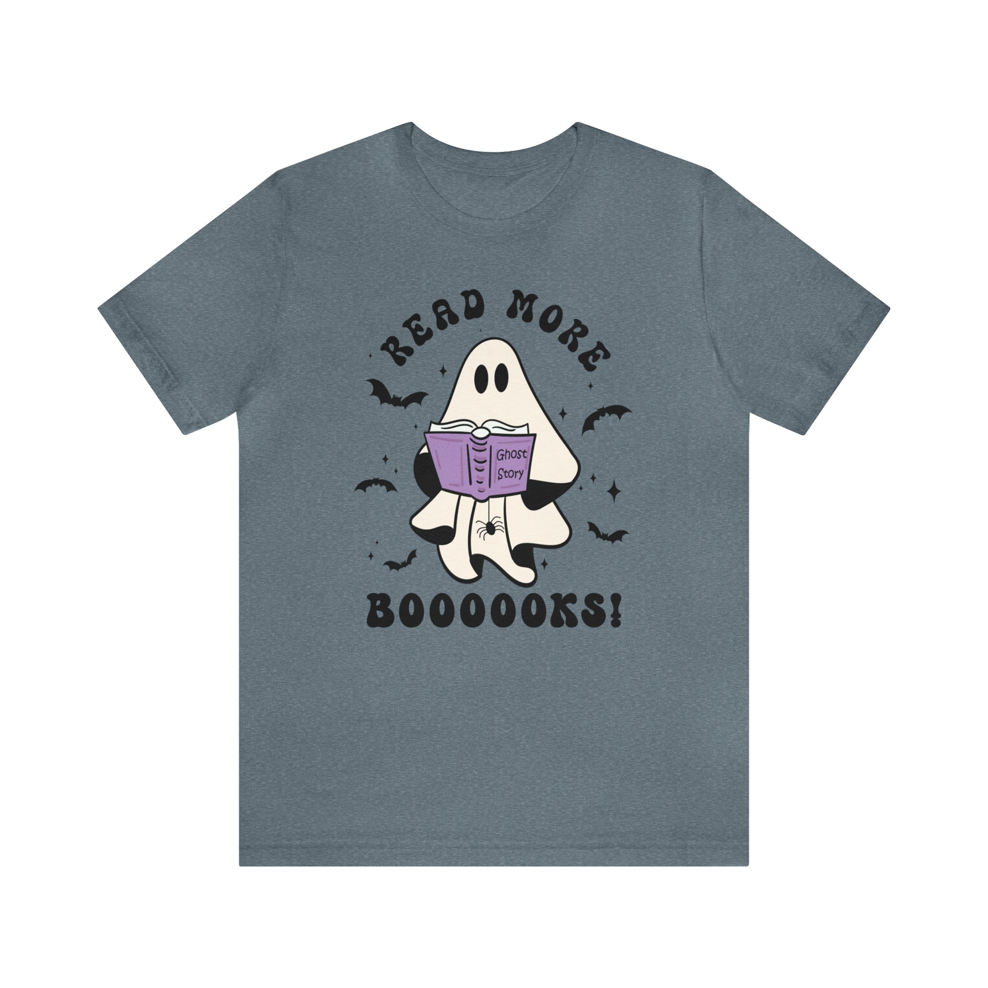 Would a ghost's favorite story really be Ghost Story? A cute and conversational ghost with his spider friend says, "Read More Booooks!" This retro style T-shirt will keep you trendy and bookish at the same time! Perfect for your librarian friend, bookish friend, or YOU! This cute design is available on Vintage Black, Navy, Athletic Heather, Heather Slate, or Mint! Bring on the best of spooky season!