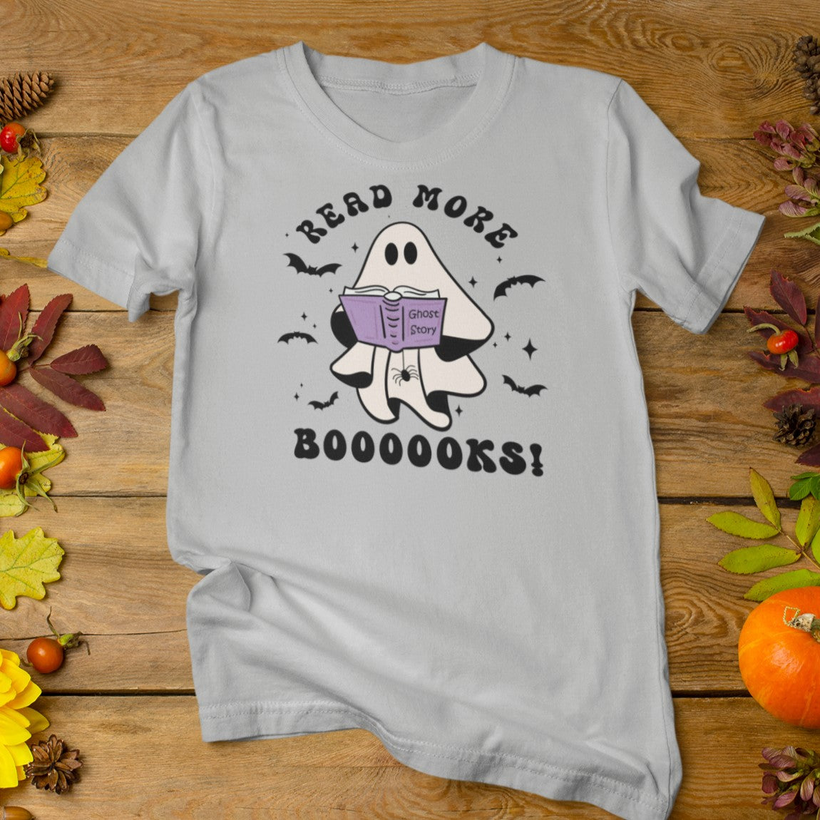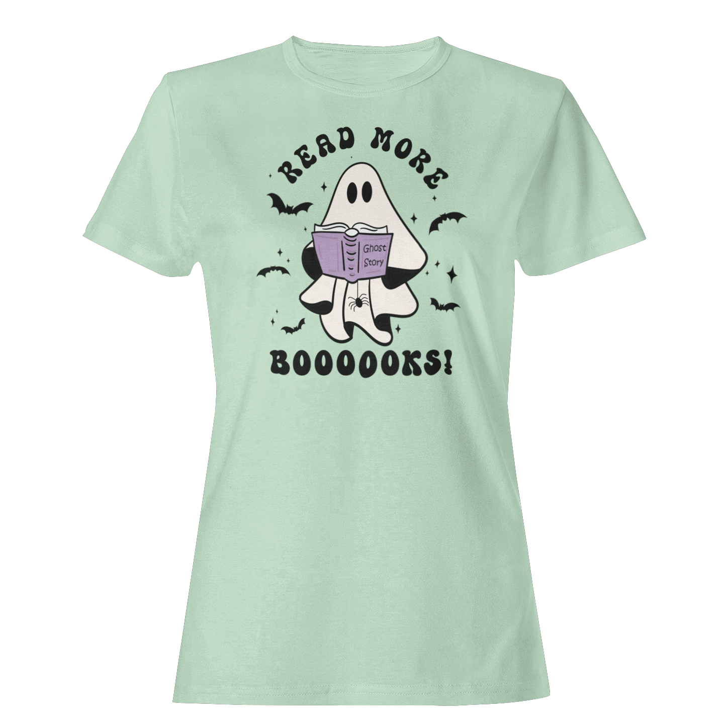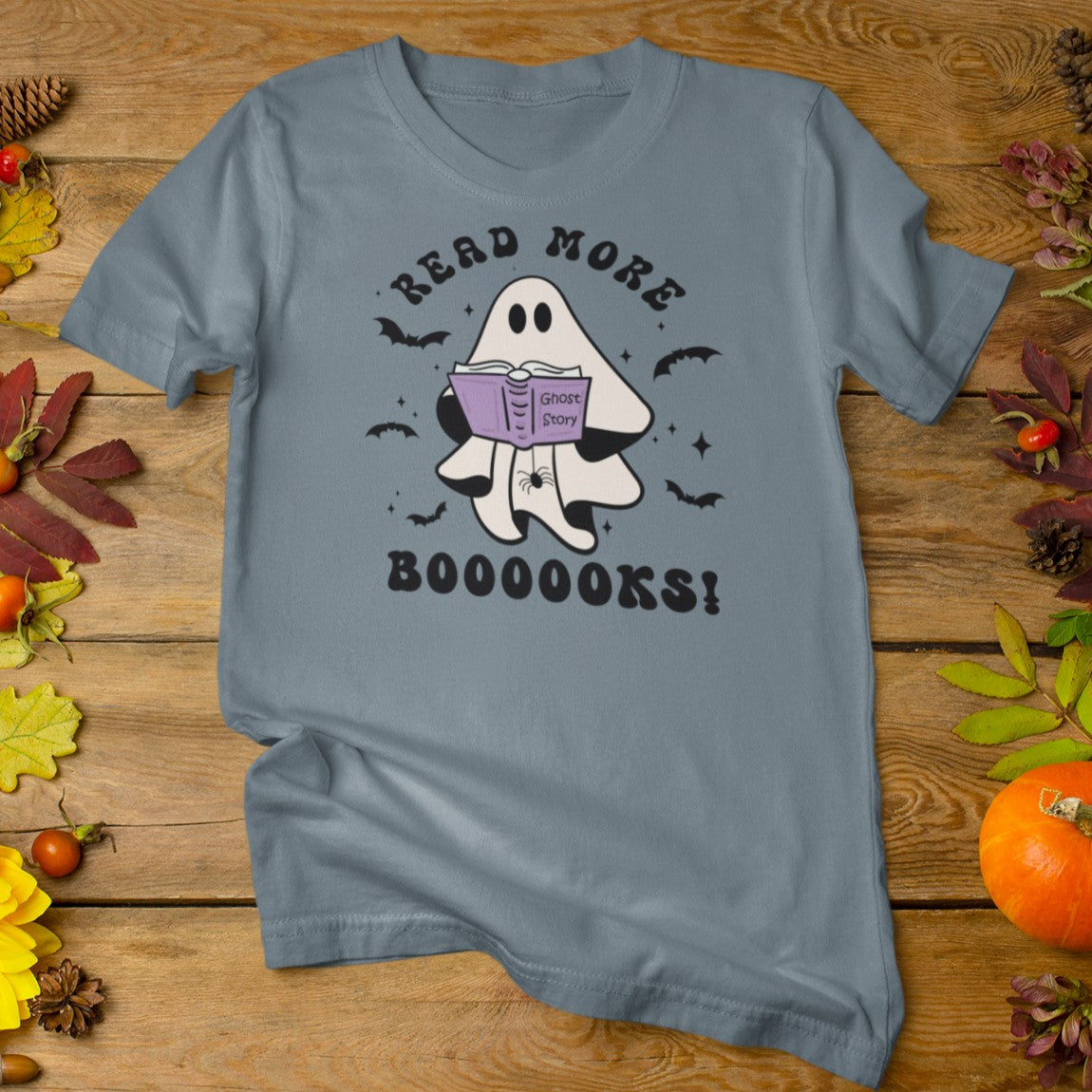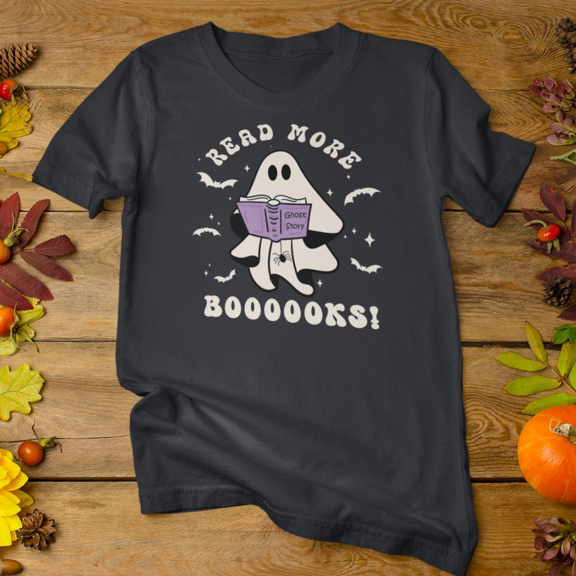 Would a ghost's favorite story really be Ghost Story? A cute and conversational ghost with his spider friend says, "Read More Booooks!" This retro style T-shirt will keep you trendy and bookish at the same time! Perfect for your librarian friend, bookish friend, or YOU! This cute design is available on Vintage Black, Navy, Athletic Heather, Heather Slate, or Mint! Bring on the best of spooky season!