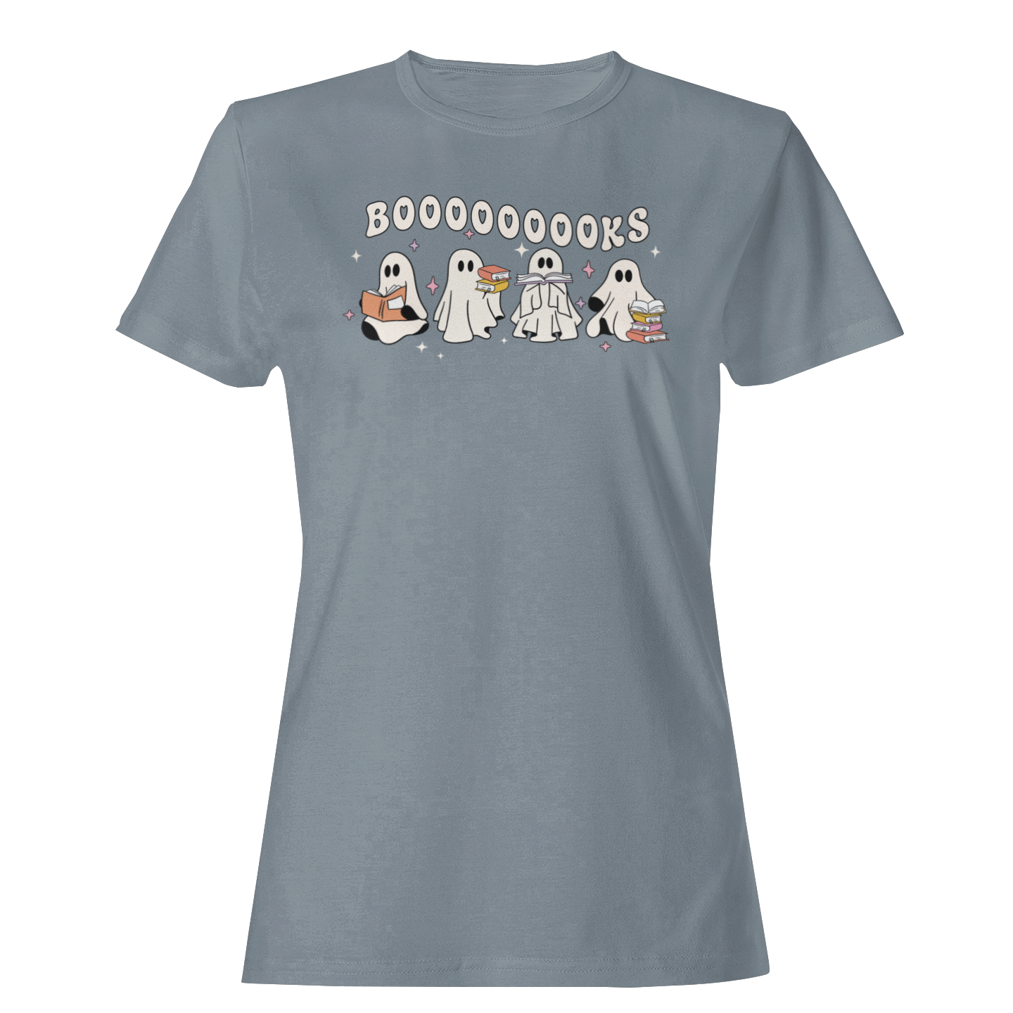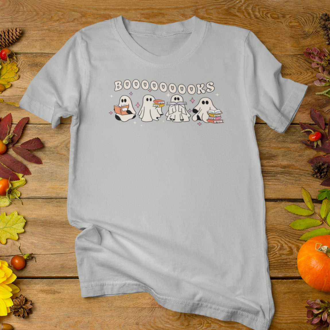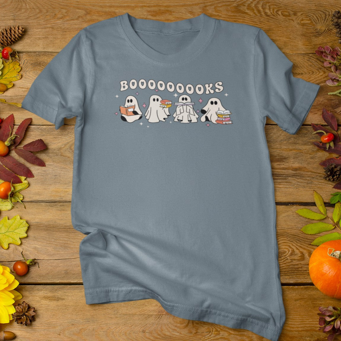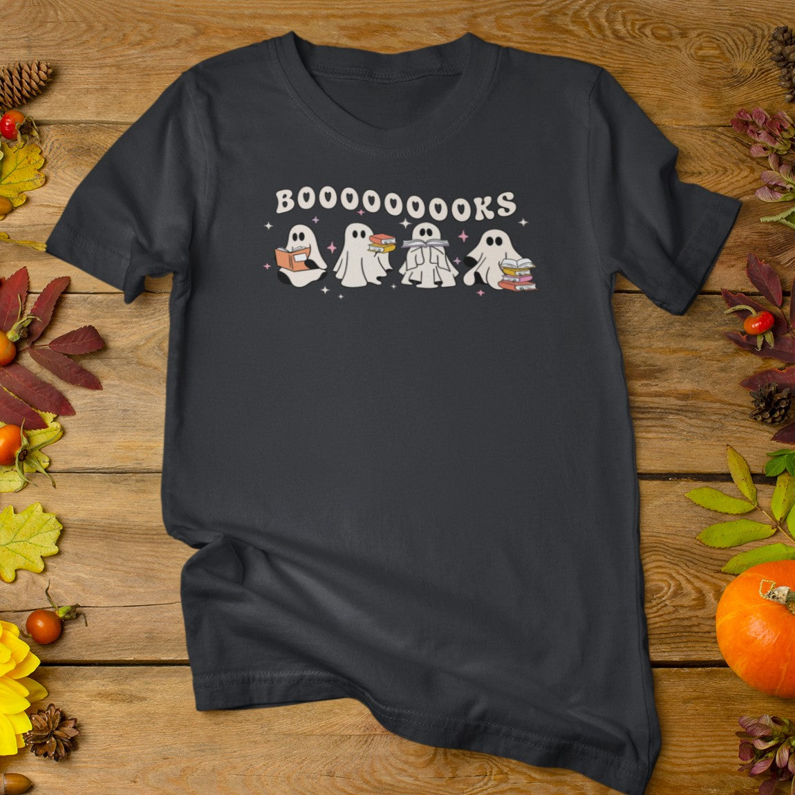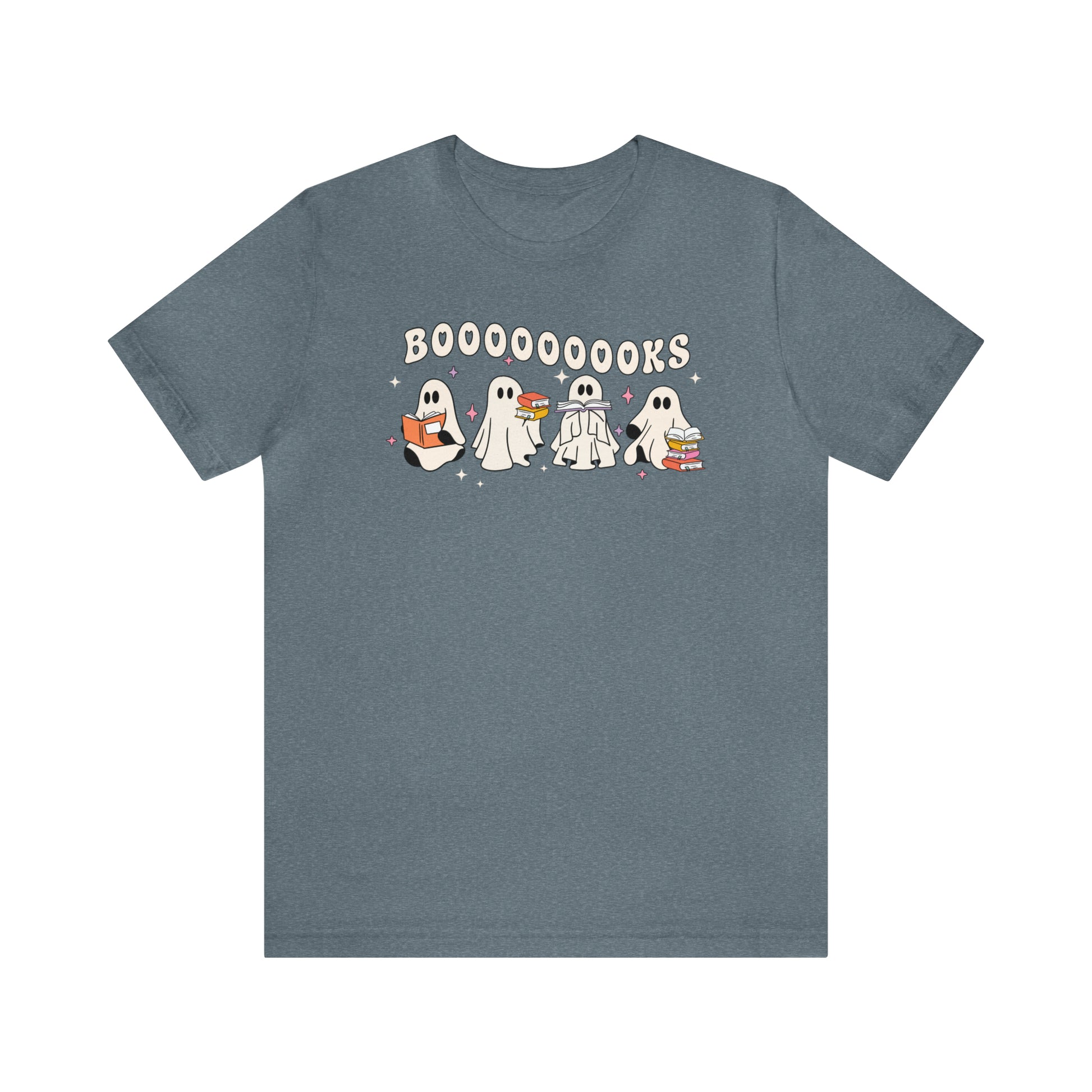 Four spooky ghosts in a row enjoying their delicious ghostly reads! This retro style T-shirt will keep you trendy and bookish at the same time! The text reads, "Booooooooks" and is sure to frighten anyone disrupting your reading time! This cute design is available on Vintage Black, Navy, Heather Grey, or Heather Slate. Hello spooky season!