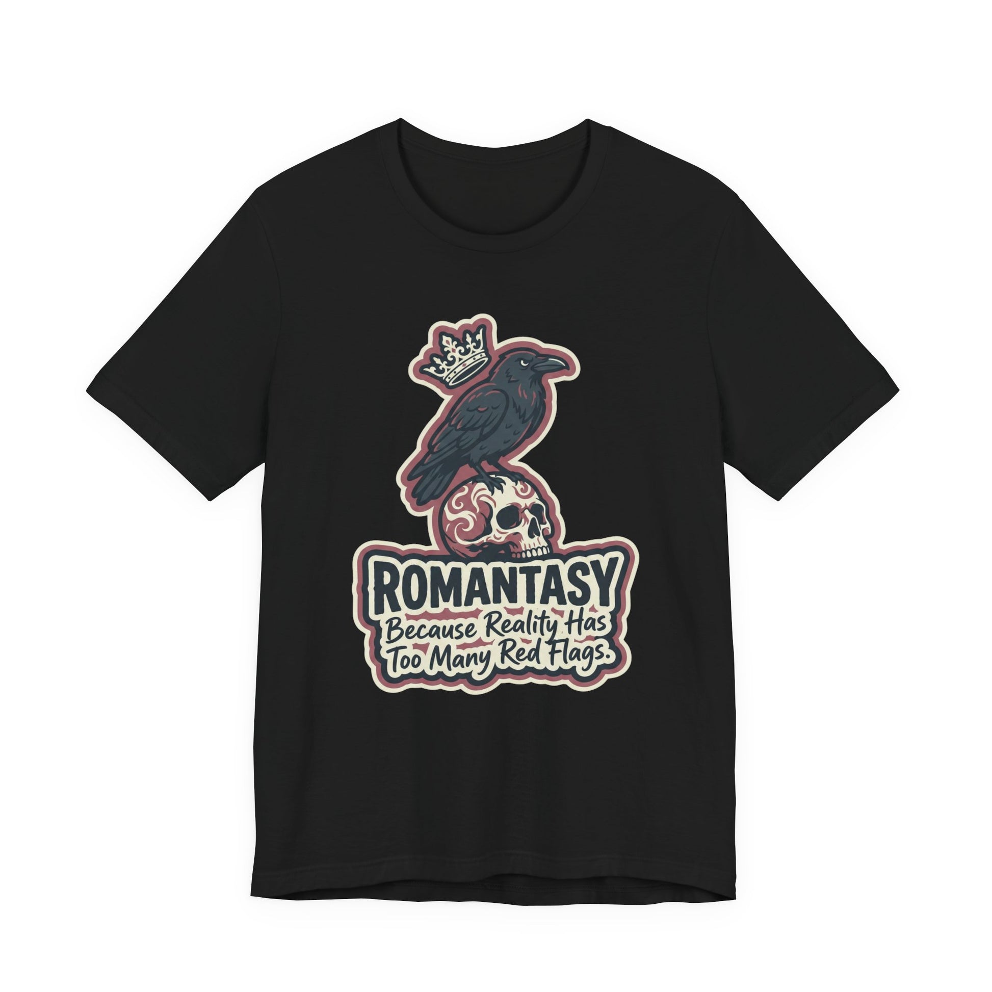 "Romantasy: Because Reality Has Too Many Red Flags" A grumpy raven crowned like petty royalty, perched atop a skull with the air of someone who's absolutely done with dating apps and meet-cutes. Bold typography delivers the truth we're all thinking: sometimes fictional love interests are simply superior—they're brooding, immortal, and mercifully free of commitment issues. Sticker-style illustration with thick outer strokes and maximum attitude. Part of our Gothic Valentine Collection, this design speaks for everyone who'd rather swoon over morally gray fantasy characters than suffer through another disappointing reality. Printed in charcoal, bone white, and a pop of dusty rose on black.