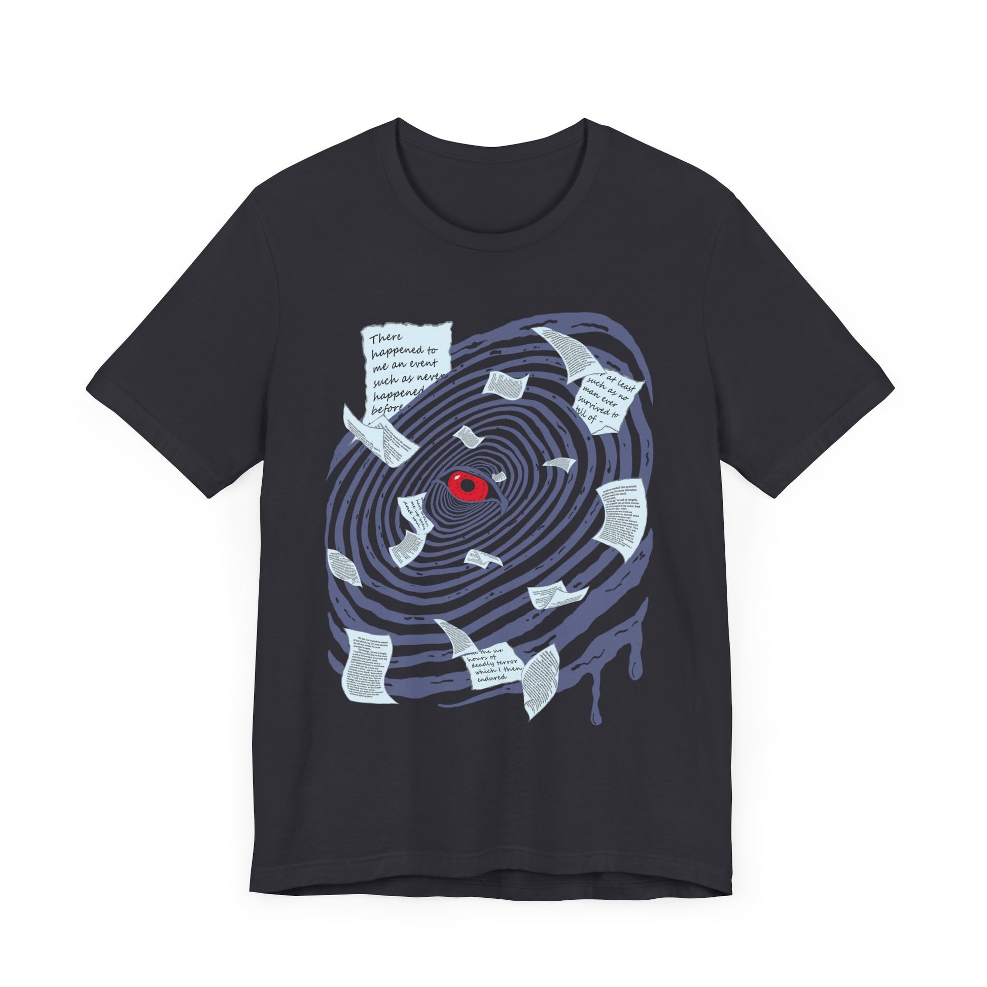 You stand on the precipice, chaos whirls around you, is it all in your imagination? Share your dizzying world when you wear the Semantic Spiral T-shirt! Featuring an eye in the center of a vortex of thoughts and the phrase "There happened to me an event such as never happened before to mortal man-or at least such as no man ever survived to tell of-and the six hours of deadly terror which I then endured have broken me up body and soul." Inspired by A Descent into the Maelstrom by Edgar Allan Poe, this crimson on deep blue haze design swirled from the musings of our in-house artists. Beware, the people around you might become lightheaded staring at your hypnotic garb.