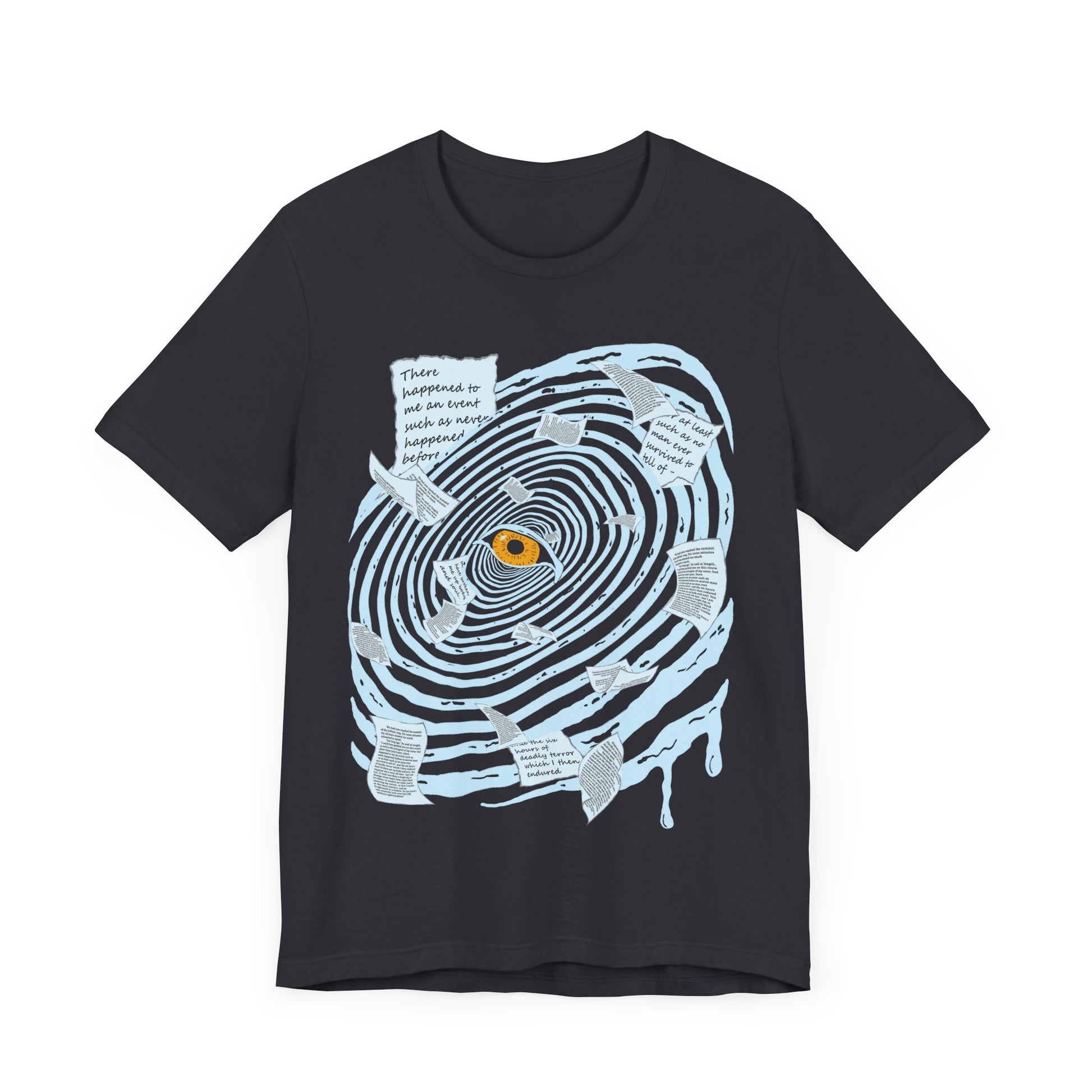You stand on the precipice, chaos whirls around you, is it all in your imagination? Share your dizzying world when you wear the Semantic Spiral T-shirt! Featuring an eye in the center of a vortex of thoughts and the phrase "There happened to me an event such as never happened before to mortal man-or at least such as no man ever survived to tell of-and the six hours of deadly terror which I then endured have broken me up body and soul." Inspired by A Descent into the Maelstrom by Edgar Allan Poe, this tangerine on icy blue design swirled from the musings of our in-house artists. Beware, the people around you might become lightheaded staring at your hypnotic garb.