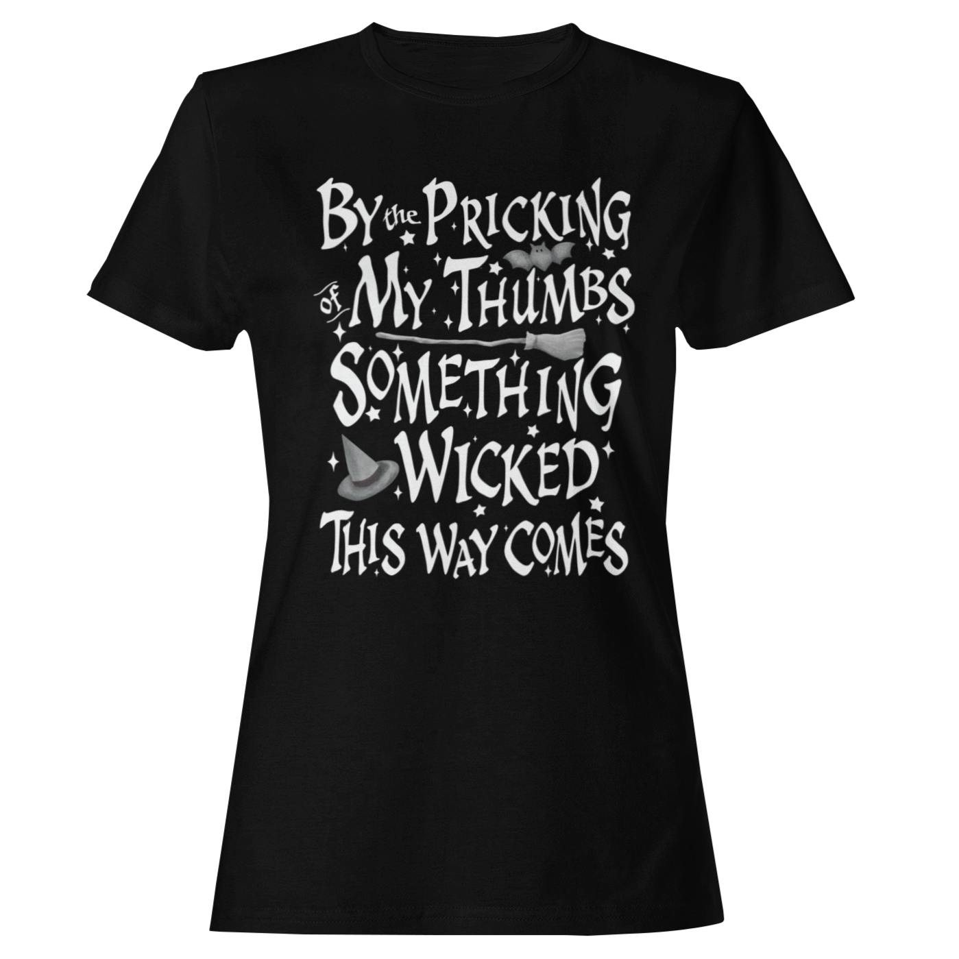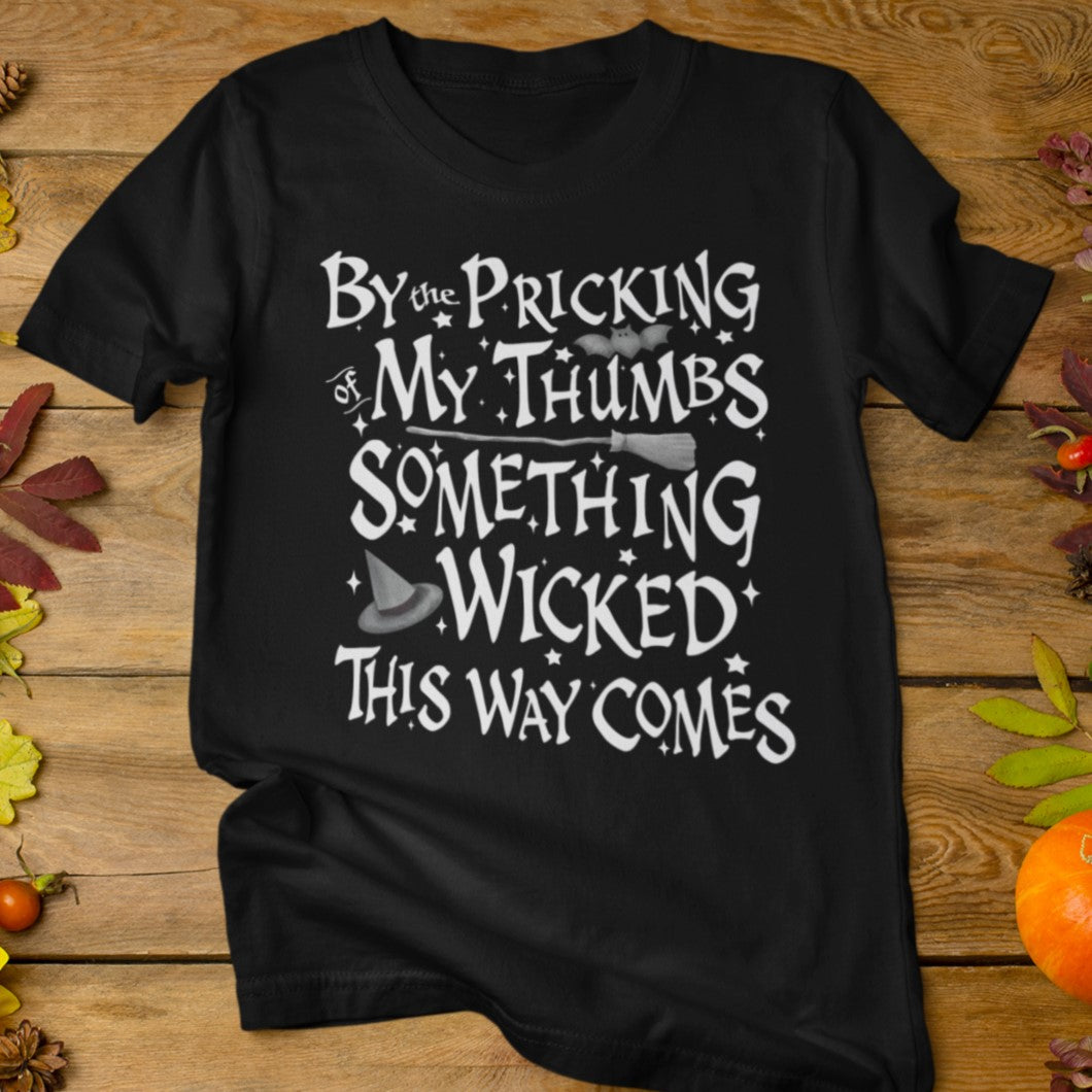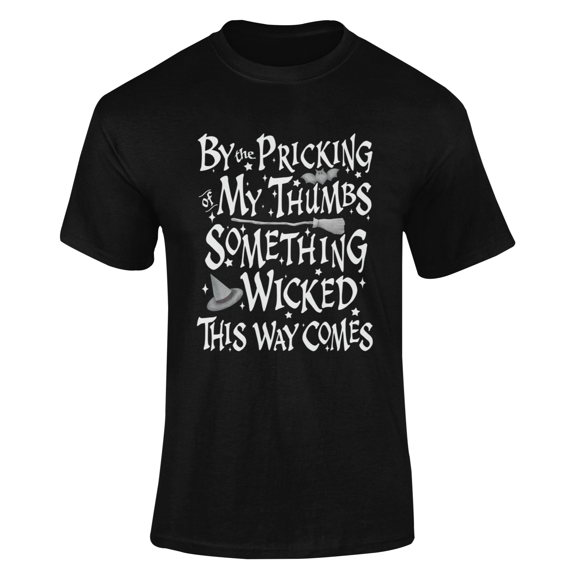 What do the three witches say? "By the Pricking of My Thumbs, Something Wicked This Way Comes" Beware the chanting, unless you are one of the witches! A must have T-shirt for the spooky season and beyond! This Tee would make the perfect gift for your bookish friend, librarian, or avid Shakespeare fan! Tee available on Black. You will enjoy all day comfort in the soft, lightweight Unisex sized T-shirt. A fun addition to your wardrobe!