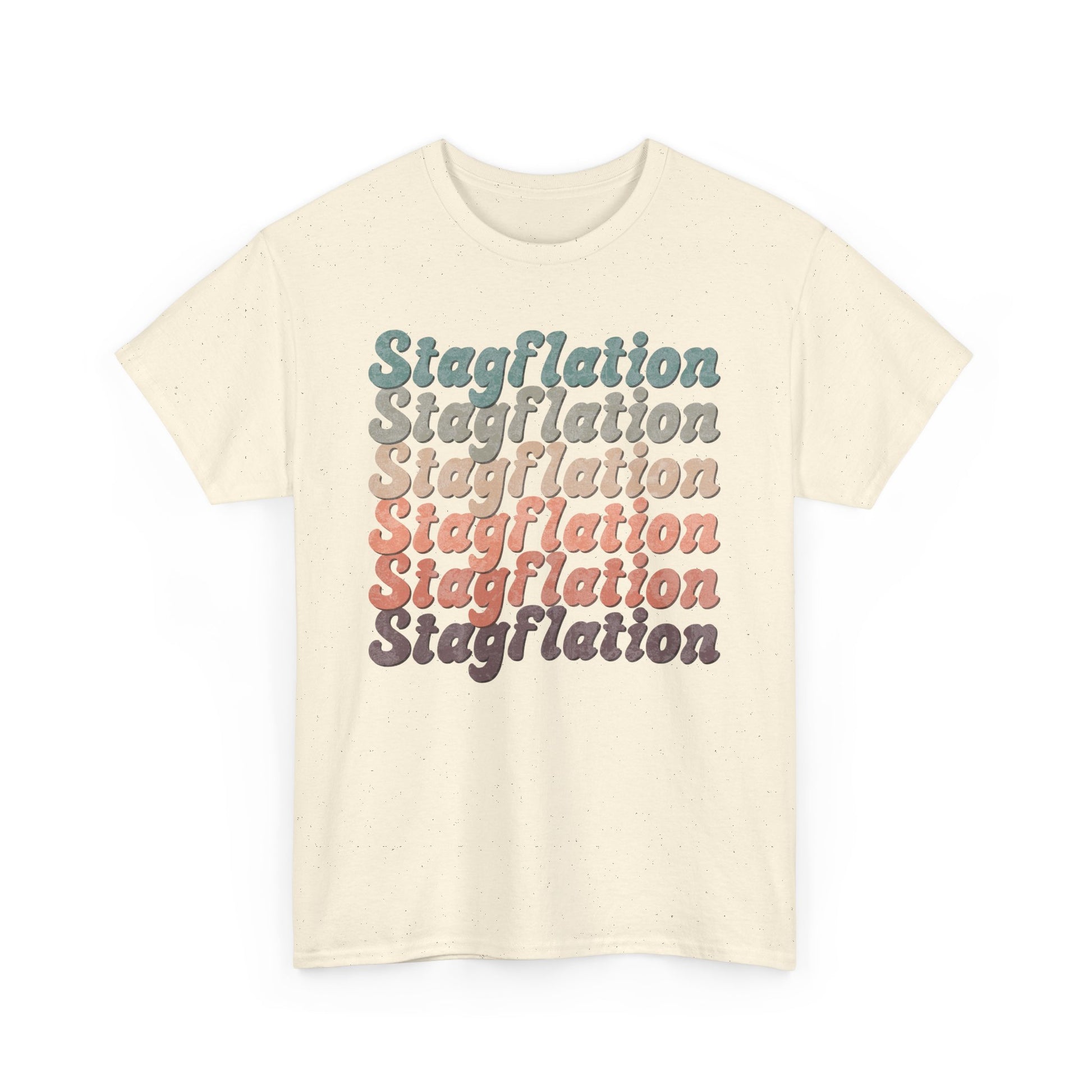 A fringed jacket and a 'fiver' in your wallet? Snaps for keepin' it real. Let's chant 'Stagflation' together as it marches down your Tee in earthy blues and oranges. Your wardrobe will be stoked to welcome this comfortable, unisex shirt. The print is gently distressed for that casual throwback look. This medium weight, 100% cotton tee is a far out look on everyone.