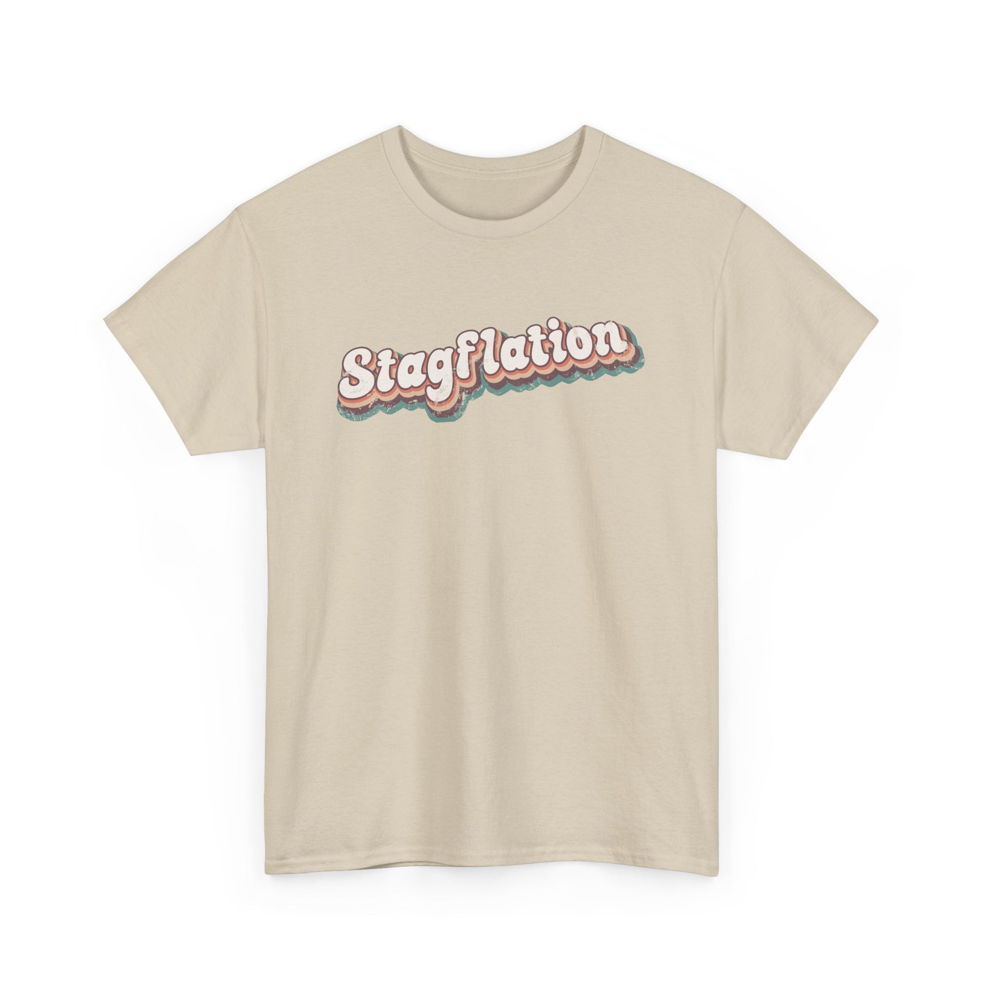 Grab your platform shoes and call it like you see it! A sassy 'Stagflation' angles across your Tee in earthy blues and oranges. Your wardrobe will go bananas when this comfortable, unisex shirt comes to stay. The print is gently distressed for that casual throwback look. This slammin', medium weight, 100% cotton tee wears well on everyone.