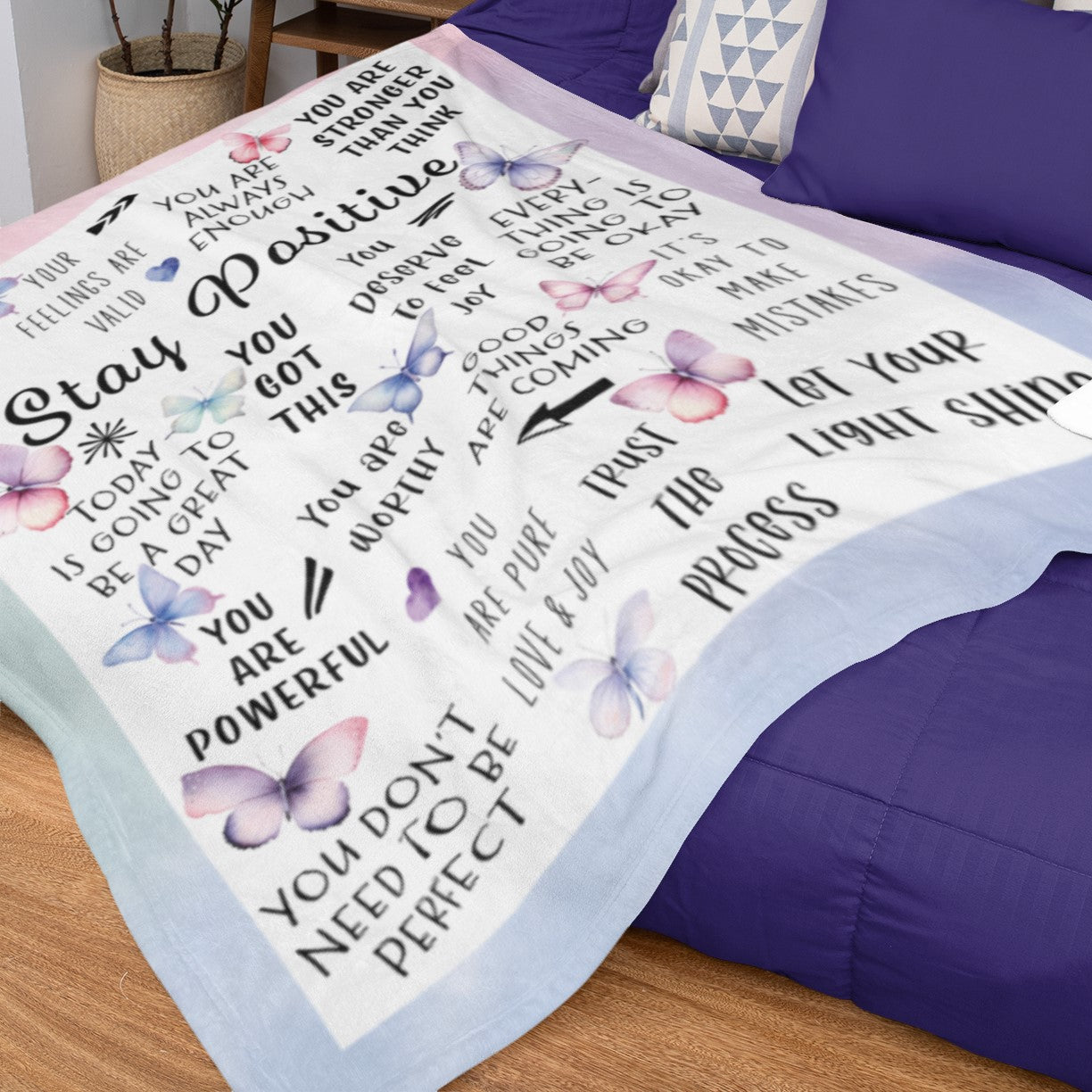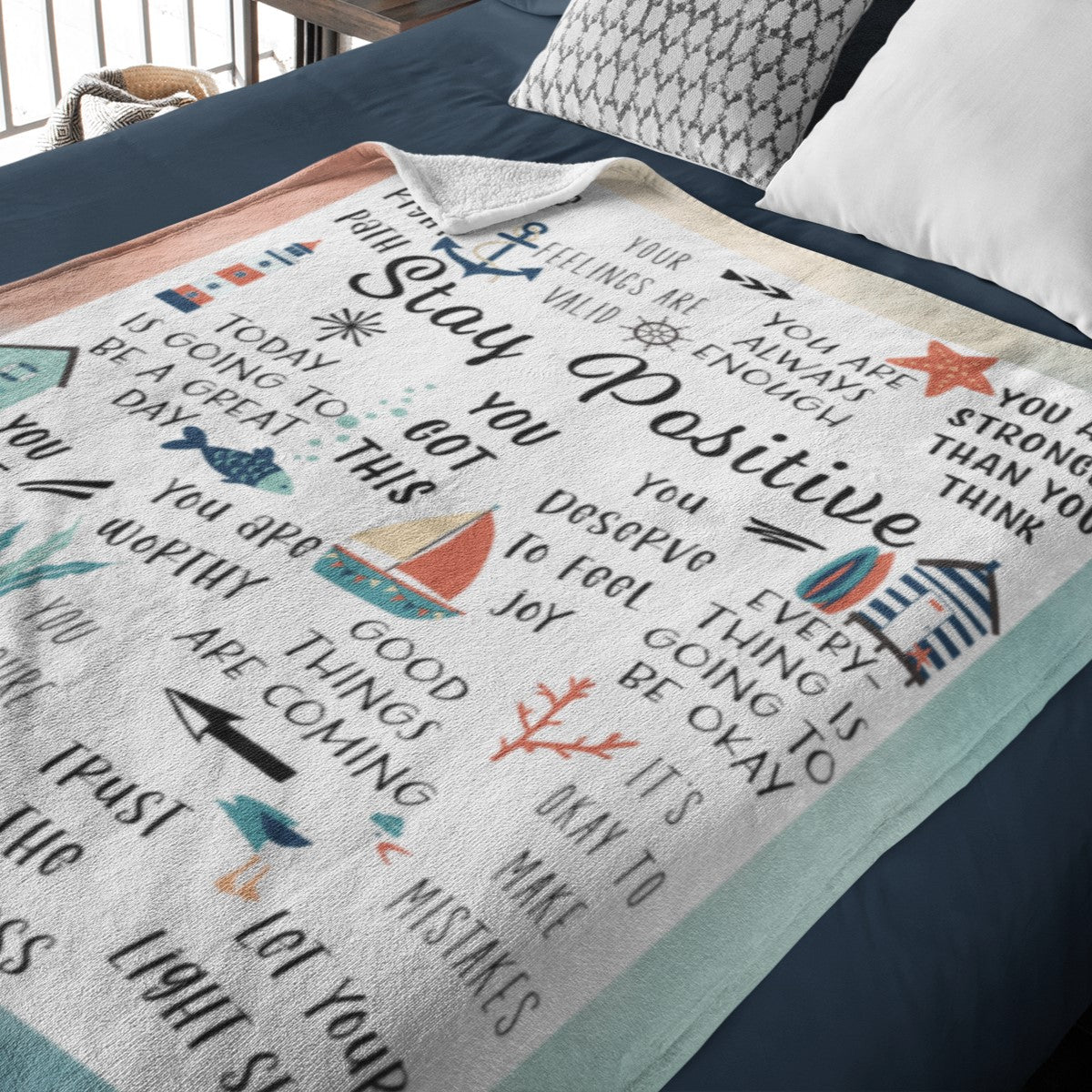 Give the gift of coziness this season with the Stay Positive Velveteen Plush or Sherpa blanket. Imagine their eyes lighting up with joy when they unwrap this oh-so-soft blanket featuring several short sayings giving nothing but positive vibes such as, "You are stronger than you think" and "You deserve to feel joy" Choose between Green Trees, Butterflies, or Nautical design in the Velveteen Plush or Sherpa style blankets. Available in two sizes, Medium 50 x 60 inches or Large 60 x 80 inches, you are sure to find the perfect fit for you and yours.