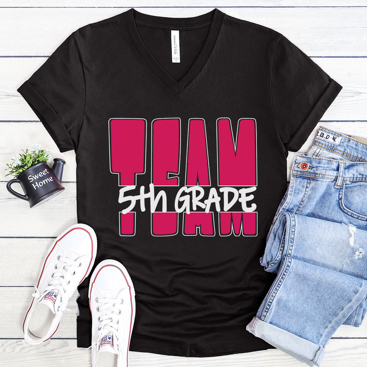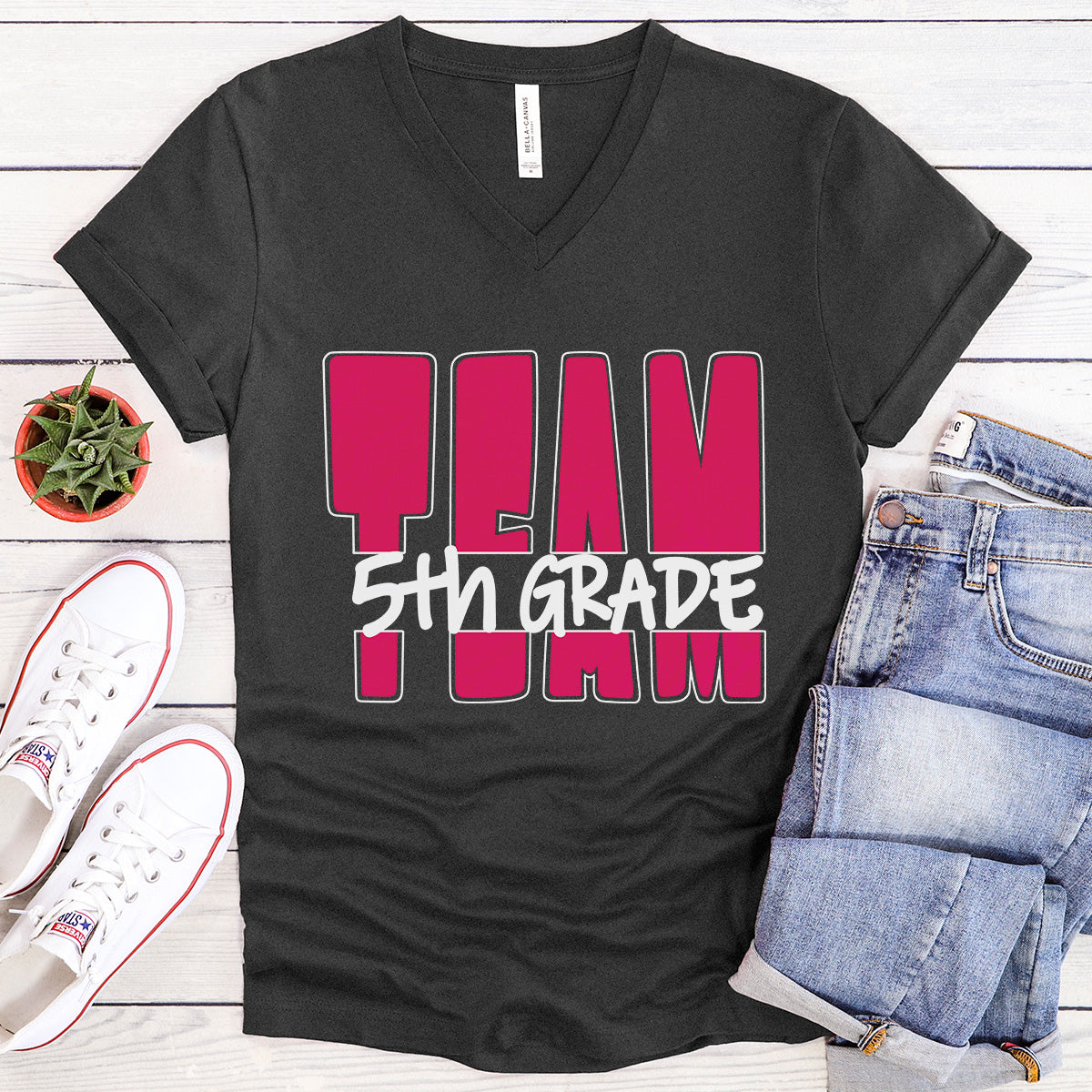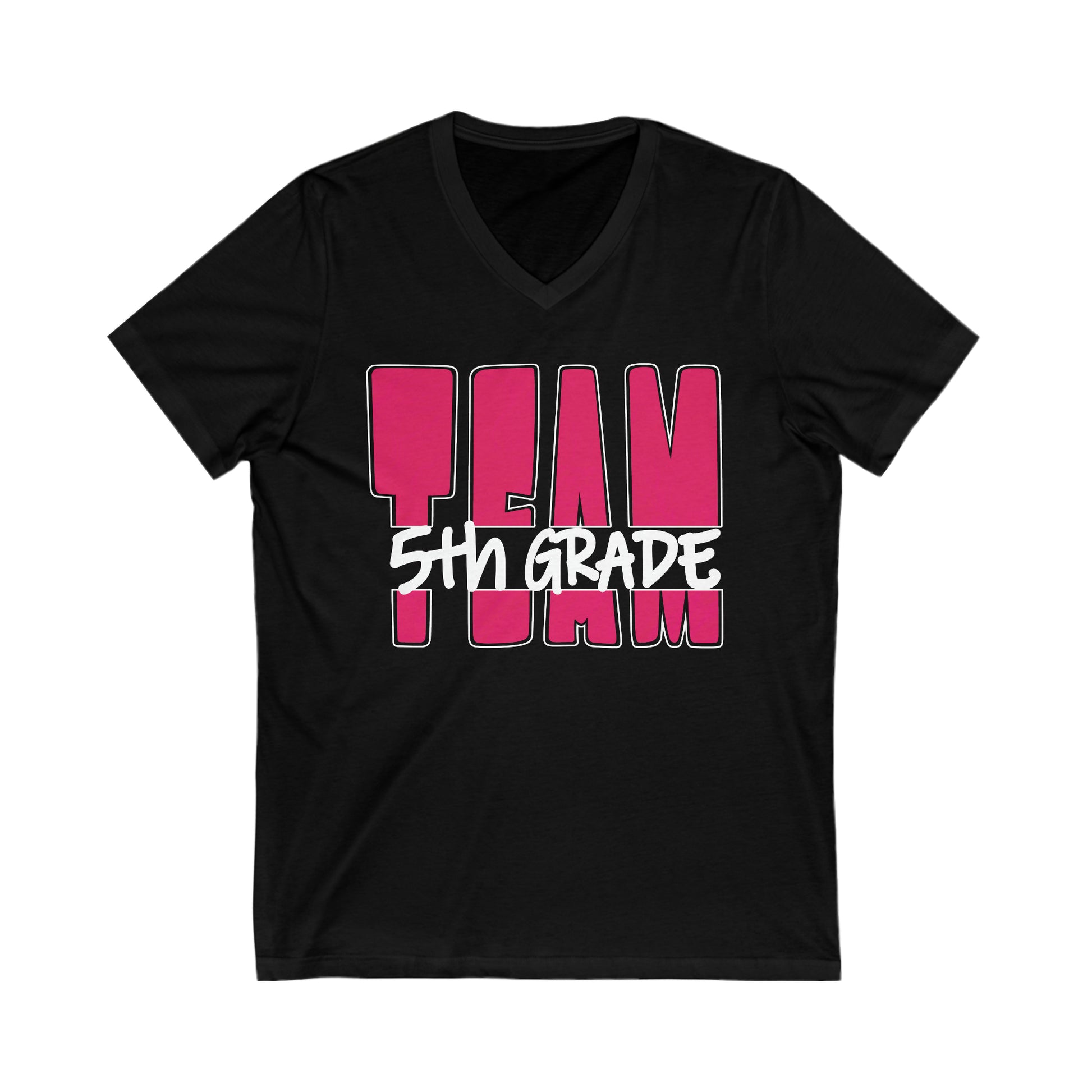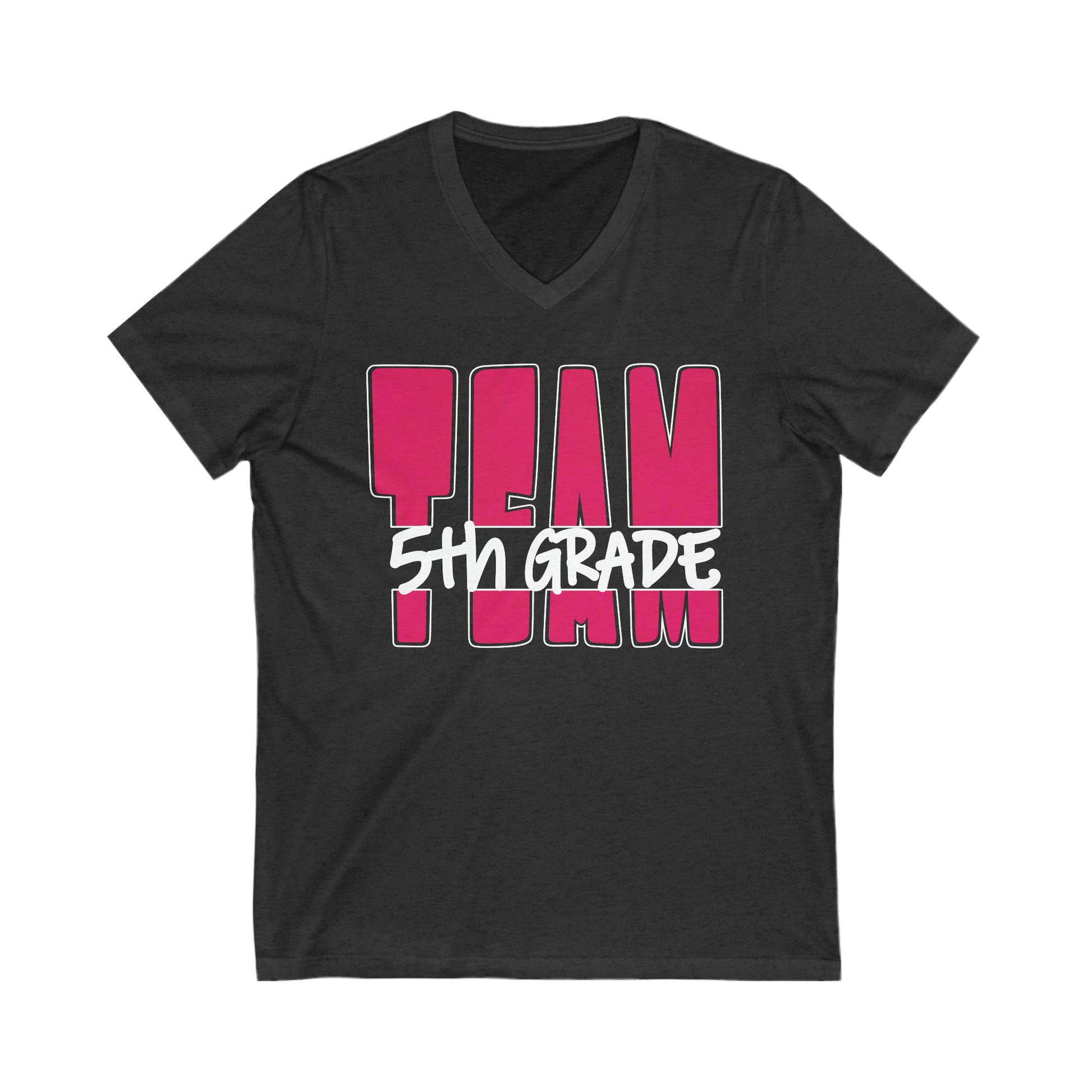 Way to go TEAM! You will stand out as you stand together in this bold raspberry with white outline TEAM T-shirt announcing you are with the 5th grade team! This lightweight jersey knit top is a go-to choice for meetings, events, field trips, or to show your school spirit! Available on Black or Deep Heather Grey, this unisex sized Tee will keep you comfortable all day long.