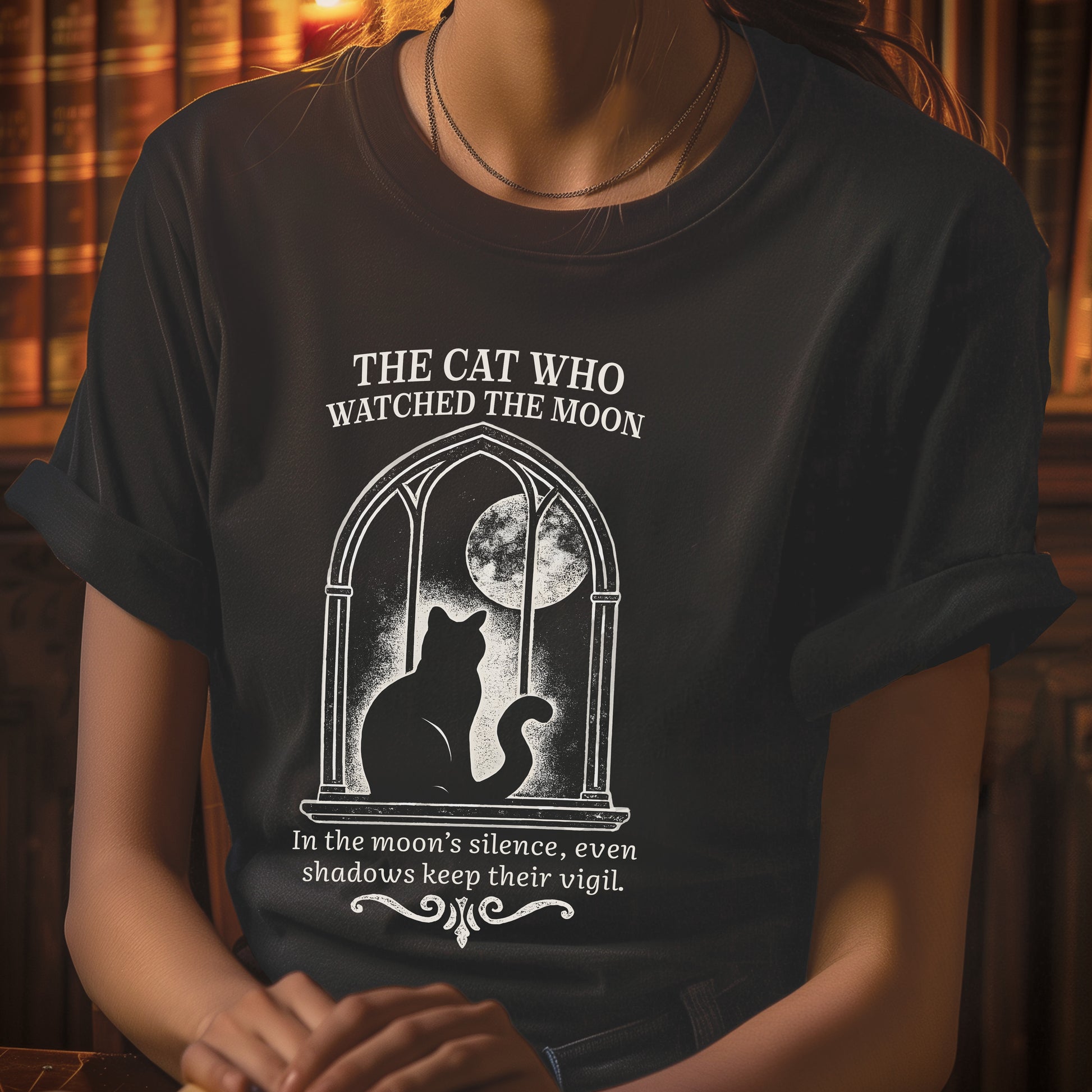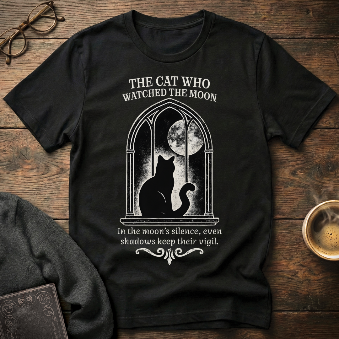 "The Cat Who Watched the Moon" This feels like the lost cover of a melancholy Victorian novella — a quiet scene framed in shadow, longing, and beautiful stillness. Through a Gothic window, a lone cat gazes toward a glowing moon, as though listening to a story only the night can tell. This shirt is for readers who keep vigil with their books, their candle, and the soft ache of moonlit imagination.
