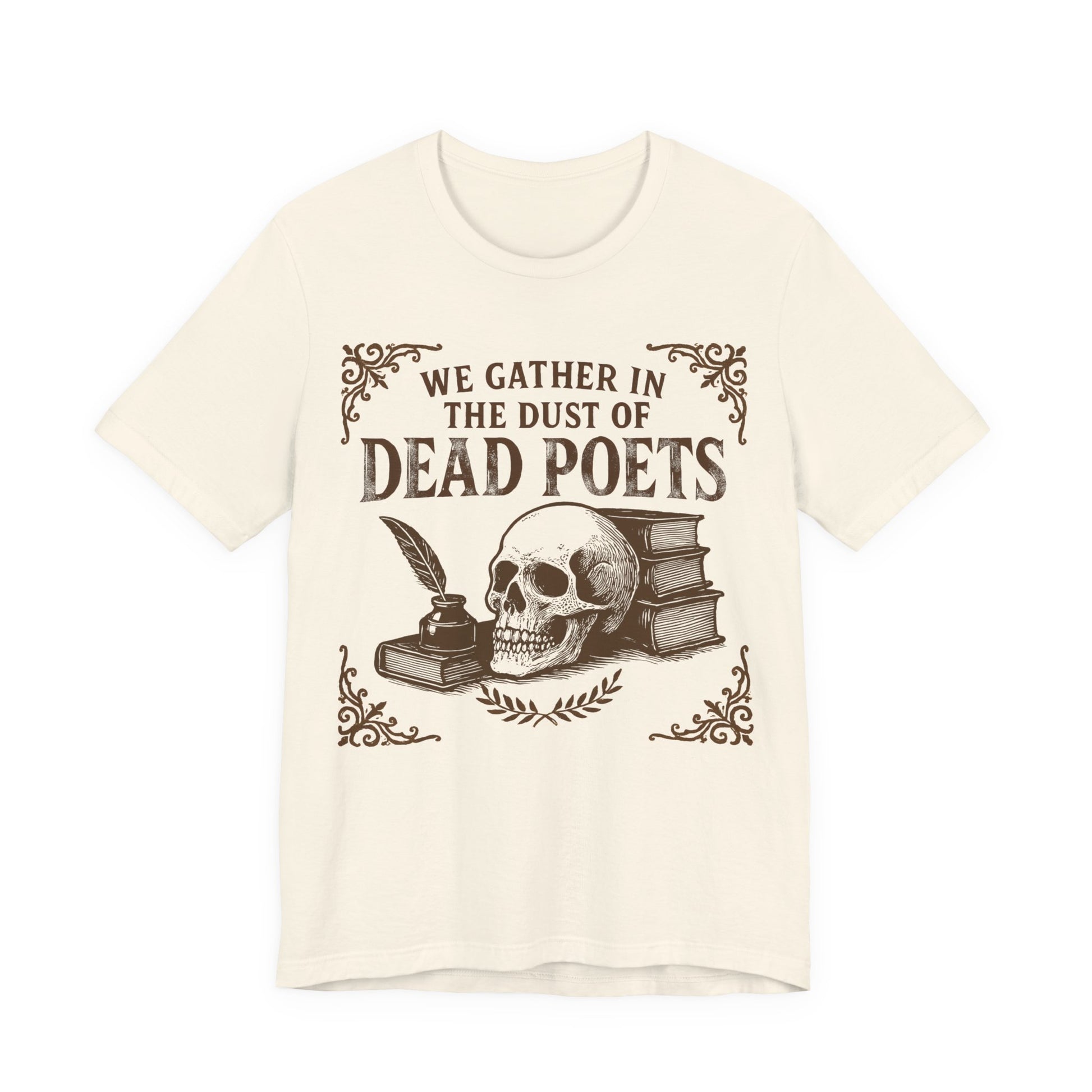 "We Gather in the Dust of Dead Poets" - A solemn, reverent tribute to the writers who shaped our souls. This design honors the lineage of thinkers, dreamers, and rebels whose words echo long after their voices fade. Dramatic and ceremonial, it evokes candlelit vigils in forgotten libraries. Ideal for readers who walk among ghosts of the literary greats.