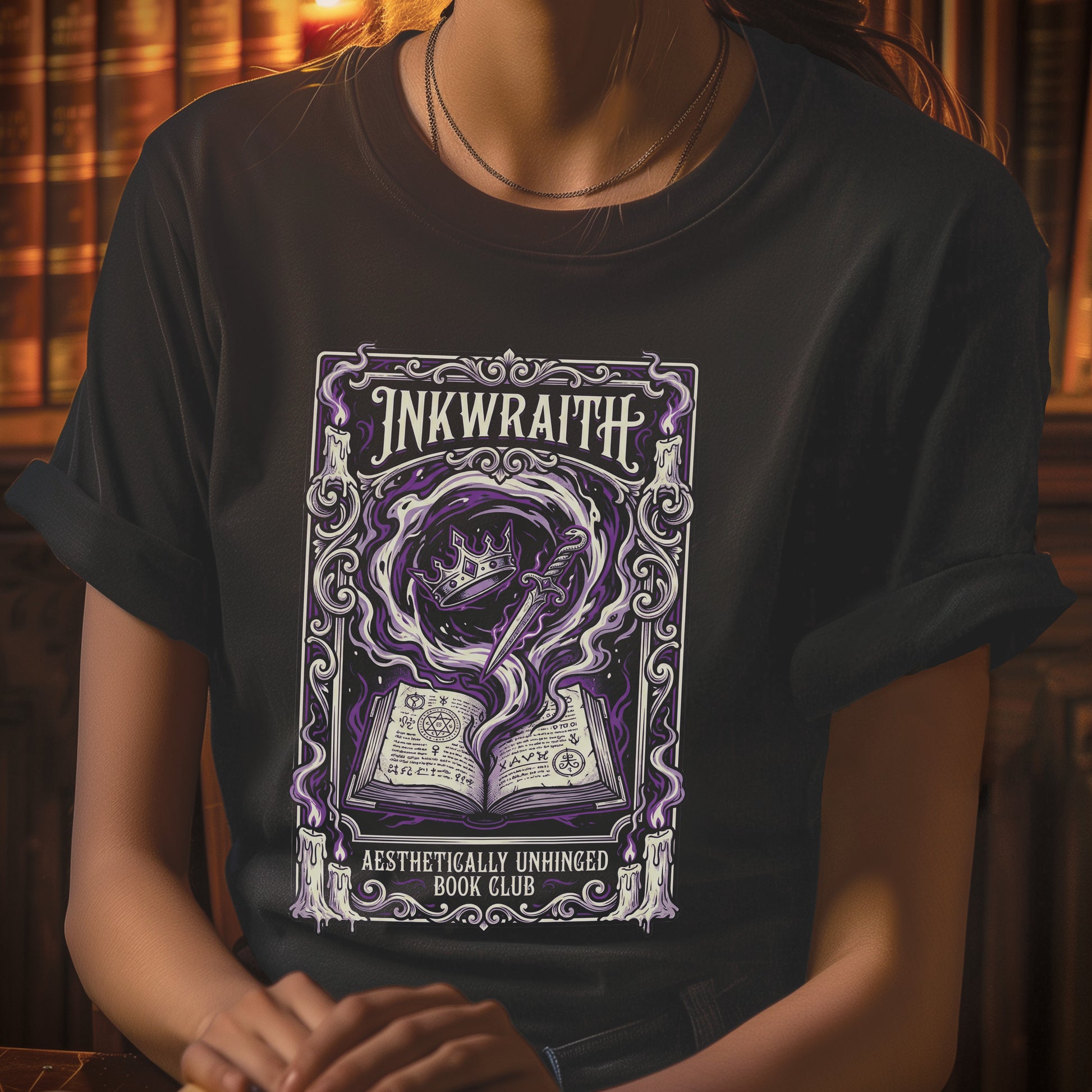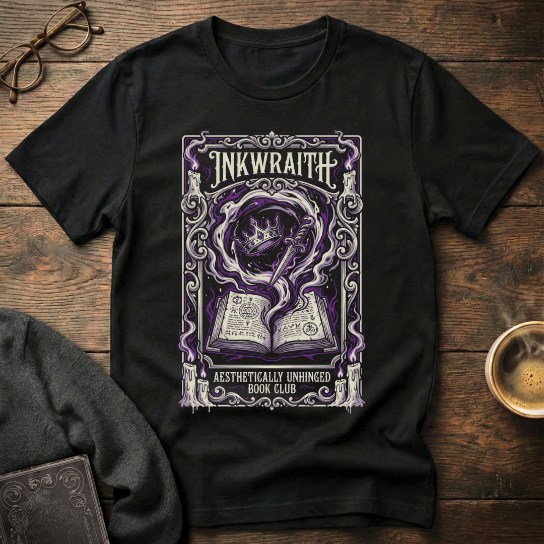 "The Ritual" An open book becomes a portal, ink swirling upward in a vortex that holds a crown and dagger suspended in impossible space. Heavy gothic scrollwork and melting candles frame the card like an invitation to something forbidden, something that changes you. InkWraith Aesthetically Unhinged Book Club—where reading isn't passive consumption but active summoning. Mystical, occult-inspired design for the Romantasy readers who don't just finish books, they let books finish them. Esoteric typography meets portal magic in a vertical ritual card that acknowledges the truth: some stories are doorways. Printed in bone white and deep amethyst purple on black and natural fabric.