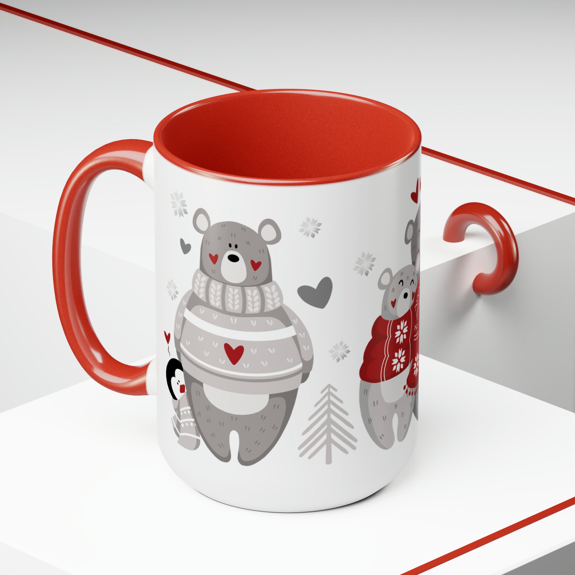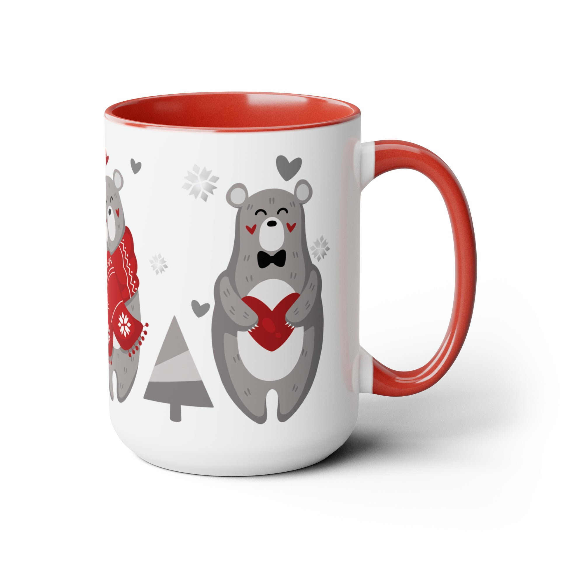 Here to bring big gulps of coffee and style, this oversized two-tone coffee mug will help you start the day just right. There's plenty of room in the generous 15oz mug for your coffee and creamer or hot cocoa with whipped cream and the works! The Three Cute Bears in winter sweaters with hearts and snowflakes dance around this mug. Imagine waking up to this cheerful mug! Your mug features a red handle, a red interior, a wrap-around design, and a classy, glossy finish! This will soon become your favorite mug in the cupboard! Bundle this item with the matching blanket, journal, and tote bag for the perfect gift!
