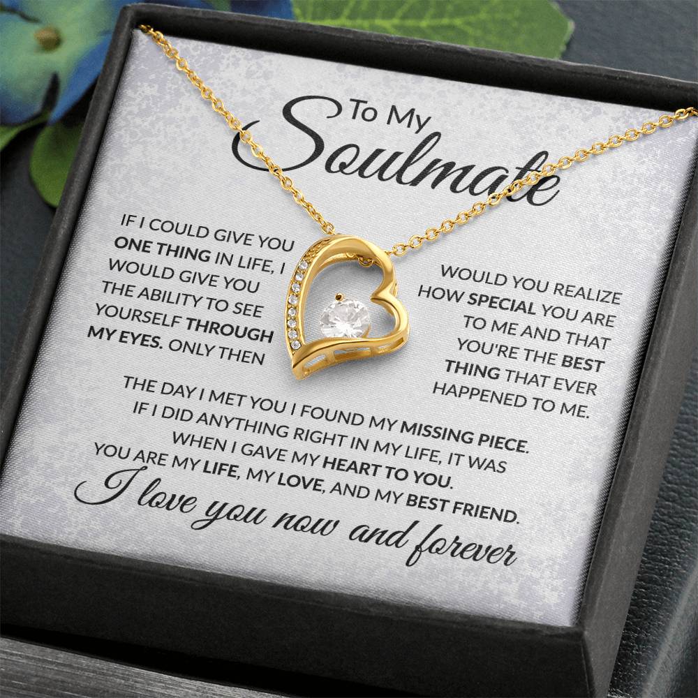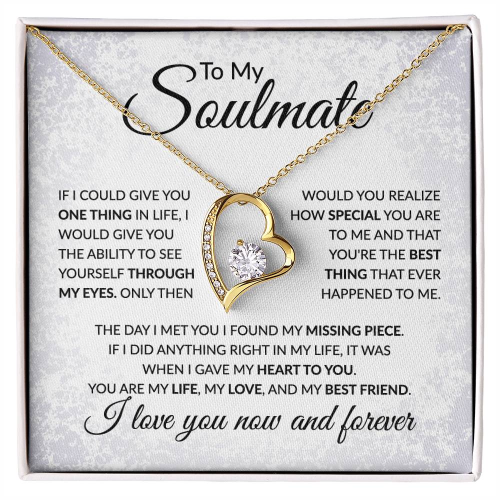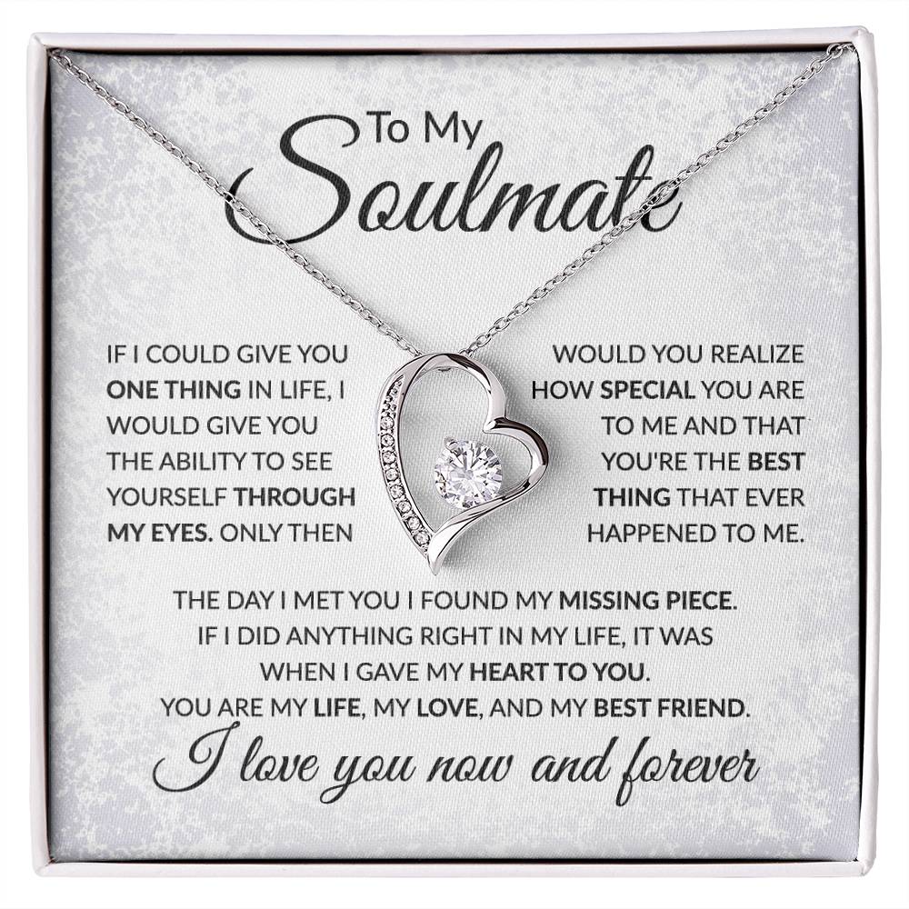 The printed message card included in the box reads: To My Soulmate, If I could give you one thing in life, I would give you the ability to see yourself through my eyes. Only then would you realize how special you are to me and that you're the best thing that ever happened to me. The day I met you I found my missing piece. If I did anything right in my life, it was when I gave my heart to you. You are my life, my love, and my best friend. I love you now and forever.